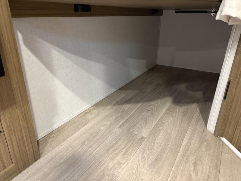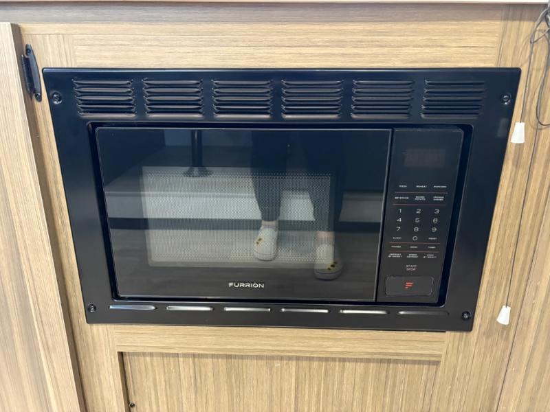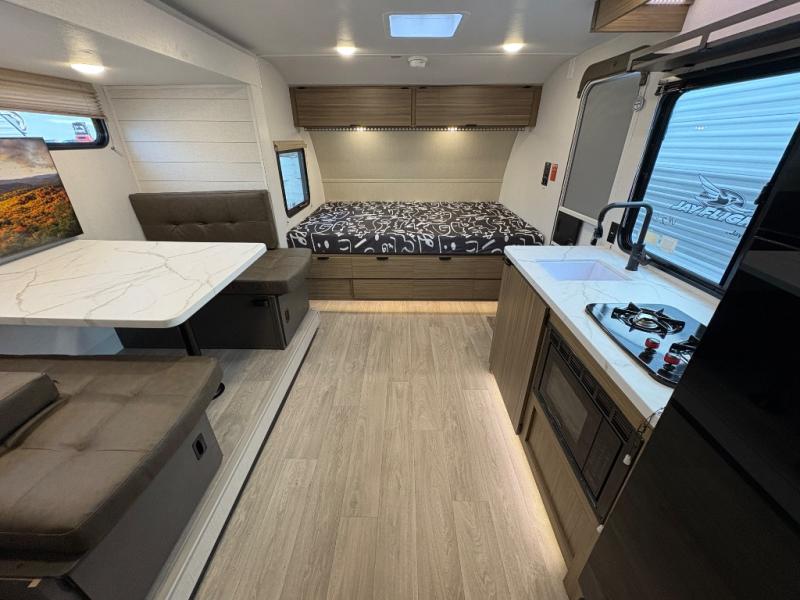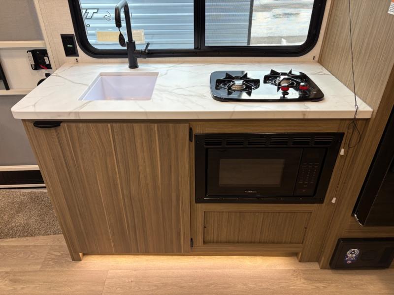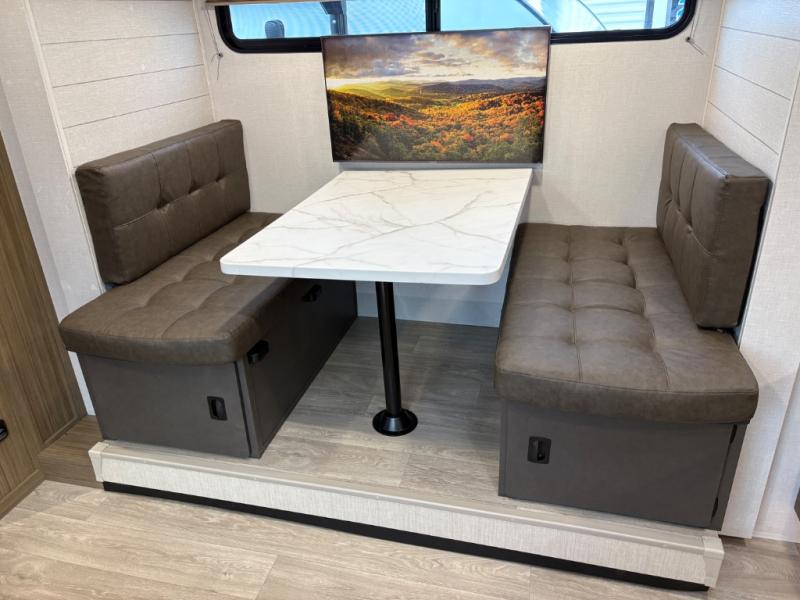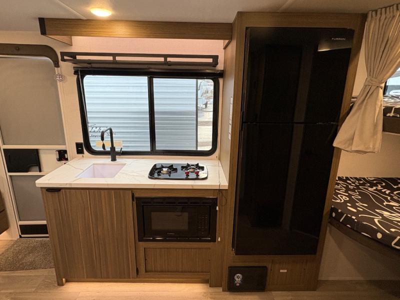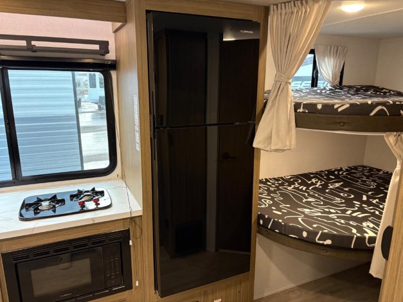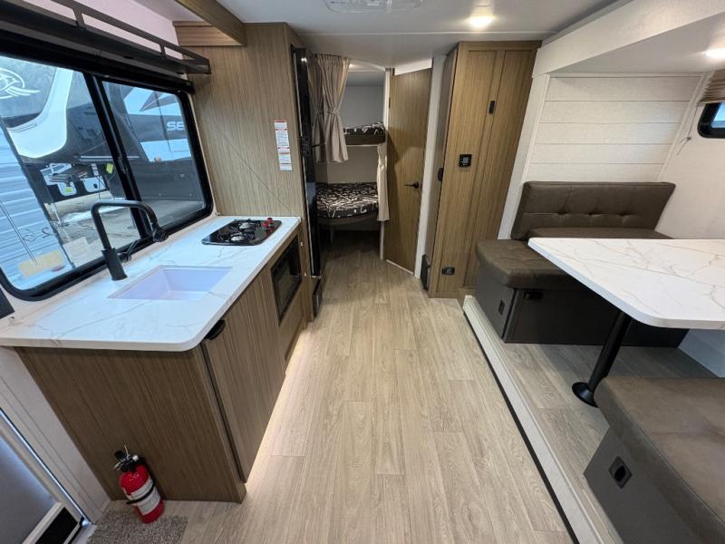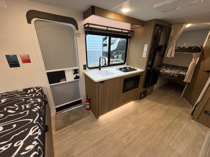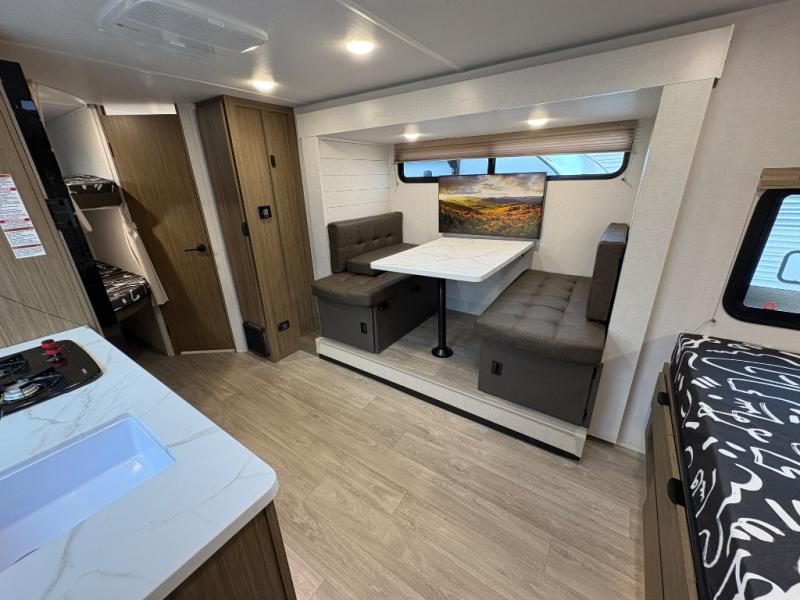 It will be so easy to enjoy time spent in this travel trailer for seven. The front queen bed provides a great night's rest, and there is an overhead cabinet to keep your things organized. Your guests or little ones can claim the double-size bunks for themselves, and there is a full bath adjacent to the bunks for easy nighttime use. A two-burner cooktop in the kitchen will let you make meals for your crew, and a refrigerator keeps leftovers fresh. You can dine at the booth dinette within the slide out or take your plate outdoors to sit under the 15' power awning.