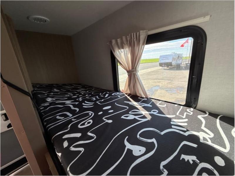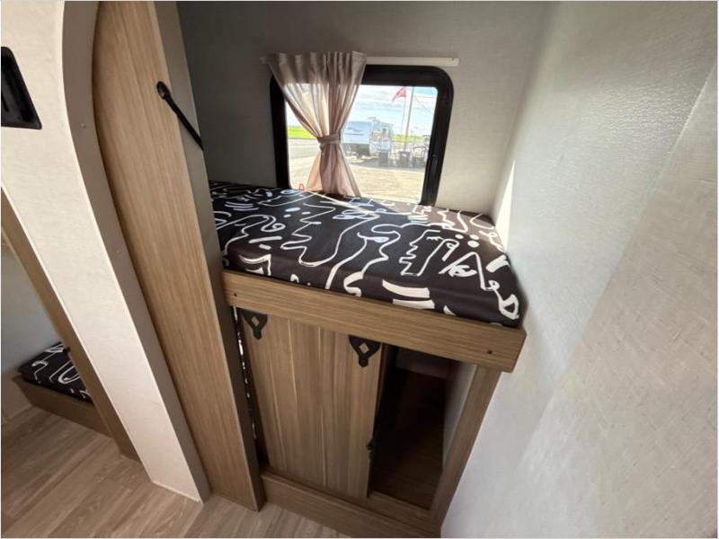 Your guest or little ones will love the bunk beds on this model since each bunk includes a private door which can be shut for privacy! You'll find the front 60" x 72" platform bed to be cozy and convenient since there are overhead cabinets and a closet for your things. Once you've made lunch on the two-burner cooktop, you can dine at the booth dinette slide out. There is also a 12V refrigerator here and shelves for more storage!