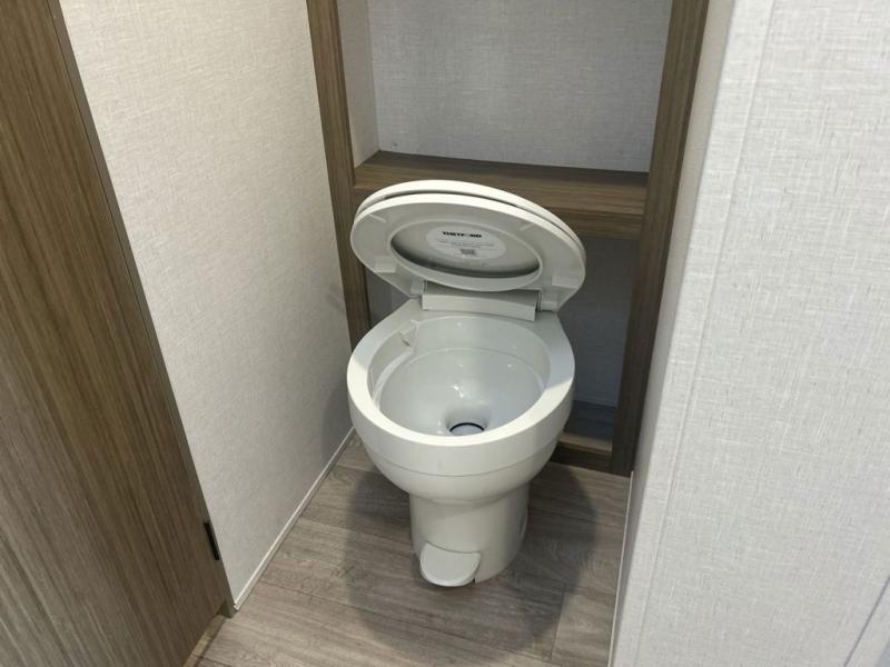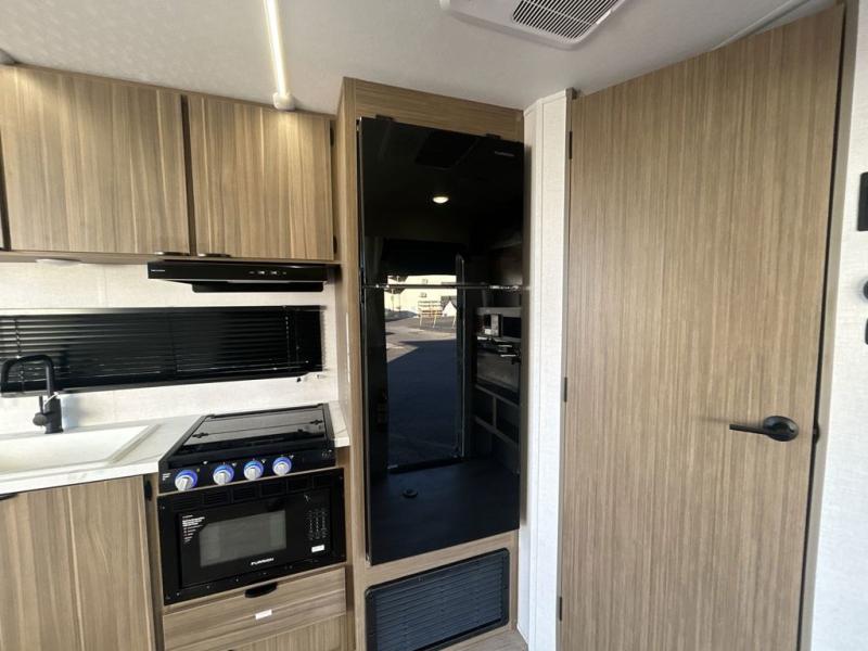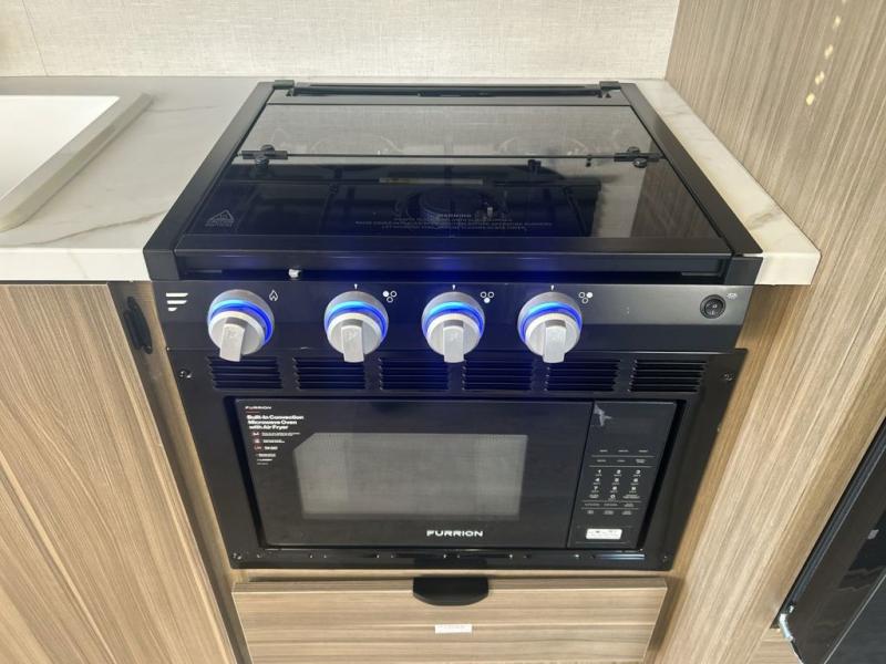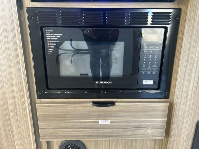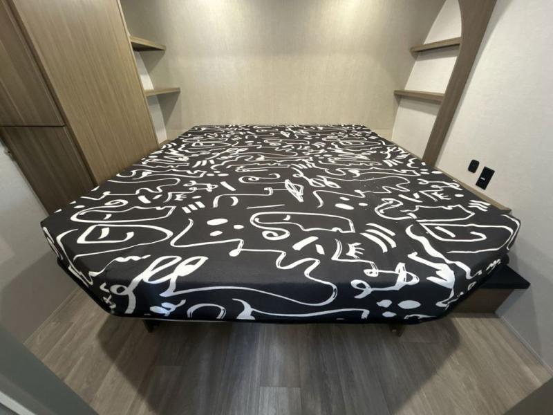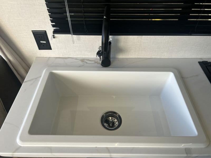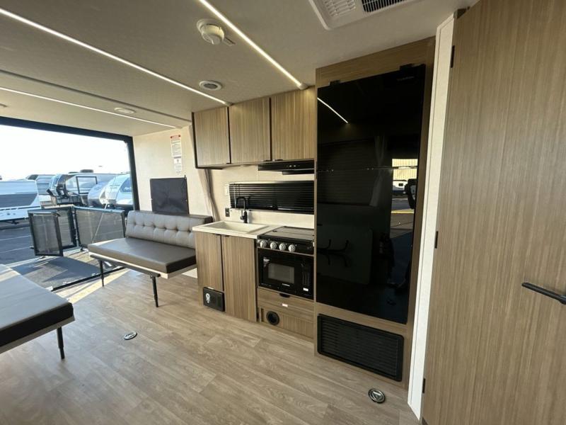 You will feel right at home in this toy hauler! The front private bedroom has a custom king bed to lay your head on at night with wardrobes on either side of it for your clothes. You even have access to the walk-through bathroom which has a neo-angled shower. Prepare your best home cooked meals with the 3-in-1 cooker with a convection oven and three burner cooktop, enjoy them at the opposing 30" x 72" sofa sleepers with a table in between, and store any leftovers in the 12V refrigerator. The 90" x 75", ramp door doubles as a party patio with a 1,500 lb. max weight capacity so you can invite your neighboring campers to join in on the fun!