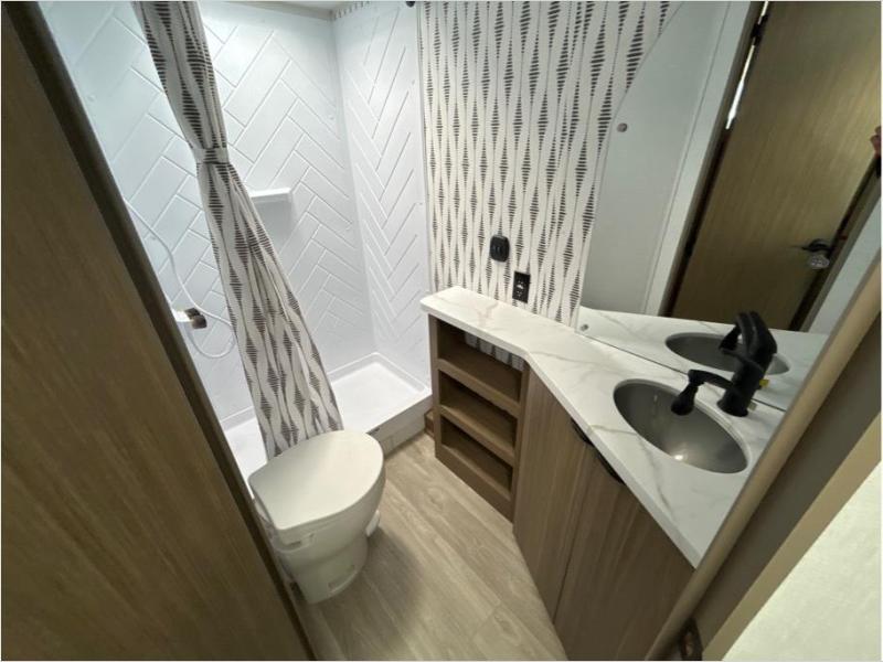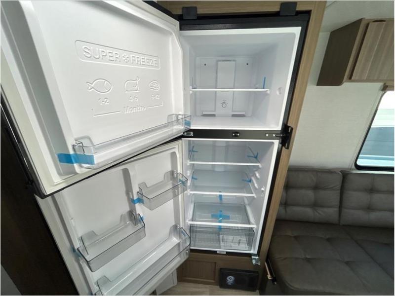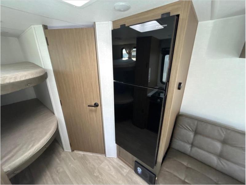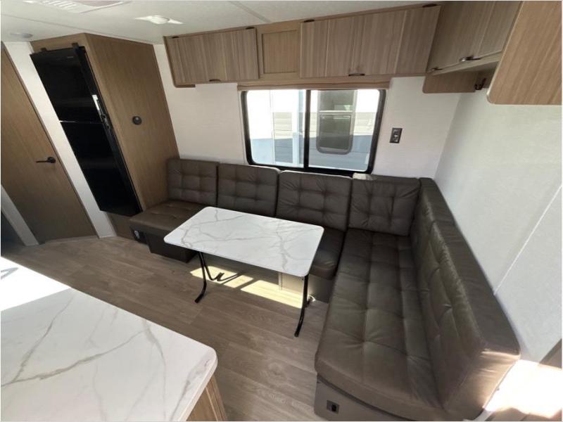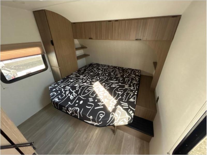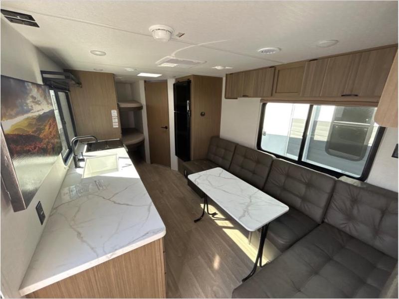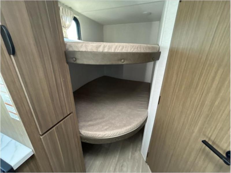 Camping is made easy in this travel trailer with more sleeping space and lots of comforts! The kids or your guests will enjoy the double-size bunks in the back, along with the full bath close by for easy nighttime use. You'll have the front private bedroom with a custom king bed all to yourselves, and there are dual bedroom wardrobes to keep your space neat and clean. Everyone can meet in the combined kitchen and living room to relax on the super U-lounge with a removable table while the chef of your group makes breakfast on the two-burner cooktop. There is also a microwave oven for quick meals, plus a pantry and refrigerator for food storage!