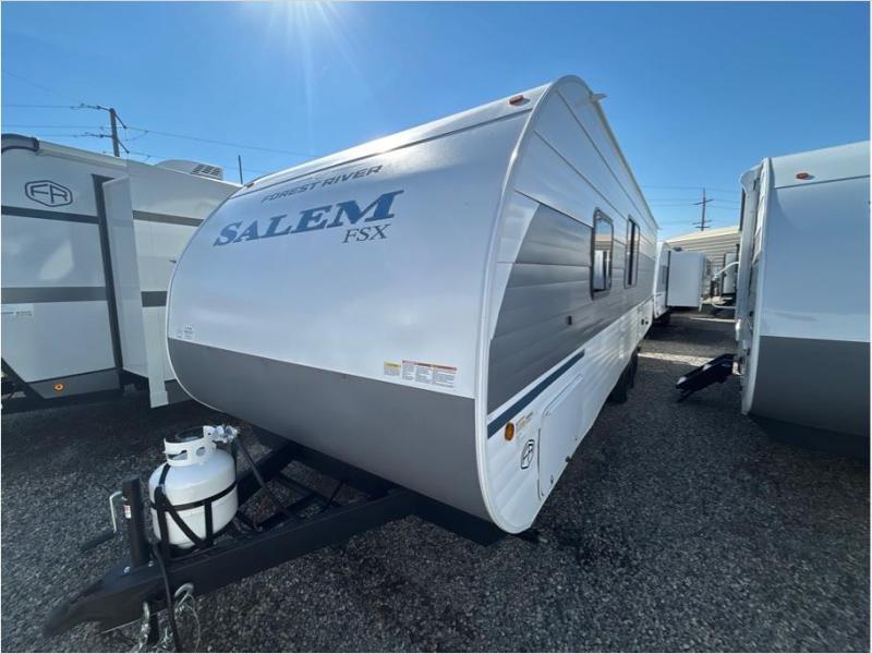 The Forest River Salem FSX travel trailers and toy hauler travel trailers are ultra comfortable and lightweight, perfect for first time or seasoned campers alike! You will love how easy it will be to relax with residential features that will make your space feel just like home, and the durable construction means you can enjoy your RV for years to come. There are a wide variety of floorplans to choose from, including couple's trailers, bunk models, and toy haulers, all with full bath and kitchen amenities and plenty of storage for all your gear!