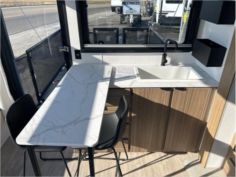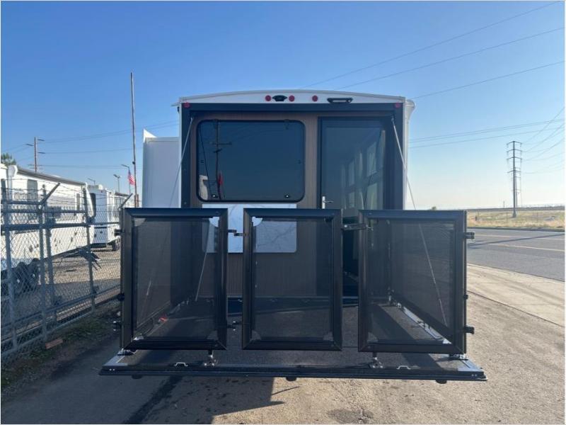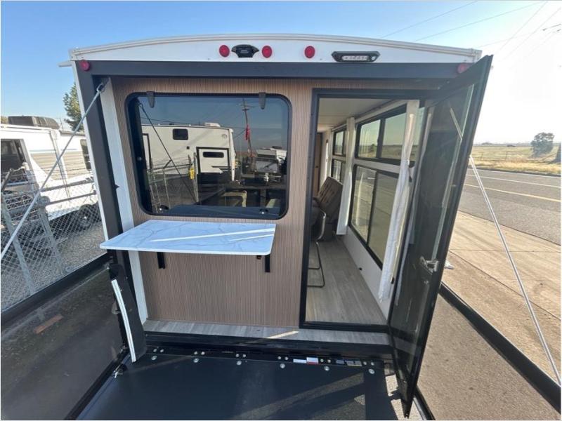 This versatile cargo trailer is one to remember! There is a ramp door that converts to a patio, a large slide out for more interior space, plus a front private bedroom just like at home. Your crew can relax on the super lounge across from the entertainment center or head outdoors to visit under the awning. The chef of your group will love cooking in the kitchen with ample counter space, including a bar top with two stools. There is also a kitchen bar window that will allow the cook to visit with those sitting on the patio, and if you need to bring bicycles along, you can easily load them in through the ramp door!