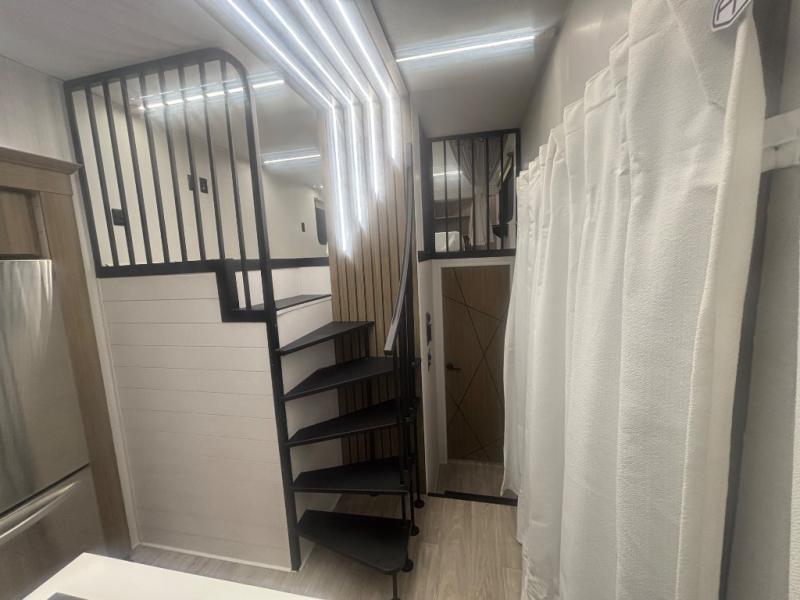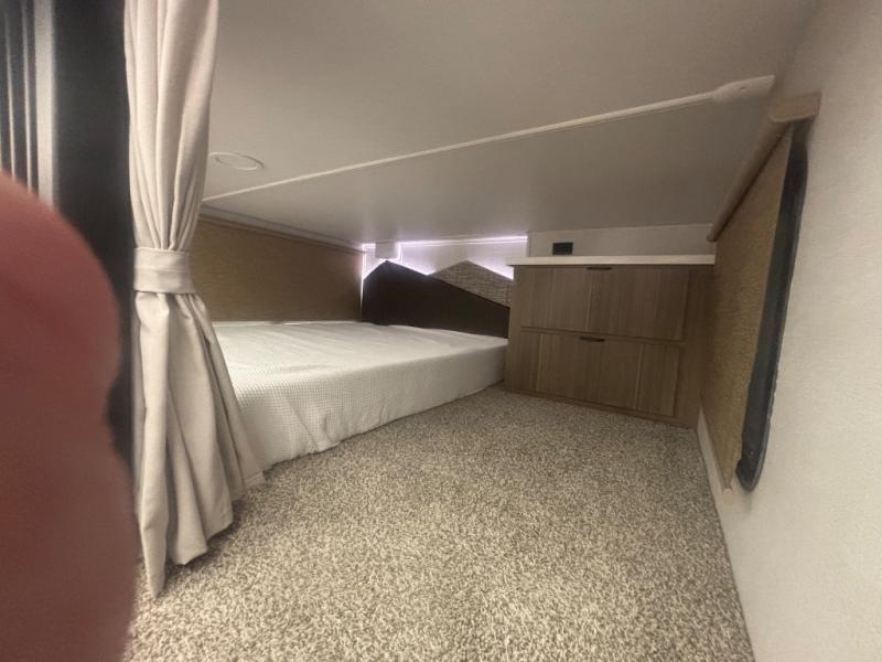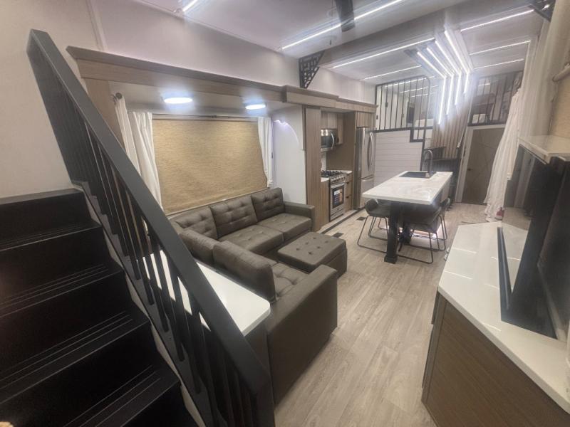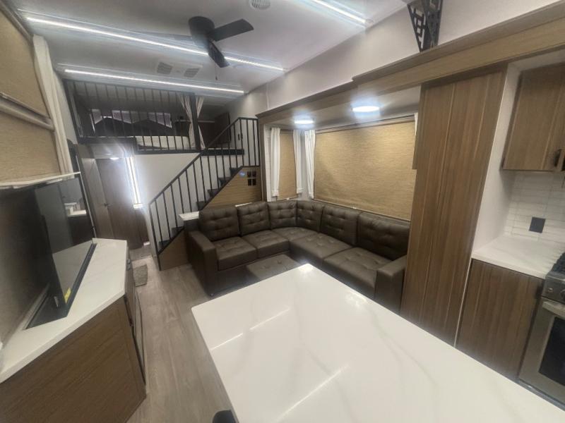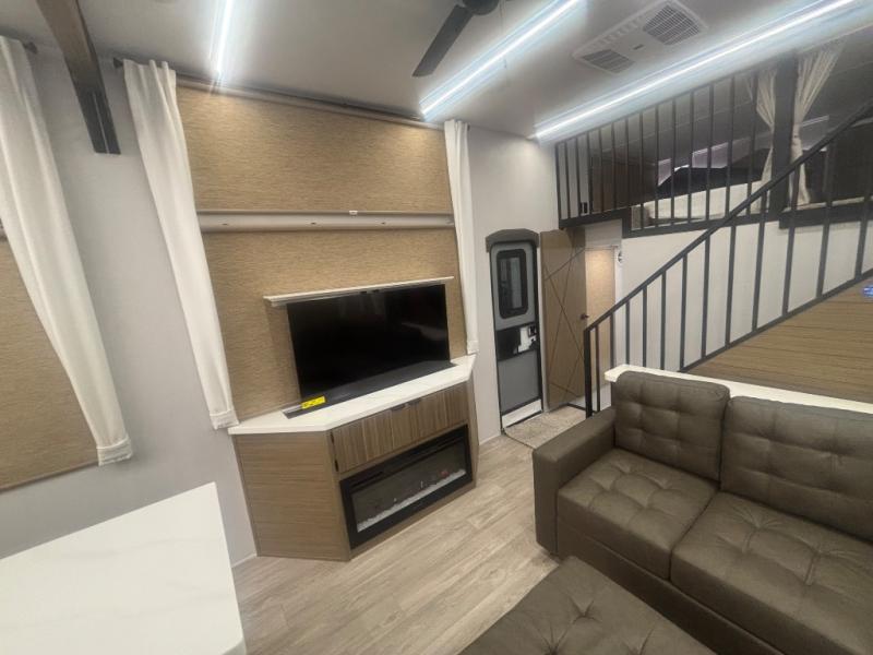 This thoughtfully designed 42ZEN model provides a blend of comfort and functionality. It features two lofts for added sleeping and living space, one includes a 62" x 74" Versa queen mattress and a dresser for storing clothes and essentials, while the second loft offers another Versa queen bed, plus a table with recessed footing, perfect for getting work or study done on the road. There is also a cabinet and shelf to keep everything organized. On the main floor, you'll find a large rear full bathroom, complete with a walk-in shower, linen closet, and washer/dryer prep, providing all the comforts of home. The main living area centers around a large sectional sofa with room for the whole crew, facing a fireplace and Televator TV, making it the perfect space to relax after a long day. The kitchen island also adds valuable prep space and also serves as a gathering spot with room for stools. Up front, the master bedroom features a king-size bed with Versa Tilt, a dresser, and its own private bathroom, offering convenience and privacy whenever you need it.