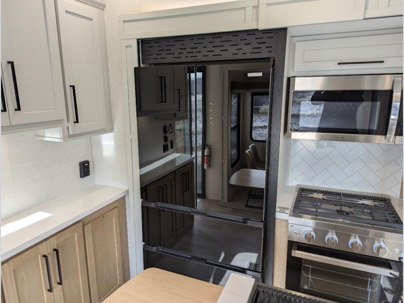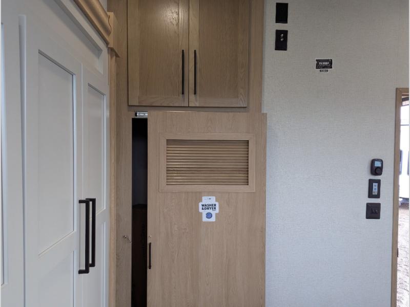 This thoughtfully designed 42ZEN model provides a blend of comfort and functionality. It features two lofts for added sleeping and living space, one includes a 62" x 74" Versa queen mattress and a dresser for storing clothes and essentials, while the second loft offers another Versa queen bed, plus a table with recessed footing, perfect for getting work or study done on the road. There is also a cabinet and shelf to keep everything organized. On the main floor, you'll find a large rear full bathroom, complete with a walk-in shower, linen closet, and washer/dryer prep, providing all the comforts of home. The main living area centers around a large sectional sofa with room for the whole crew, facing a fireplace and Televator TV, making it the perfect space to relax after a long day. The kitchen island also adds valuable prep space and also serves as a gathering spot with room for stools. Up front, the master bedroom features a king-size bed with Versa Tilt, a dresser, and its own private bathroom, offering convenience and privacy whenever you need it.