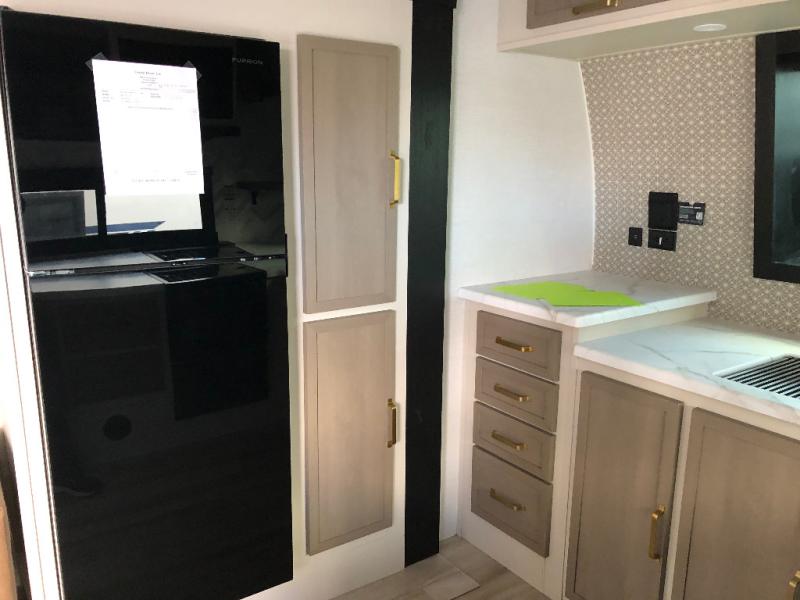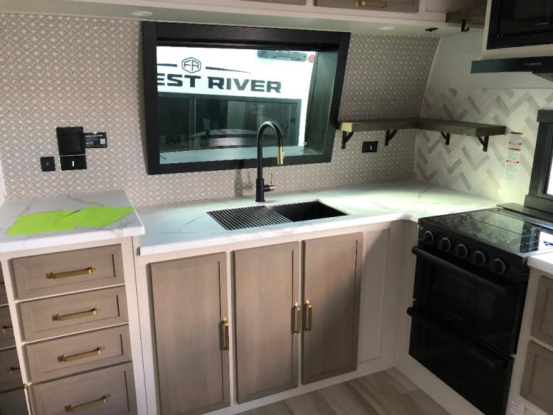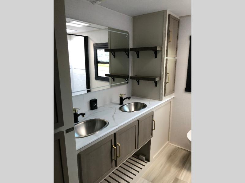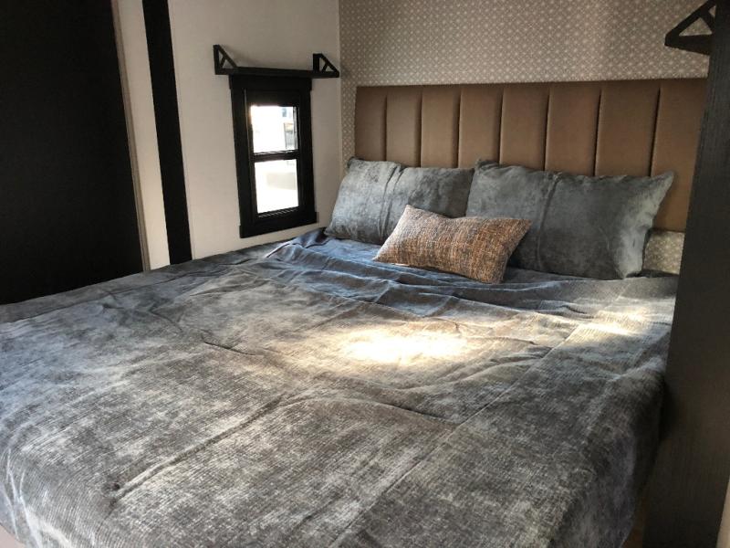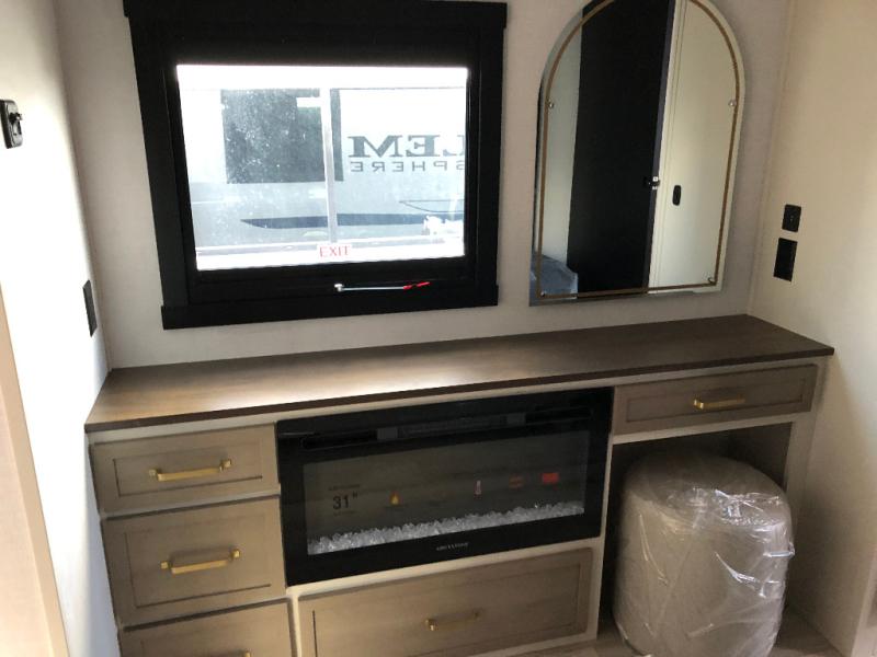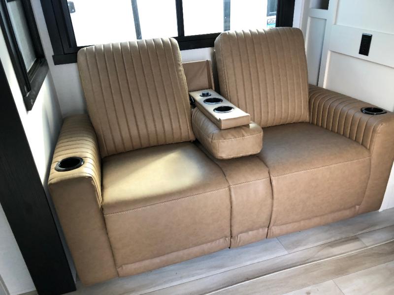 This is the perfect couple's trailer for weekend trips to the campground. The front kitchen includes ample counter space, including a bar top with two stools. You can relax on the theater seat within the slide out here, and the pantry and 12V refrigerator is close by so you can grab a snack. A master bedroom includes a custom king bed slide out, a panoramic window, an ottoman, plus a dresser with a fireplace to make your space cozy. The full rear bath includes dual bath sinks, a walk-in shower with a skylight, plus washer and dryer connections if you want to add those appliances.