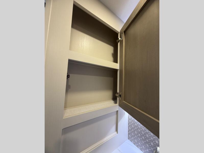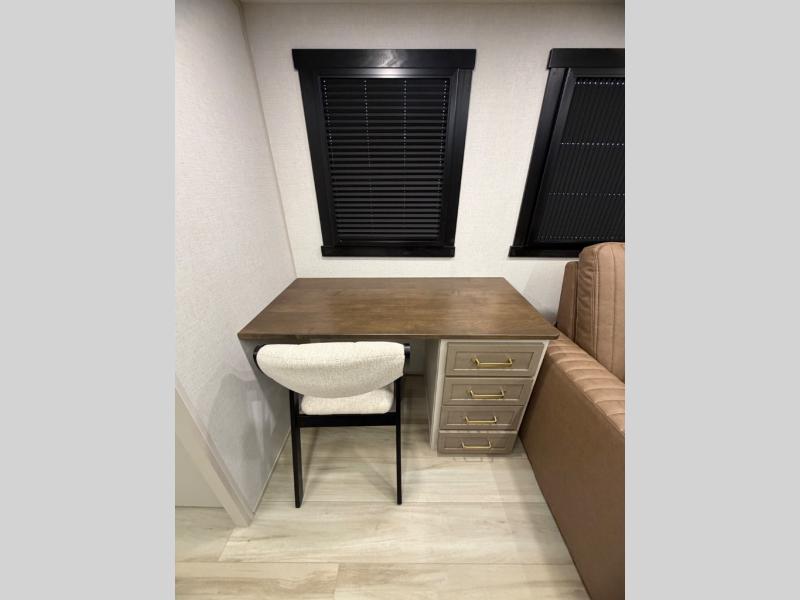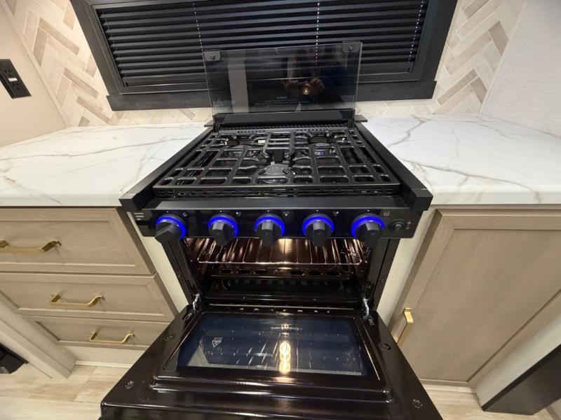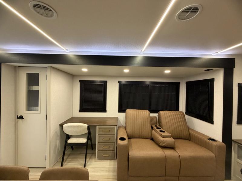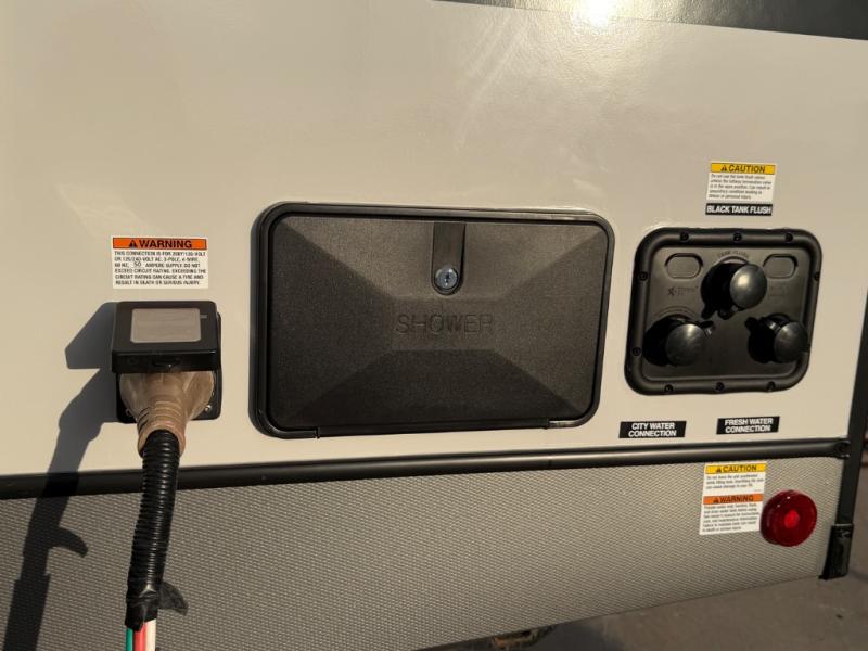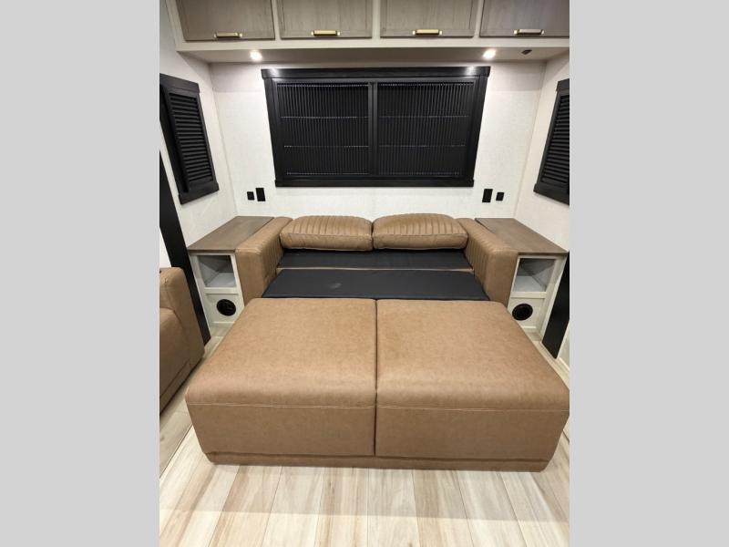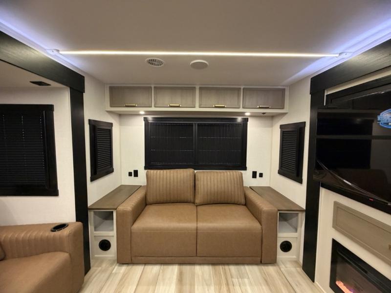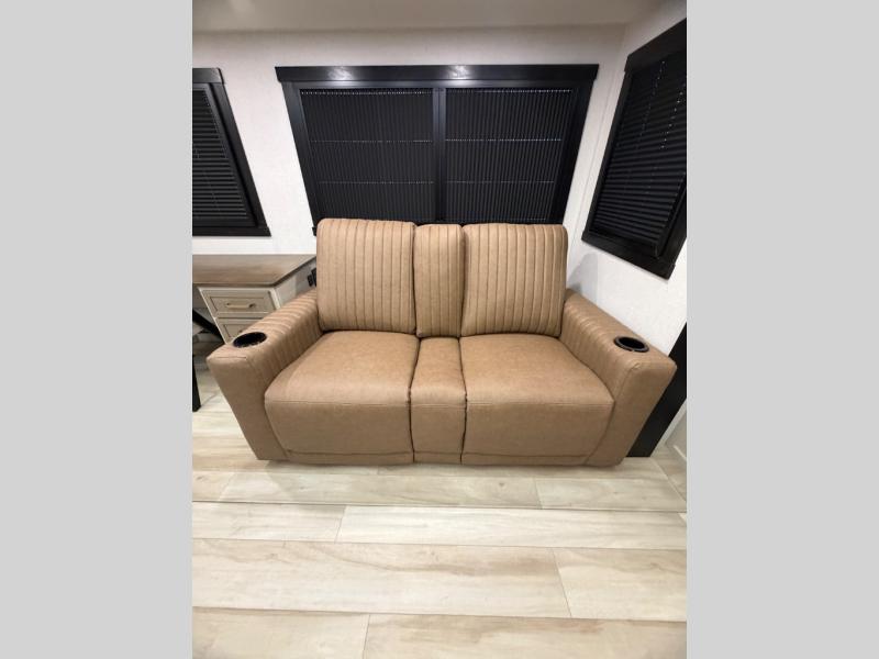 Once you step foot in this travel trailer, you won't want to camp any other way! There is plenty of entertainment and seating for everyone in the rear living area with the tri-fold sofa, the theatre seating with cupholders, and the 50" LED TV with a fireplace. There are plenty other convenient features like the hutch for your dishes, walk-in shower, and the Texas-sized exterior pass-through storage area!