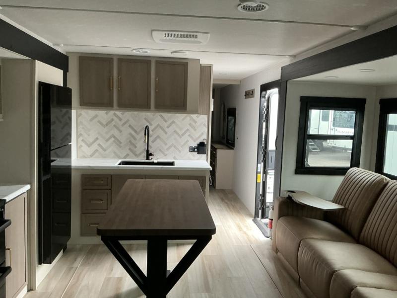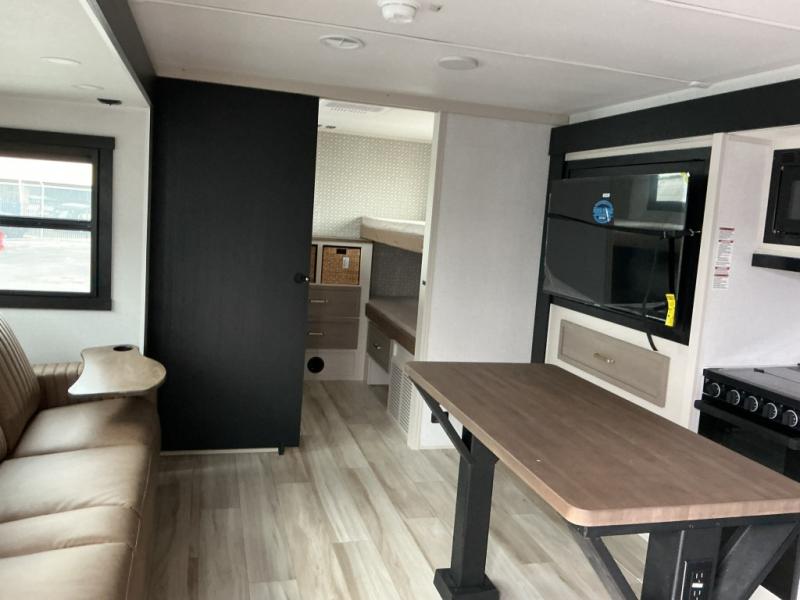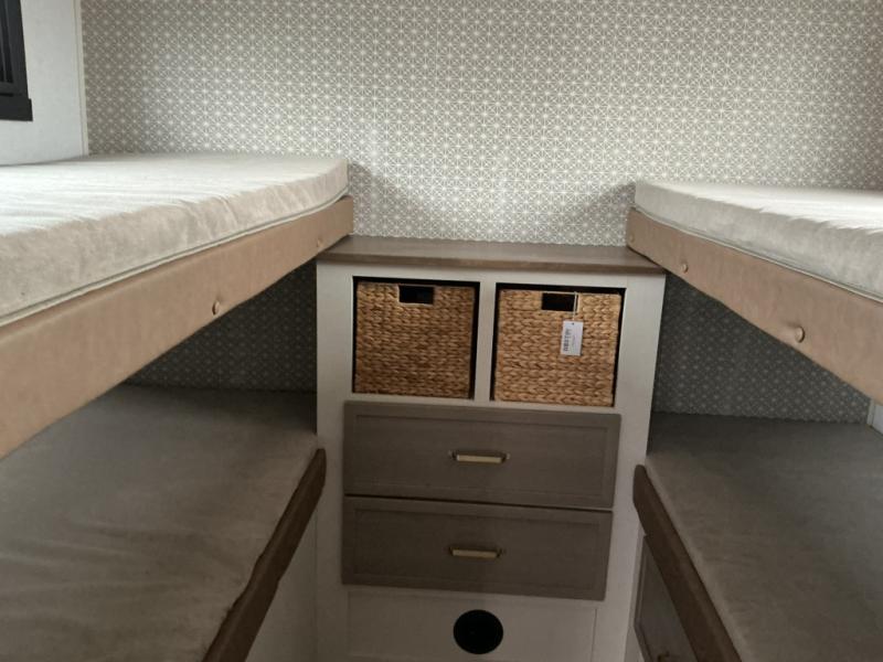 This is the perfect travel trailer if you enjoy camping with a larger group! The rear private bunkhouse includes four bunk beds plus a dresser to keep this space tidy. You'll have the queen bed slide out in the front bedroom all to yourselves, along with a dresser and an ottoman, plus a front wardrobe with washer/dryer prep. Everyone can meet in the combined kitchen and living area that includes spacious theater seating, a kitchen island with four chairs, full kitchen amenities, and dual opposing slides for more space!