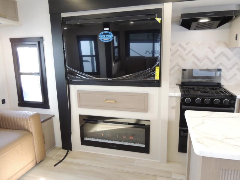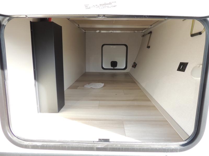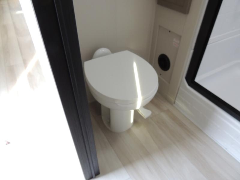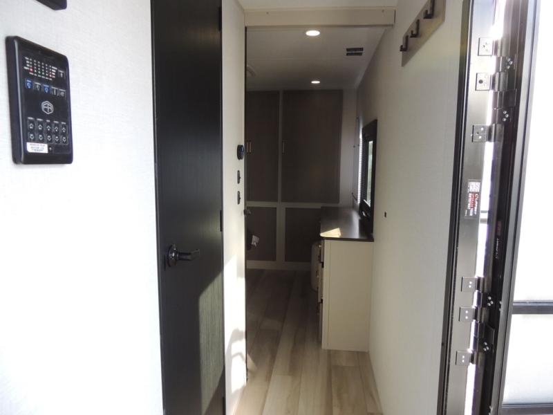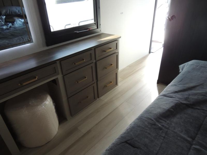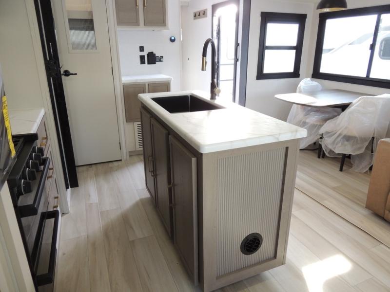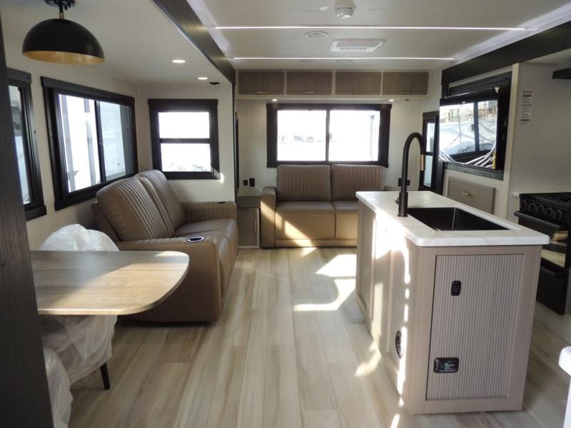 This travel trailer is decked out in features you will love like the front walk-in wardrobe with washer/dryer prep inside the front private bedroom! The full bathroom has everything you will need to get squeaky clean each morning including a residential walk-in shower with a skylight to let in some natural lighting. There is a hutch for you to store your dishes and a kitchen island to make meal prepping even easier. Once you have created a delicious meal, you can head to the booth dinette and enjoy eating it there comfortably while enjoying your view out of the panoramic window!