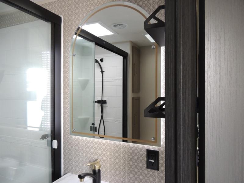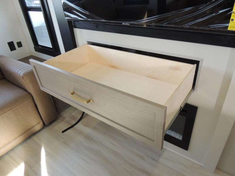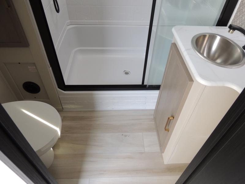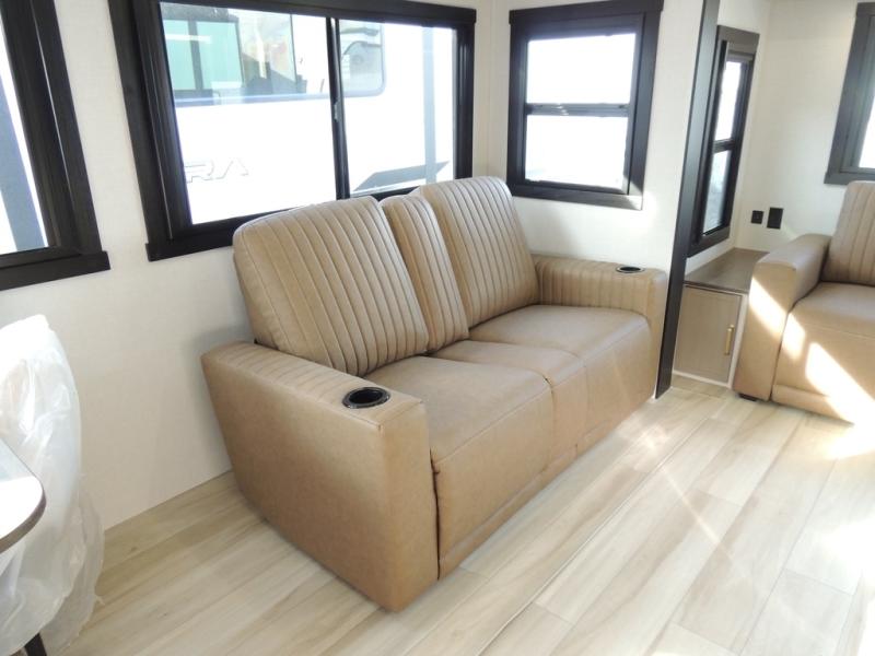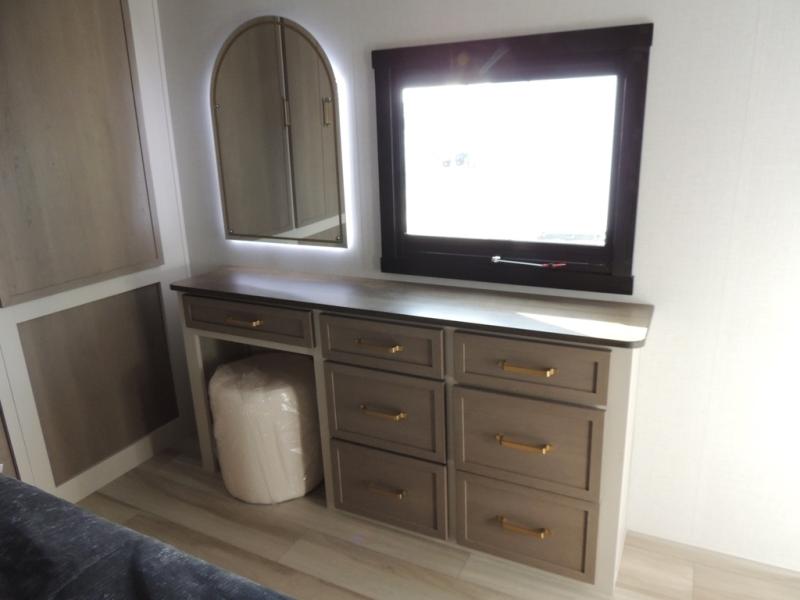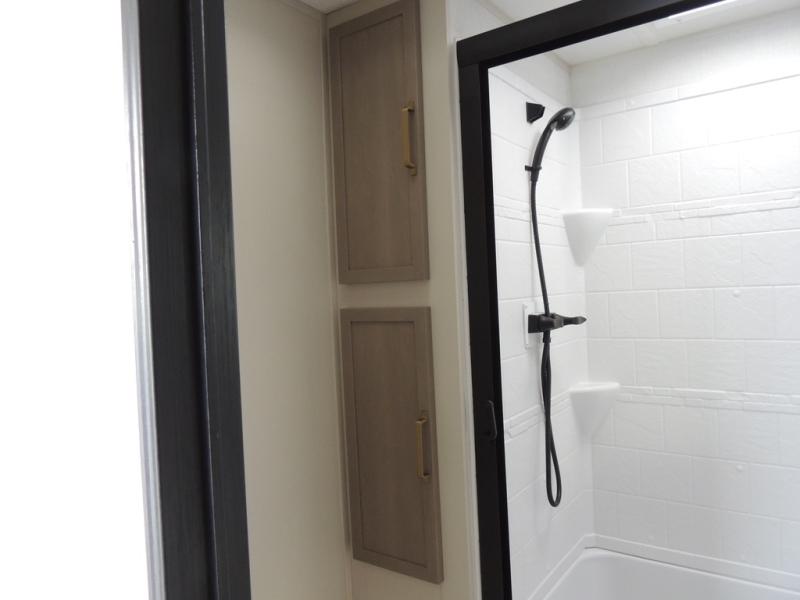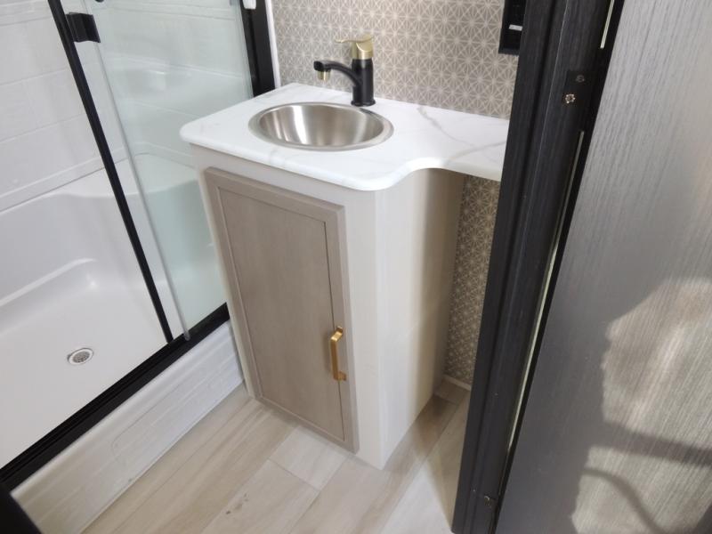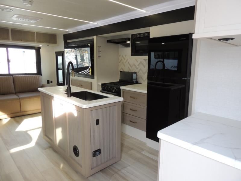 This travel trailer is decked out in features you will love like the front walk-in wardrobe with washer/dryer prep inside the front private bedroom! The full bathroom has everything you will need to get squeaky clean each morning including a residential walk-in shower with a skylight to let in some natural lighting. There is a hutch for you to store your dishes and a kitchen island to make meal prepping even easier. Once you have created a delicious meal, you can head to the booth dinette and enjoy eating it there comfortably while enjoying your view out of the panoramic window!