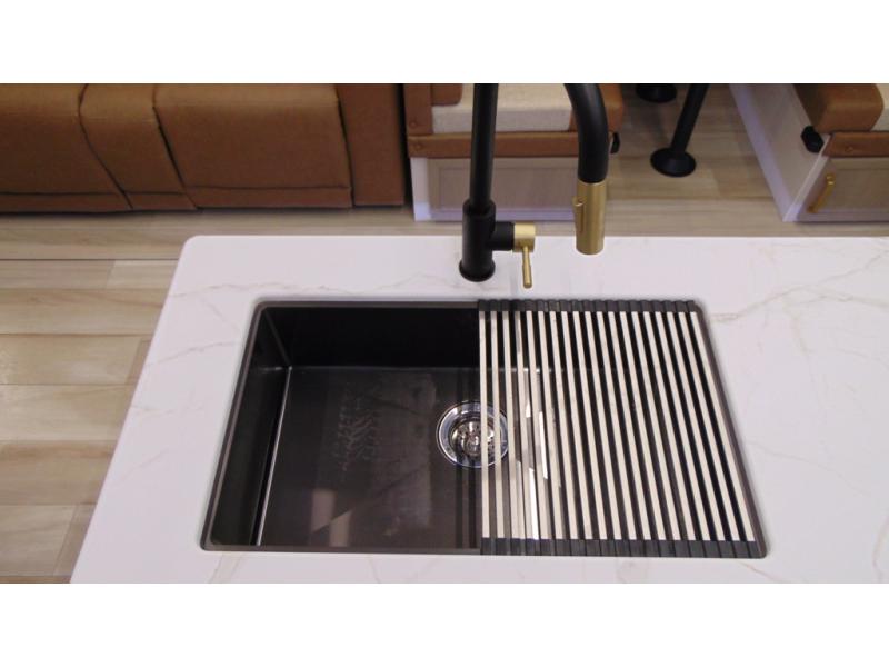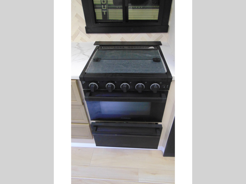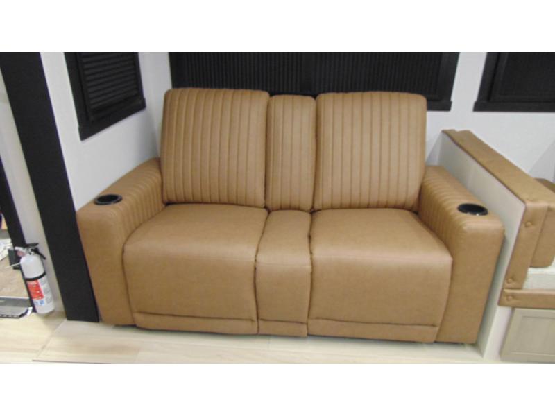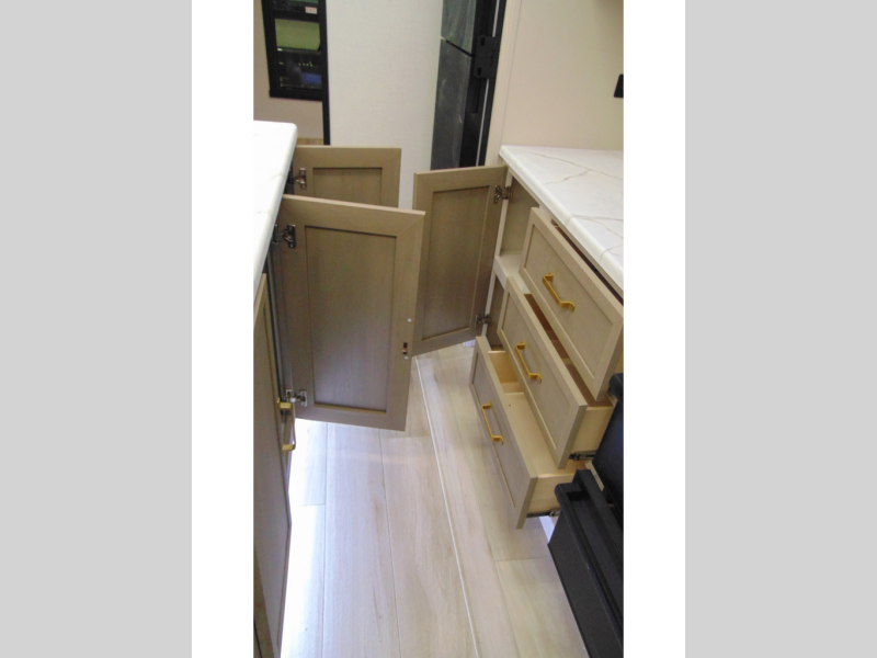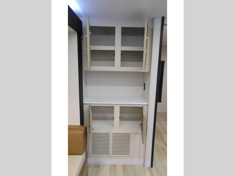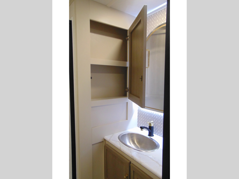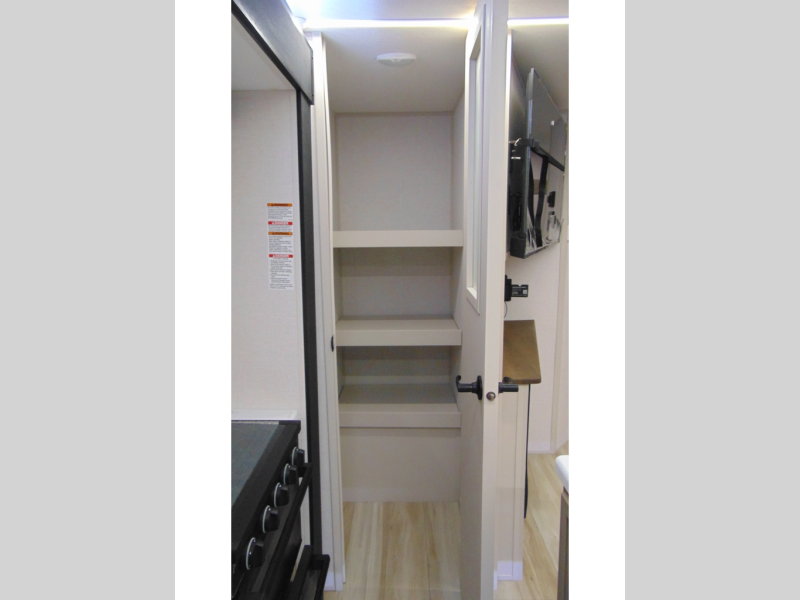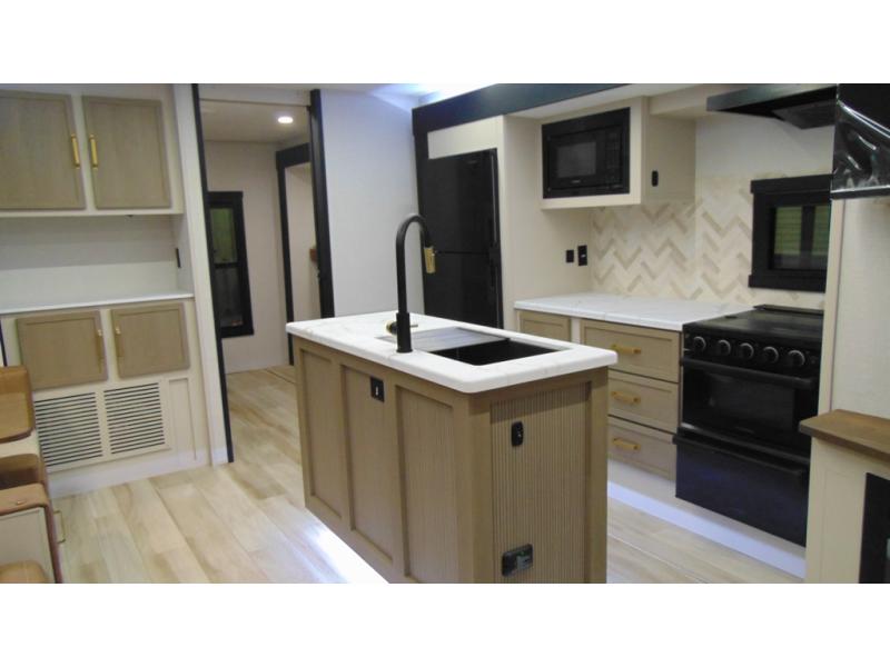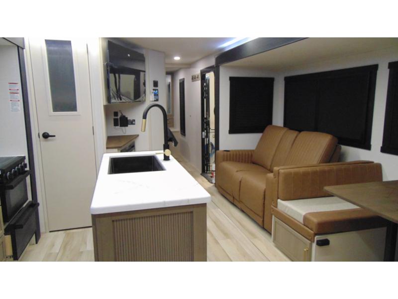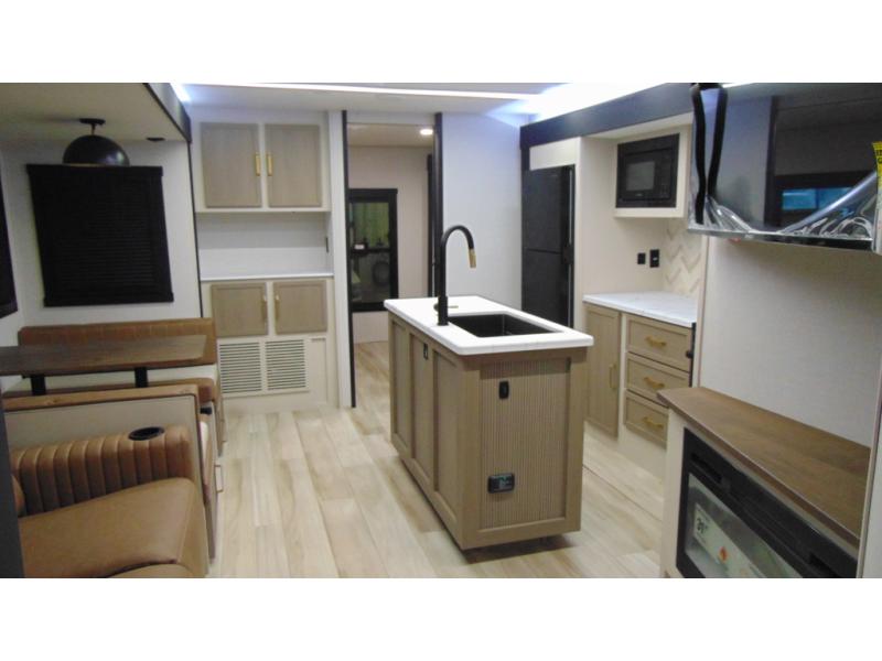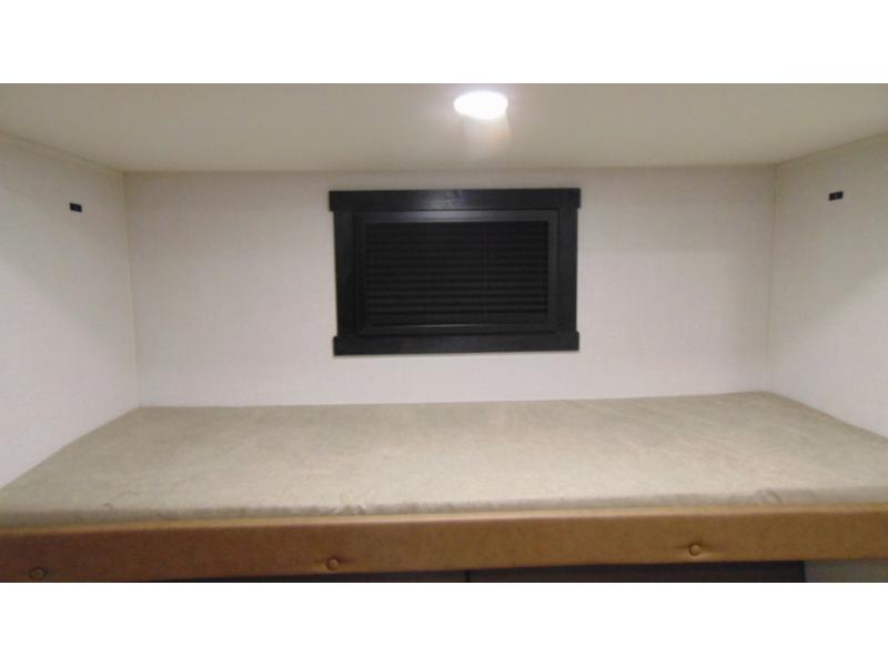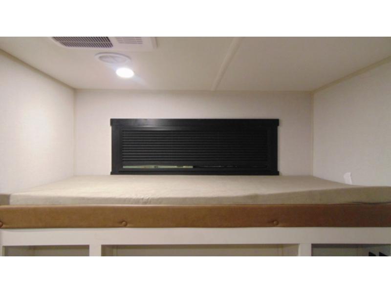 Your kids or friends are going to love camping in this travel trailer! It features a rear private bunkhouse with a bunk above a Versa queen convertible bed/sofa plus an additional bunk above an entertainment center with storage below. Just outside the bunkhouse is the kitchen with a 10 cu. ft. 12V black refrigerator, a microwave, a kitchen island, and a chef-sized walk-in pantry big enough to store everyone's favorite snacks. The booth dinette and the theatre seating are right next to panoramic windows so you can enjoy looking out at your beautiful scenery. You will also love taking a hot, steamy shower in the 30" x 36" shower with skylights and get a good night's rest on the queen bed in the front private bedroom!