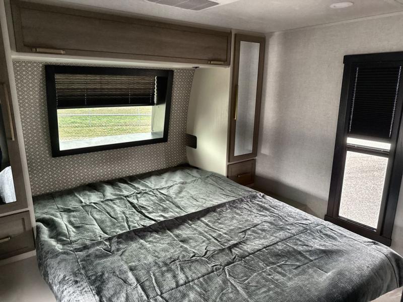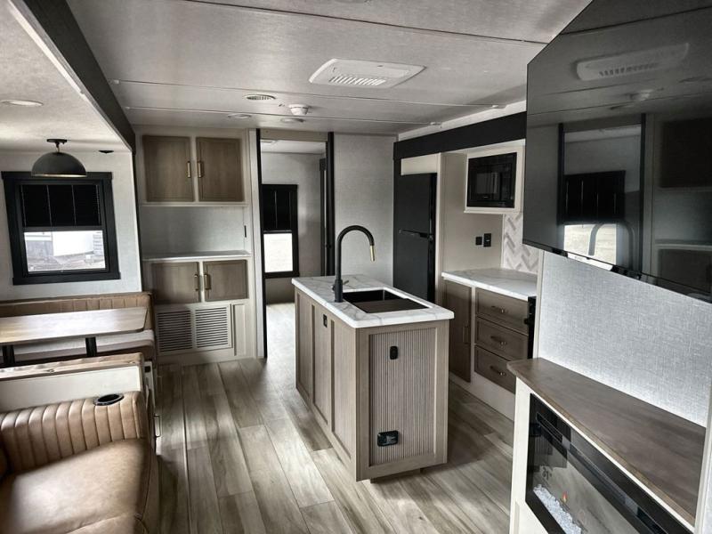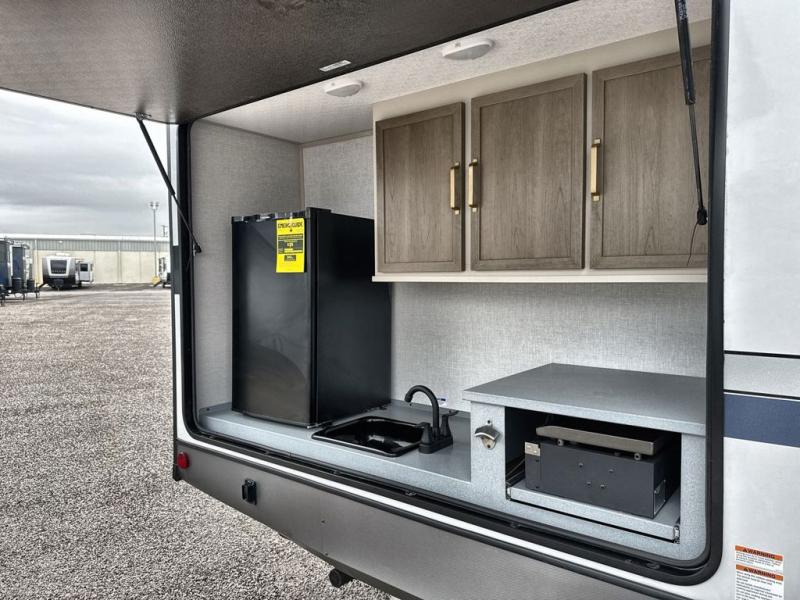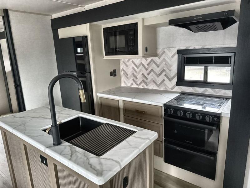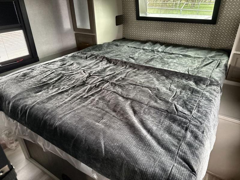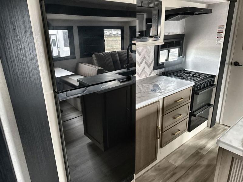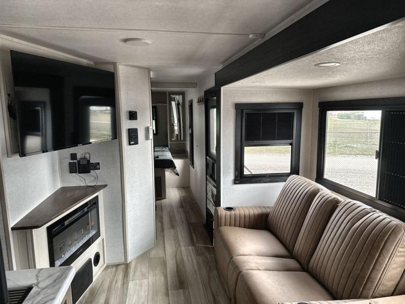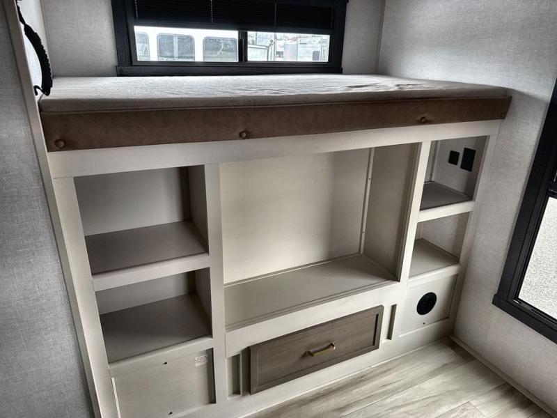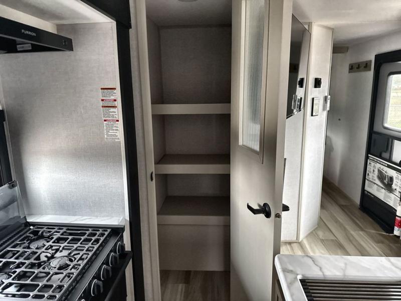 Your kids or friends are going to love camping in this travel trailer! It features a rear private bunkhouse with a bunk above a Versa queen convertible bed/sofa plus an additional bunk above an entertainment center with storage below. Just outside the bunkhouse is the kitchen with a 10 cu. ft. 12V black refrigerator, a microwave, a kitchen island, and a chef-sized walk-in pantry big enough to store everyone's favorite snacks. The booth dinette and the theatre seating are right next to panoramic windows so you can enjoy looking out at your beautiful scenery. You will also love taking a hot, steamy shower in the 30" x 36" shower with skylights and get a good night's rest on the queen bed in the front private bedroom!