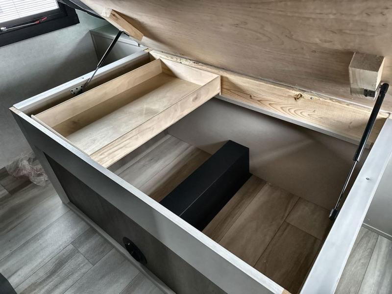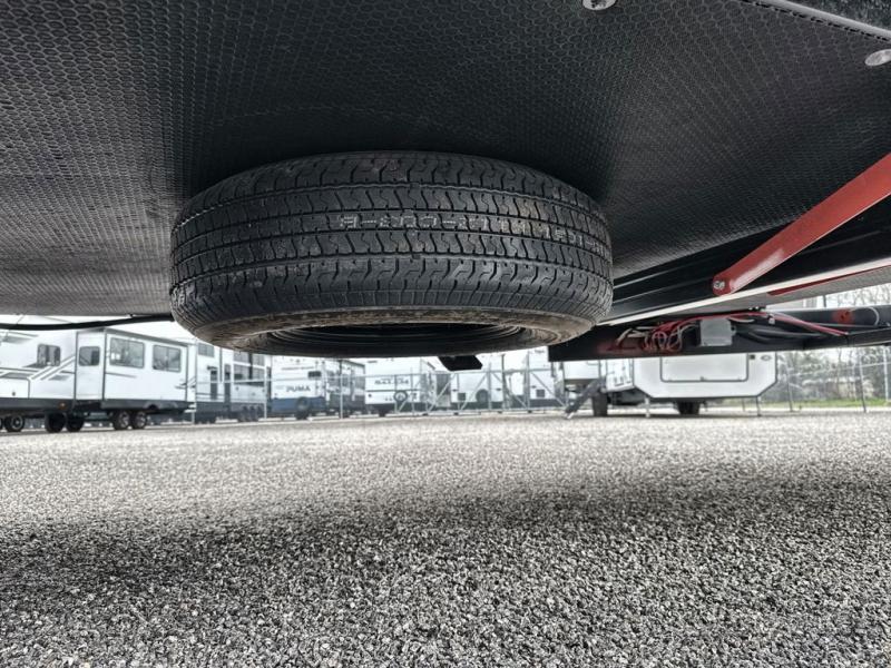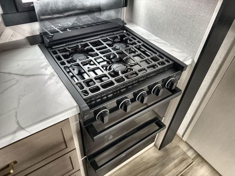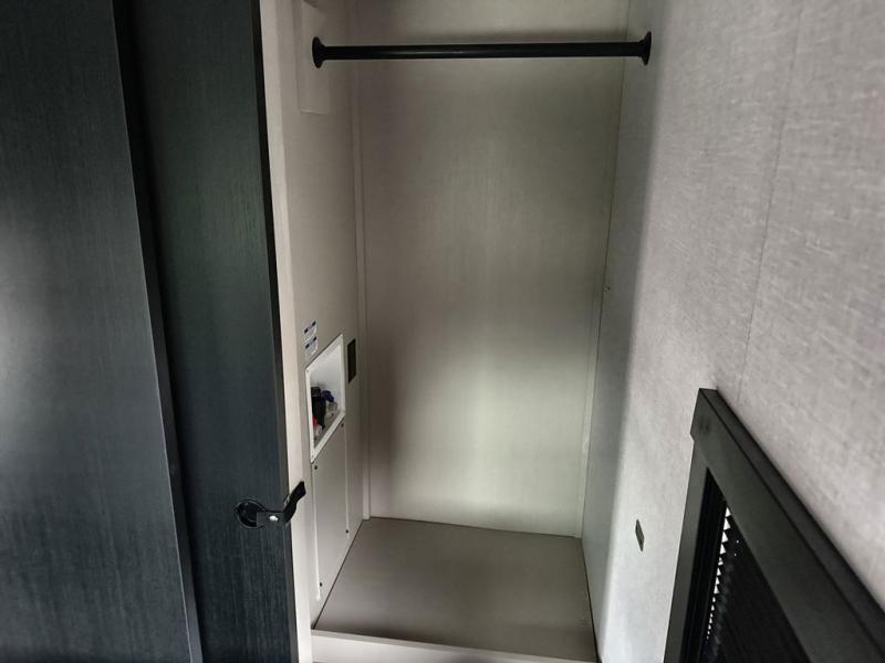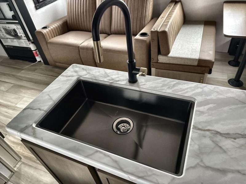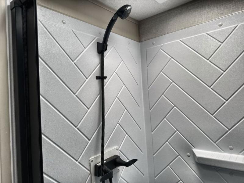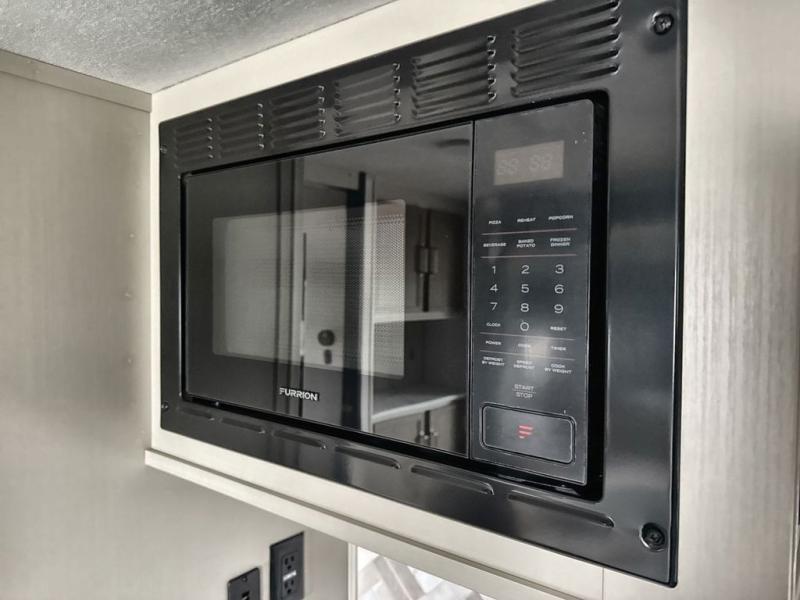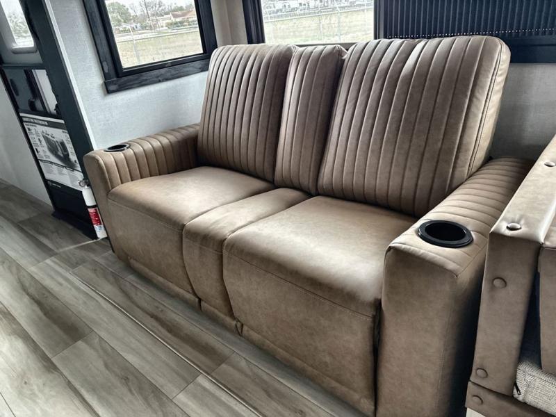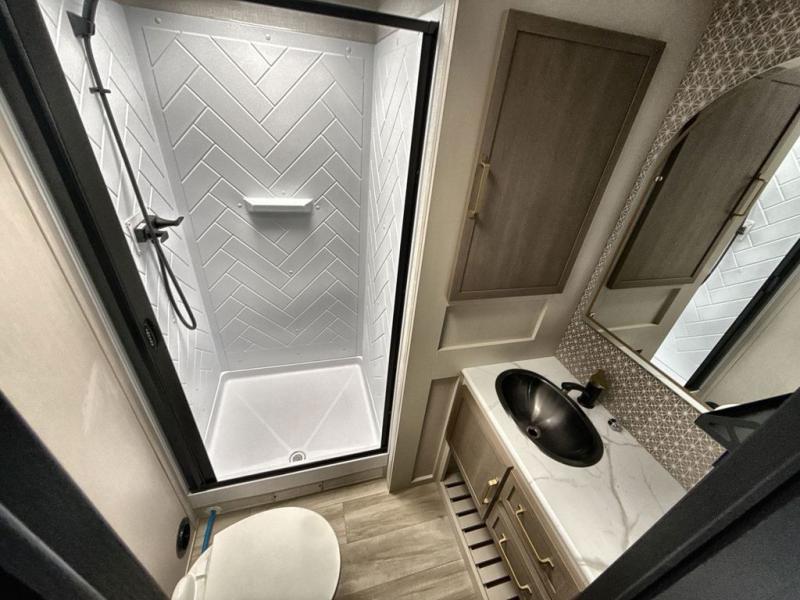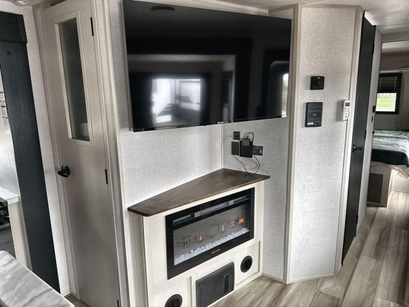 Your kids or friends are going to love camping in this travel trailer! It features a rear private bunkhouse with a bunk above a Versa queen convertible bed/sofa plus an additional bunk above an entertainment center with storage below. Just outside the bunkhouse is the kitchen with a 10 cu. ft. 12V black refrigerator, a microwave, a kitchen island, and a chef-sized walk-in pantry big enough to store everyone's favorite snacks. The booth dinette and the theatre seating are right next to panoramic windows so you can enjoy looking out at your beautiful scenery. You will also love taking a hot, steamy shower in the 30" x 36" shower with skylights and get a good night's rest on the queen bed in the front private bedroom!