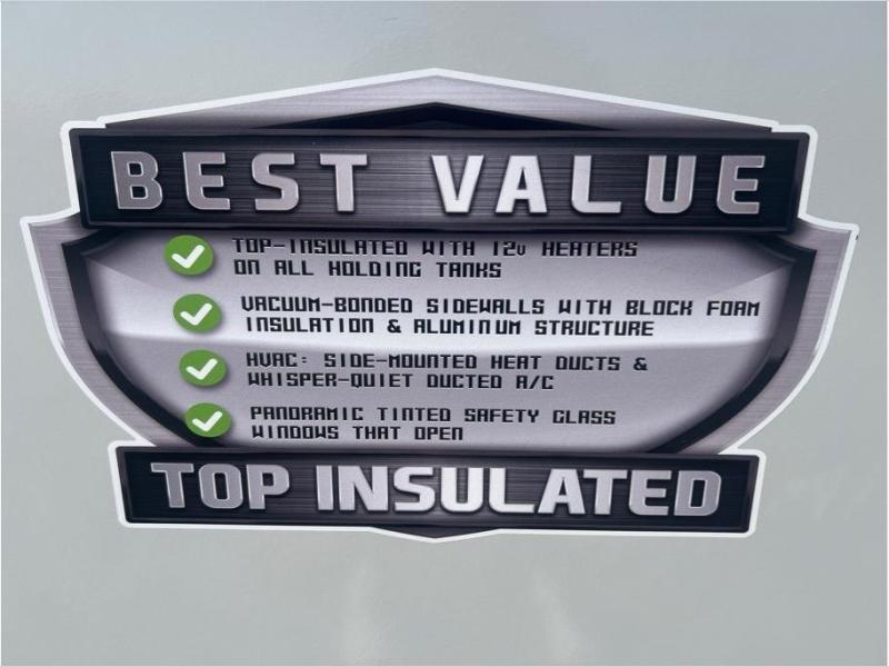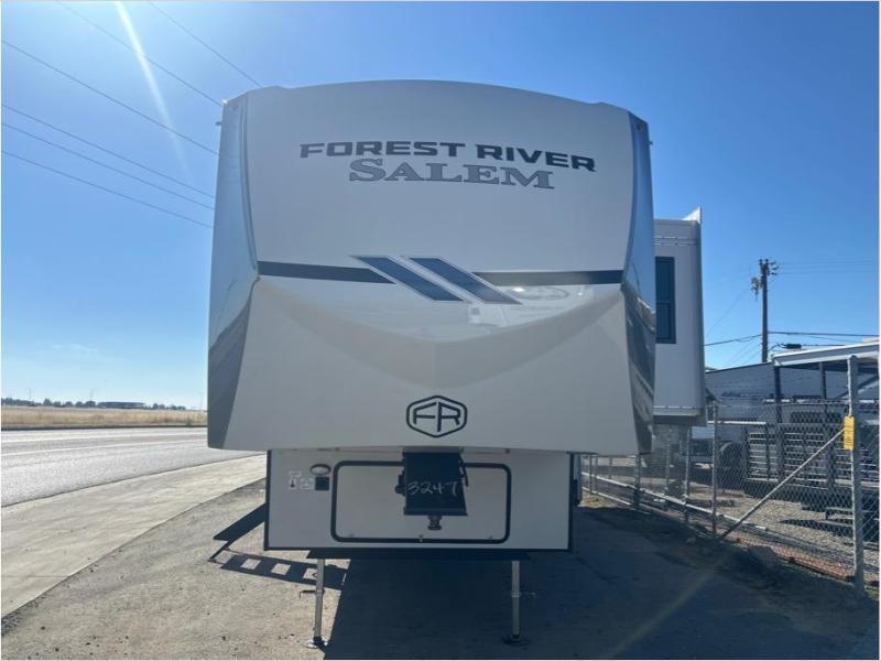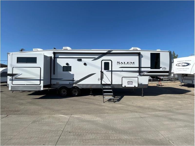 The Salem Hemisphere fifth wheels by Forest River are packed with features, while still being value-minded! Each model is constructed with laminated "Aluma Frame" sidewalls and floor with block foam insulation plus full-length barreled ceilings for added head space. There are LED awning, marker and taillights outside, along with an extra-large pass-thru storage with slam latch baggage doors, plus solar prep and Lippert On-The-Go ladder prep. The 60K on-demand tankless water heater will provide endless hot showers, and the JBL sound system includes a head unit plus interior and exterior speakers to keep the party going. There are also many interior comforts found throughout that will make you feel right at home!