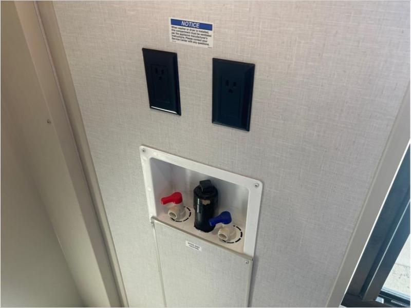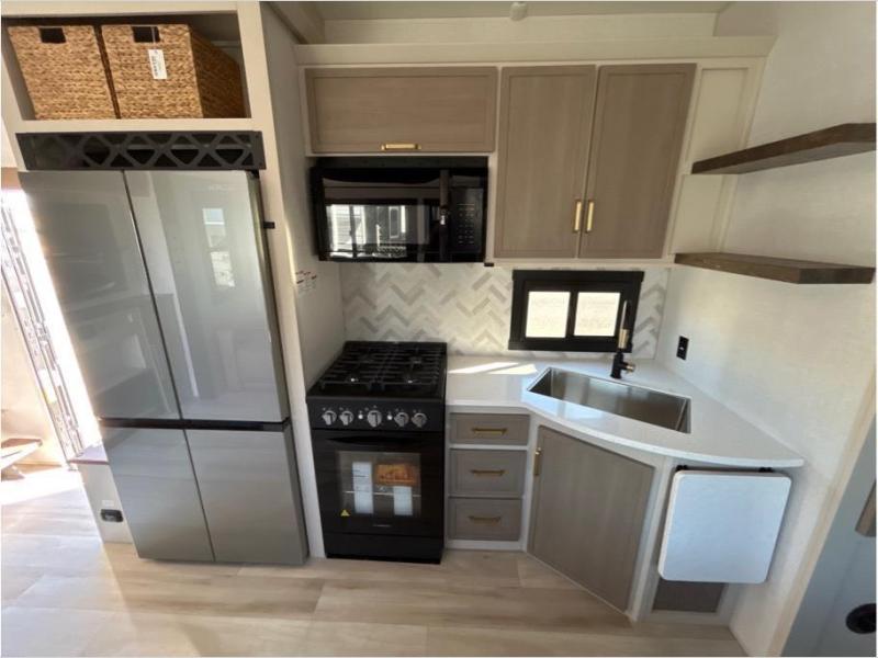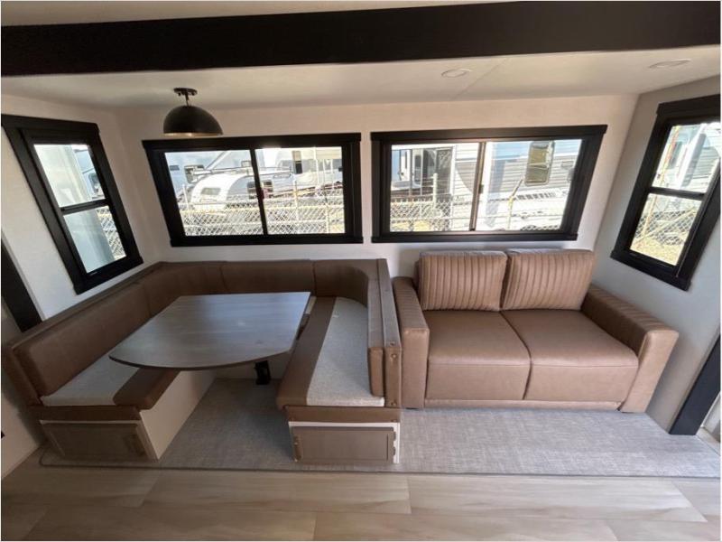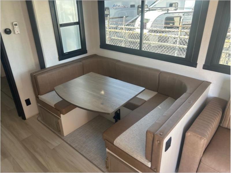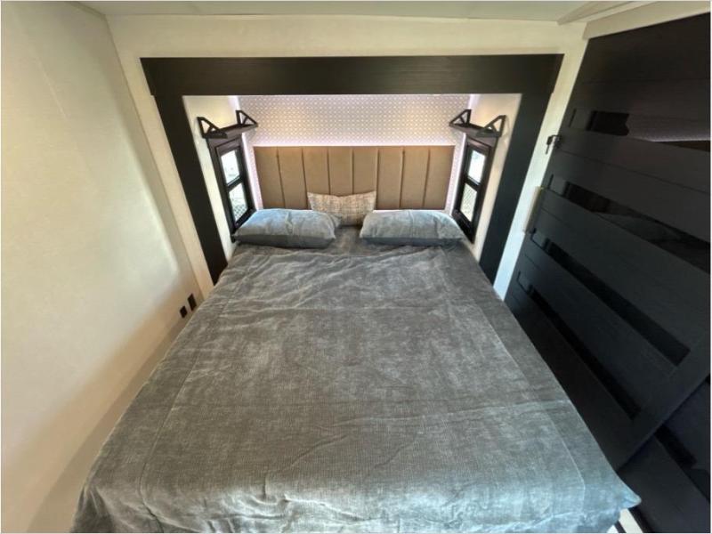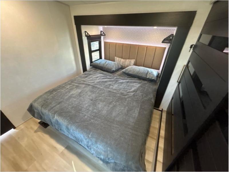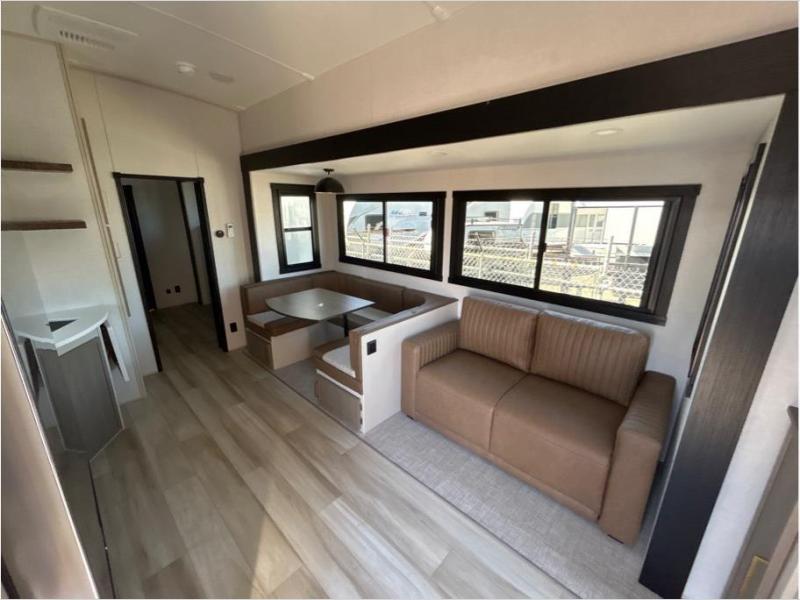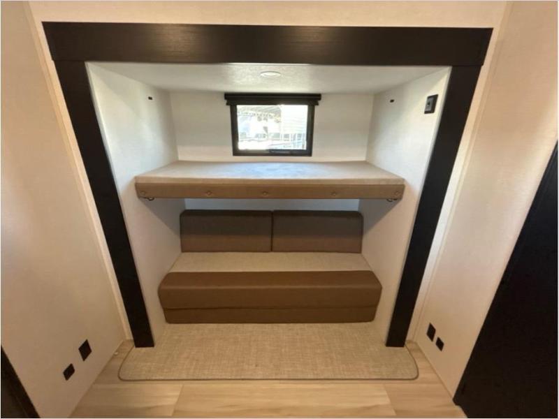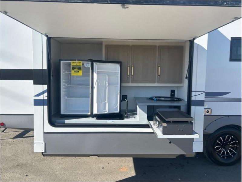 With two full bathrooms, everyone will stay clean in this fifth wheel! The double entry doors makes for a smooth flow of traffic and the unique rear entrance leads directly into the rear full bathroom. The private bunkhouse features not only one bunk above a Versa queen convertible bed/sofa, but also a second bunk above with storage. The U-shaped dinette is the perfect place for you to enjoy your meals at, play some card games and even transform into an extra sleeping space. The exterior has plenty of features you will love too like the outside kitchen/bar so you can have a good time cooking outdoors and a coax/TV hookup that you can add your own outside TV, plus an extra large pass-through storage area for your outdoor gear. When you're ready for bed, the custom king bed will be waiting for you in the front private bedroom!