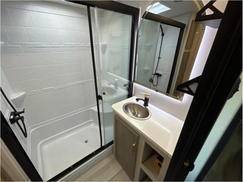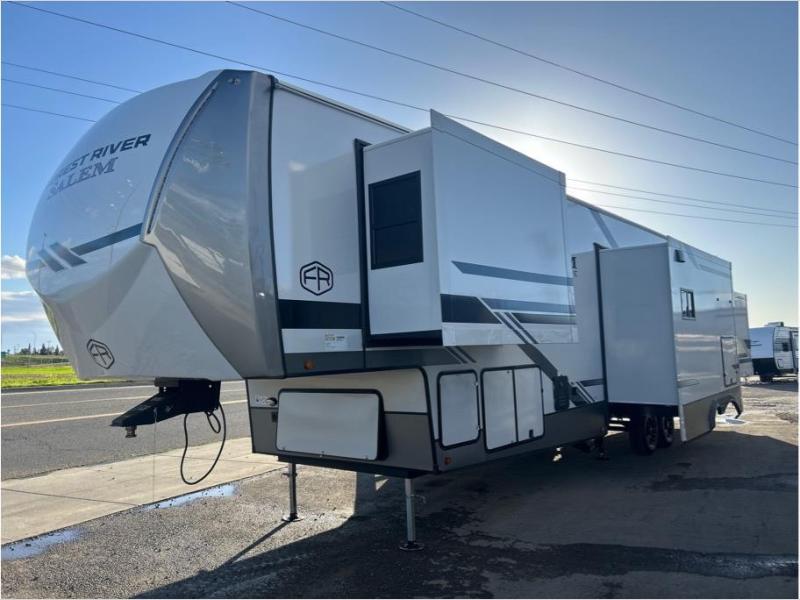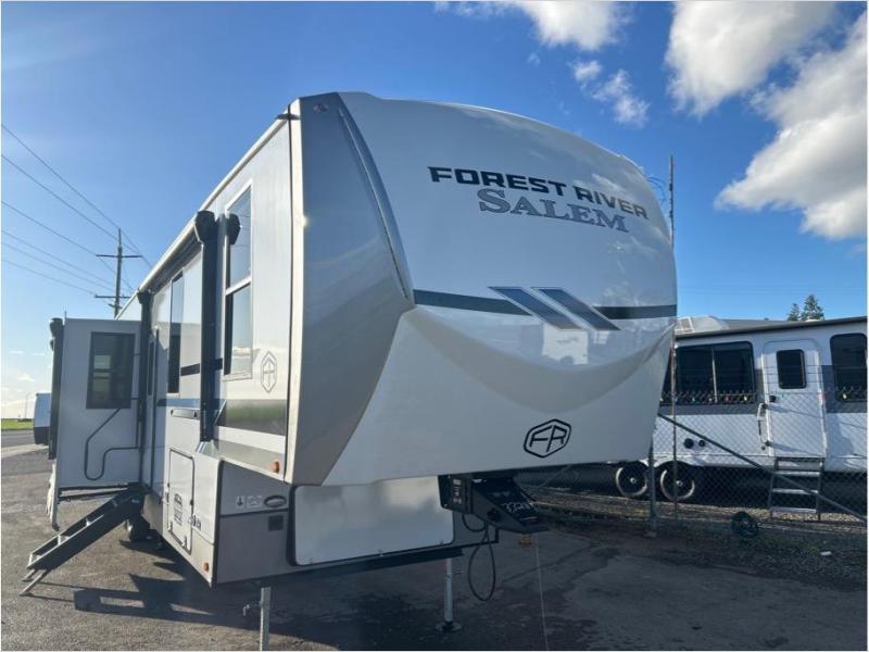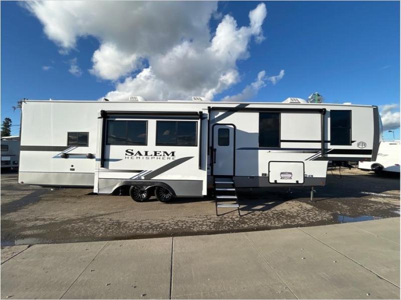The Salem Hemisphere fifth wheels by Forest River are packed with features, while still being value-minded! Each model is constructed with laminated "Aluma Frame" sidewalls and floor with block foam insulation plus full-length barreled ceilings for added head space. There are LED awning, marker and taillights outside, along with an extra-large pass-thru storage with slam latch baggage doors, plus solar prep and Lippert On-The-Go ladder prep. The 60K on-demand tankless water heater will provide endless hot showers, and the JBL sound system includes a head unit plus interior and exterior speakers to keep the party going. There are also many interior comforts found throughout that will make you feel right at home!