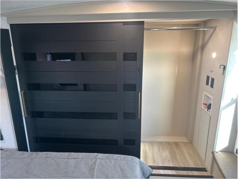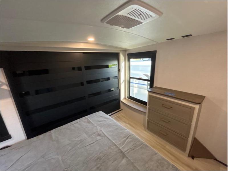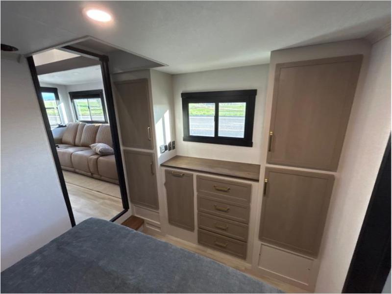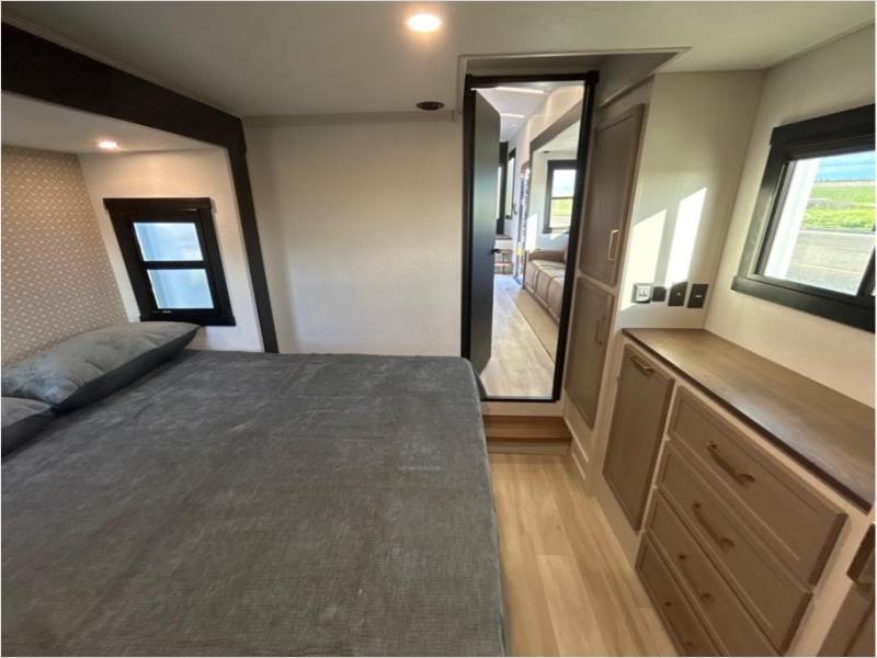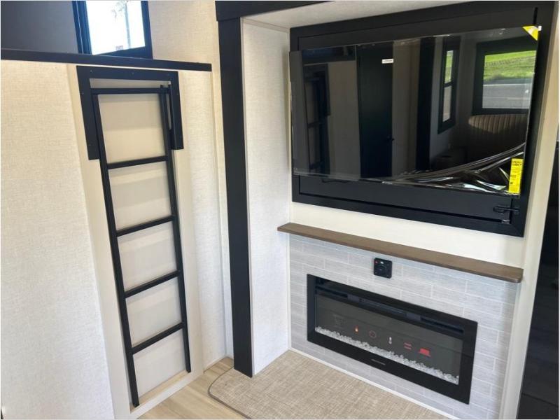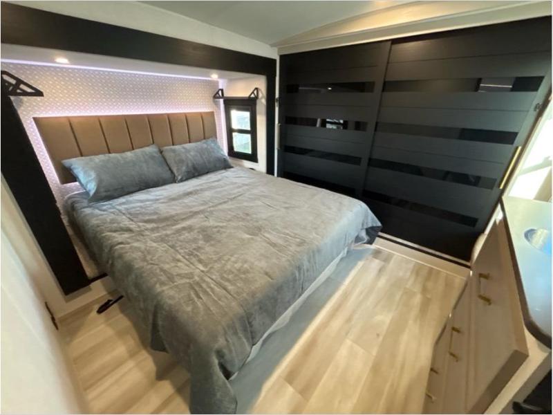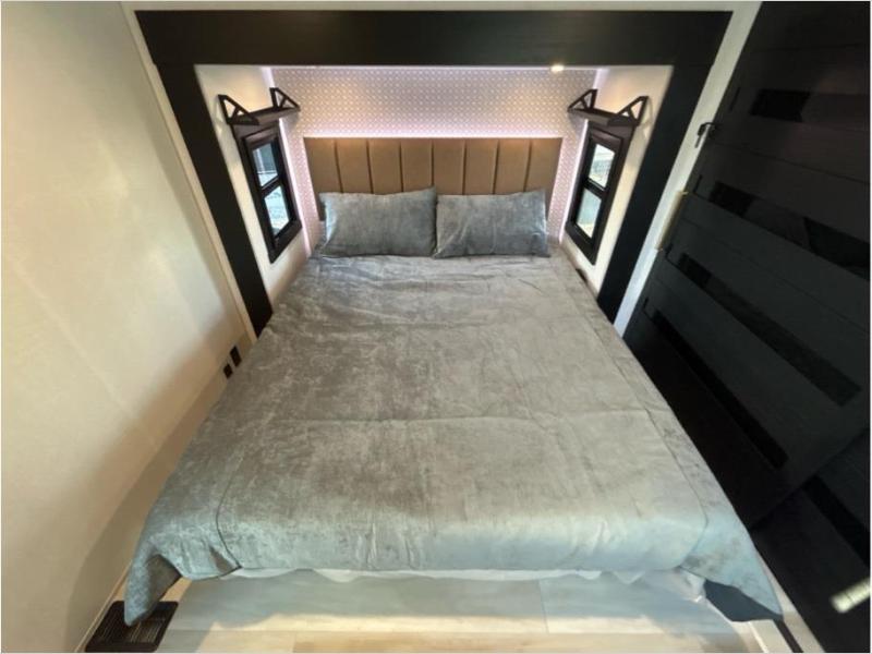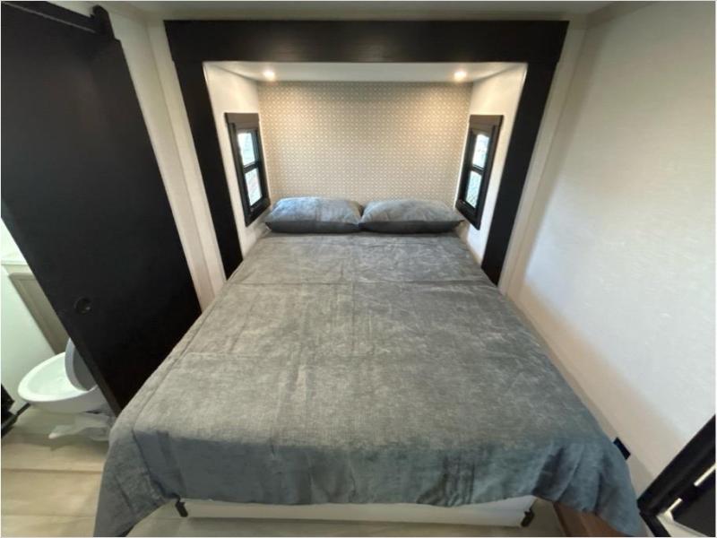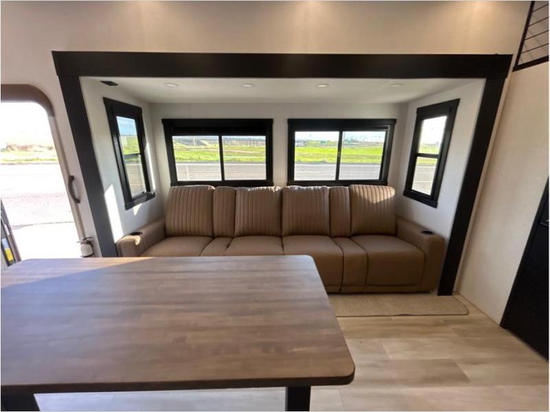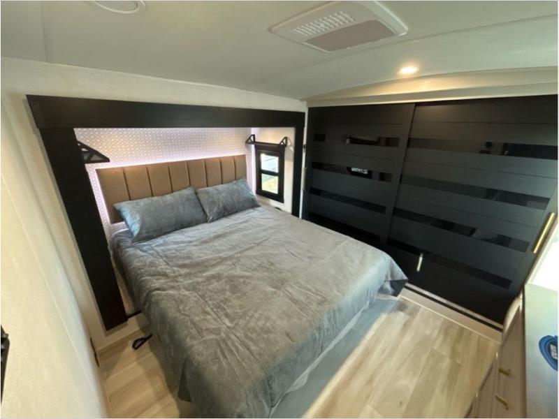 The whole family will love camping in this spacious fifth wheel! There are four slide outs, two bedrooms, plus two full baths, one of which is located in the rear master bedroom. A custom queen bed and dual wardrobes are also found in the master, while a custom king bed is found in the front private bedroom. And the loft with bunk mats can be used for additional sleeping or storage space! The chef of your group will find a full kitchen to cook meals, including ample counter space and a 16-cu. ft. 12V refrigerator and hidden storage behind the 50" TV for snacks or movies. The theater seating with cup holders provides a comfy place to relax each day, and the kitchen island with chairs will be perfect for dining space!