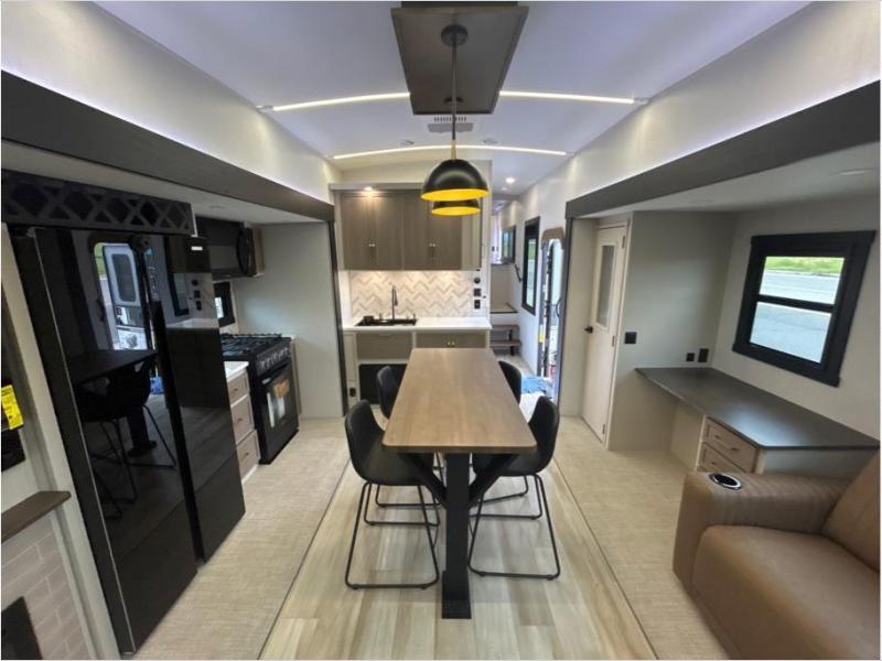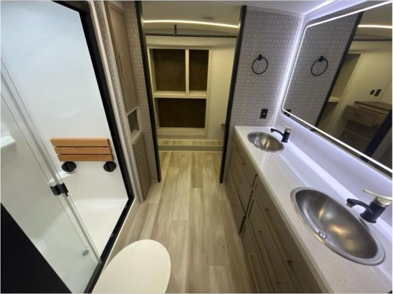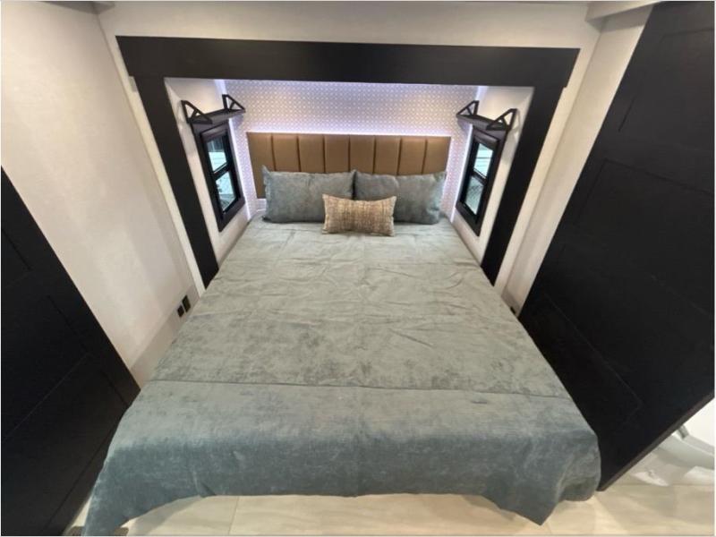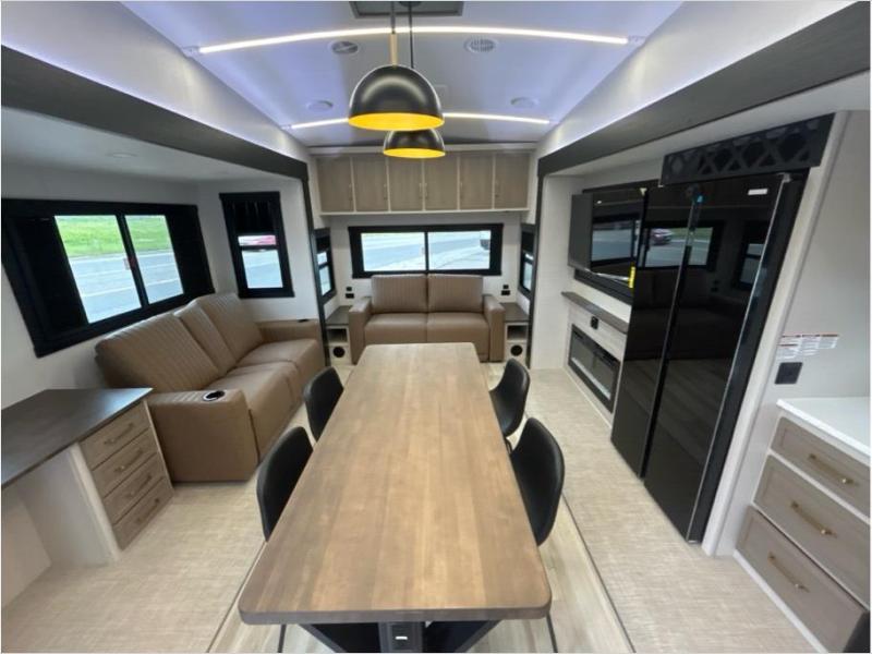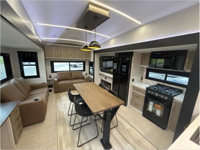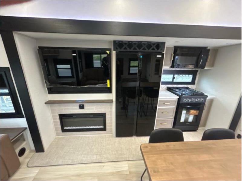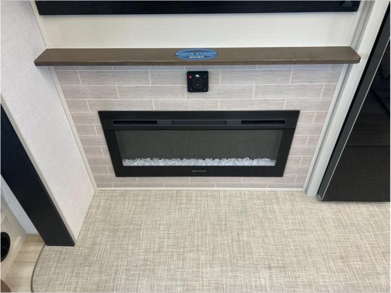 One look at this fifth wheel and you'll be sold! You can wake up each morning in the master bedroom that includes a custom king bed and a dresser with an ottoman. The front full bath has two bath sinks so you both can get ready at once, and you're going to love the walk-in wardrobe with wrap-around hanging rod. A half bath includes a floating shelf with a hanging rod plus washer/dryer prep, giving you the option to make this a laundry room! The back of this unit is where you can cook meals with full kitchen amenities, dine at the kitchen island with four chairs, and relax on the theater seating and tri-fold sofa. A 50" TV and fireplace is also found here, complete with hidden storage behind for board games, movies, and snacks!