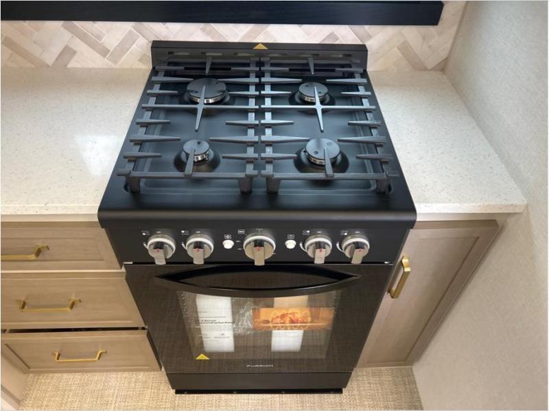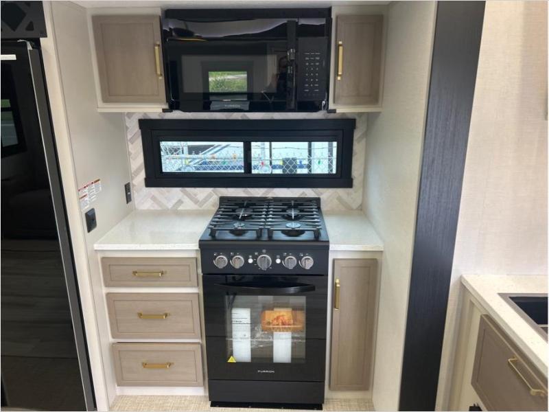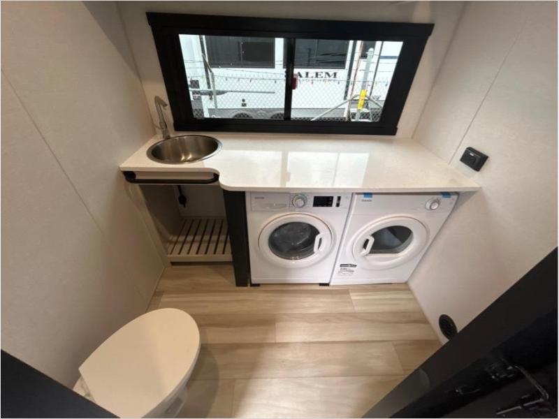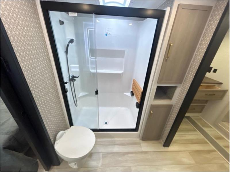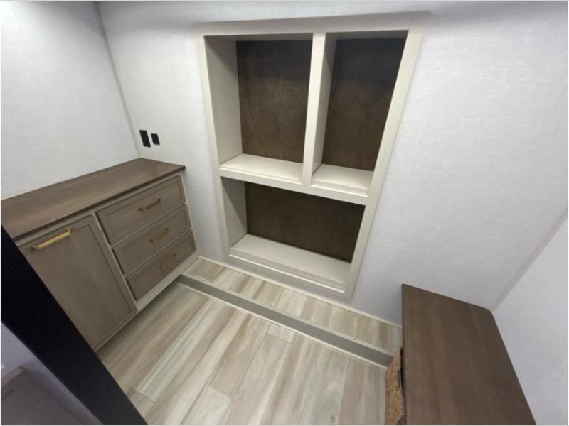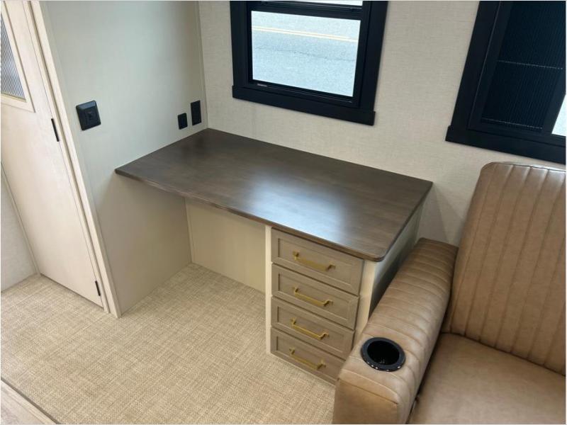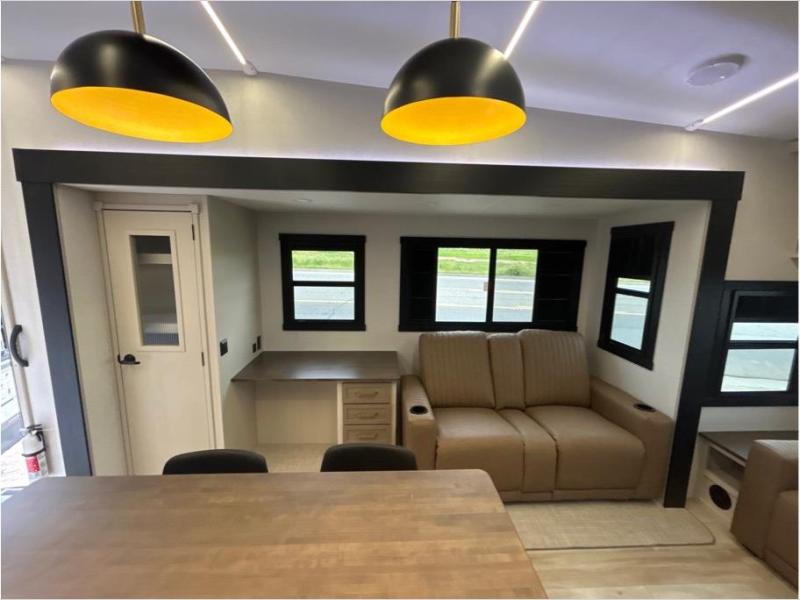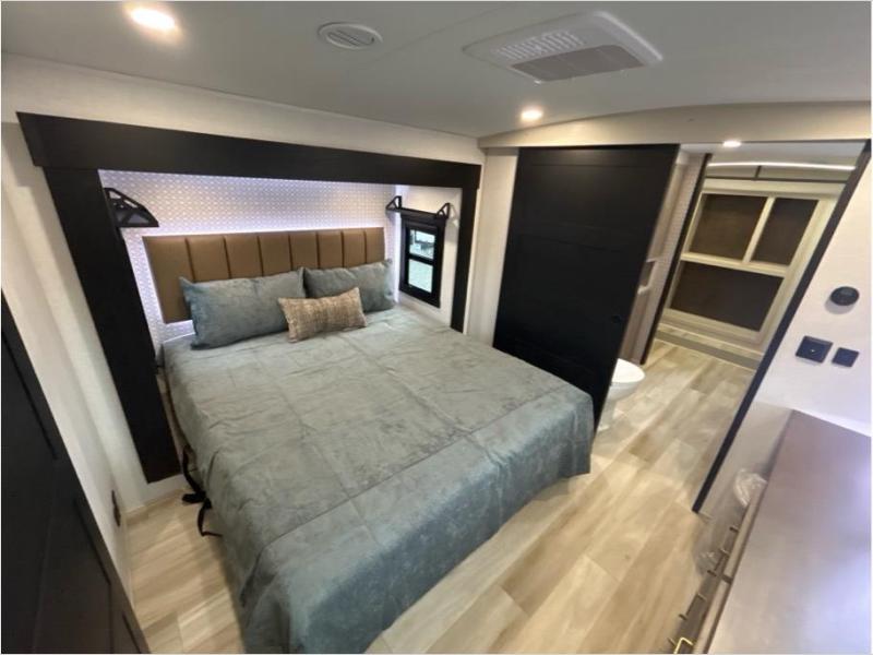One look at this fifth wheel and you'll be sold! You can wake up each morning in the master bedroom that includes a custom king bed and a dresser with an ottoman. The front full bath has two bath sinks so you both can get ready at once, and you're going to love the walk-in wardrobe with wrap-around hanging rod. A half bath includes a floating shelf with a hanging rod plus washer/dryer prep, giving you the option to make this a laundry room! The back of this unit is where you can cook meals with full kitchen amenities, dine at the kitchen island with four chairs, and relax on the theater seating and tri-fold sofa. A 50" TV and fireplace is also found here, complete with hidden storage behind for board games, movies, and snacks!