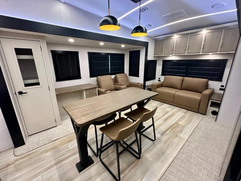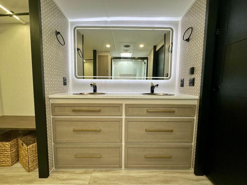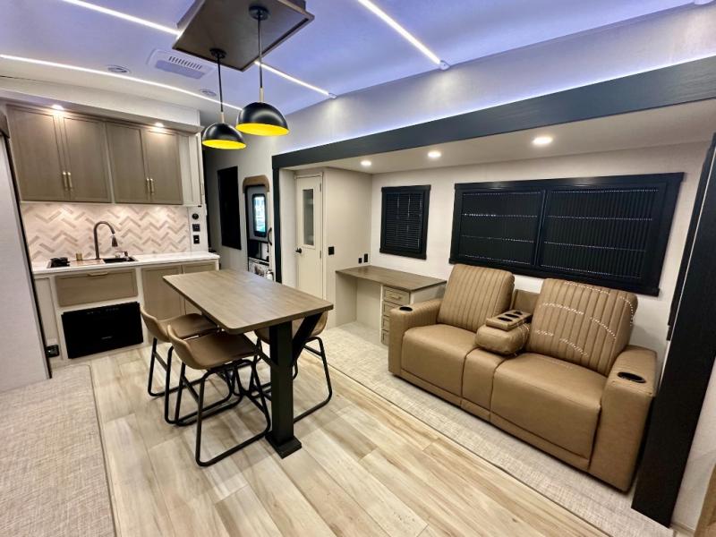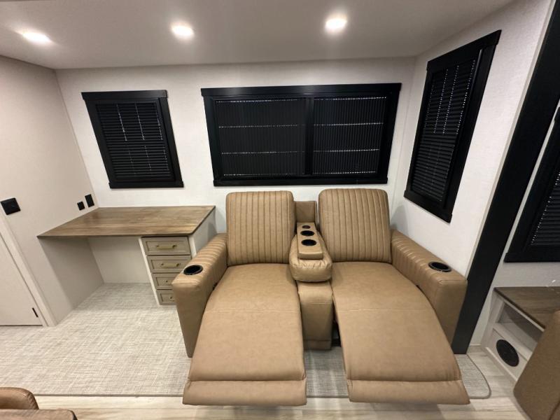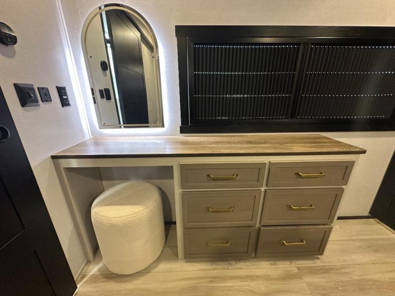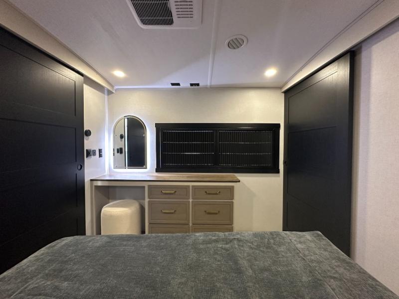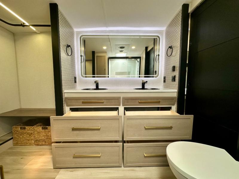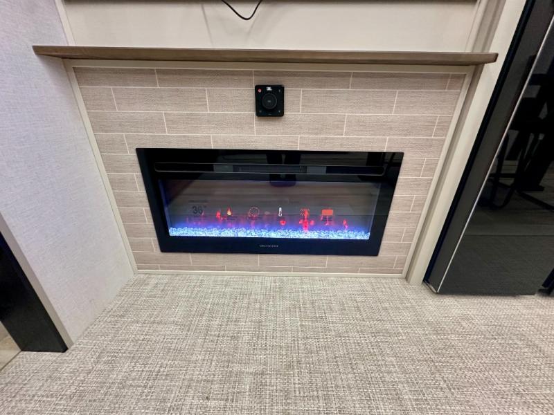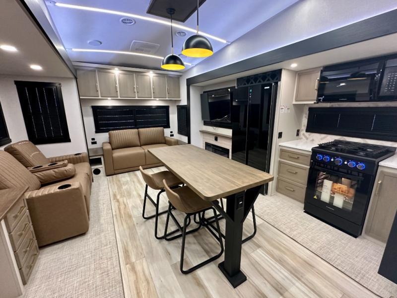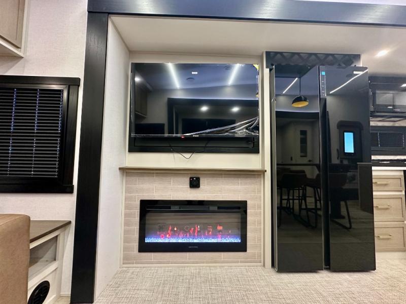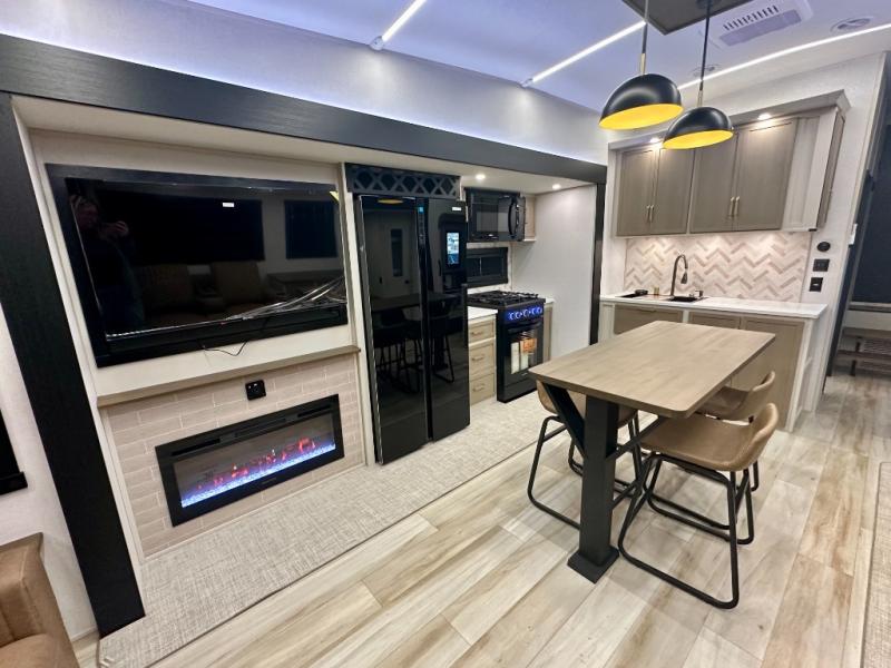One look at this fifth wheel and you'll be sold! You can wake up each morning in the master bedroom that includes a custom king bed and a dresser with an ottoman. The front full bath has two bath sinks so you both can get ready at once, and you're going to love the walk-in wardrobe with wrap-around hanging rod. A half bath includes a floating shelf with a hanging rod plus washer/dryer prep, giving you the option to make this a laundry room! The back of this unit is where you can cook meals with full kitchen amenities, dine at the kitchen island with four chairs, and relax on the theater seating and tri-fold sofa. A 50" TV and fireplace is also found here, complete with hidden storage behind for board games, movies, and snacks!