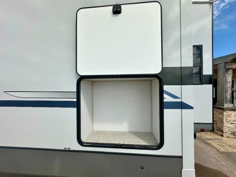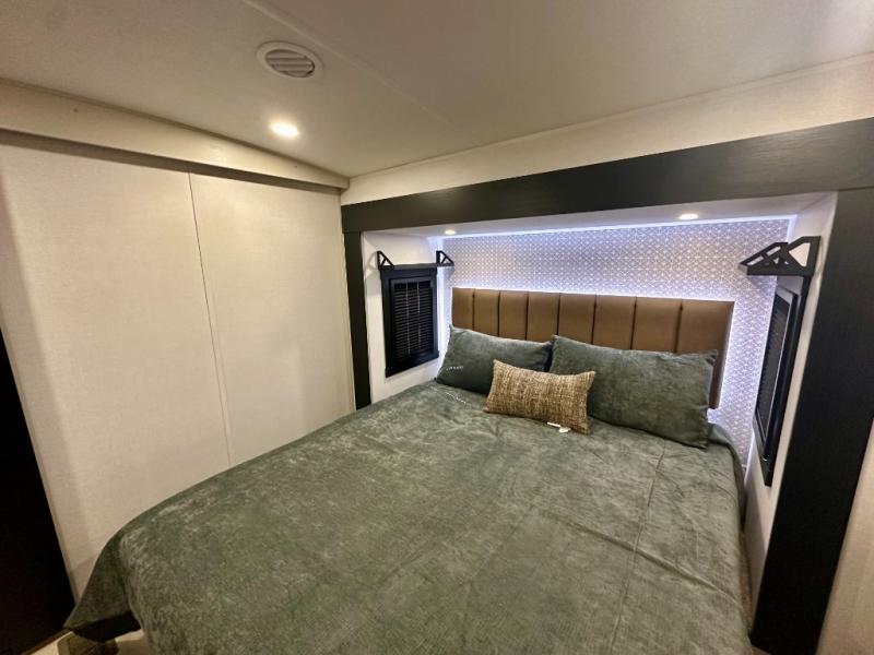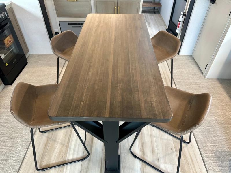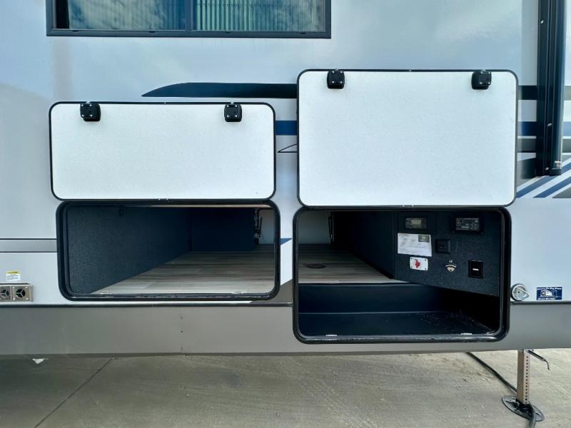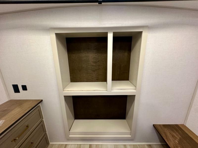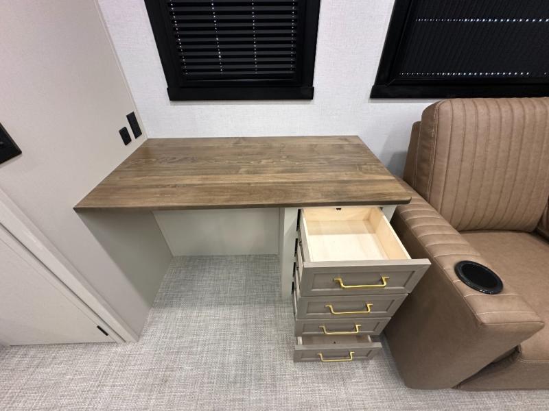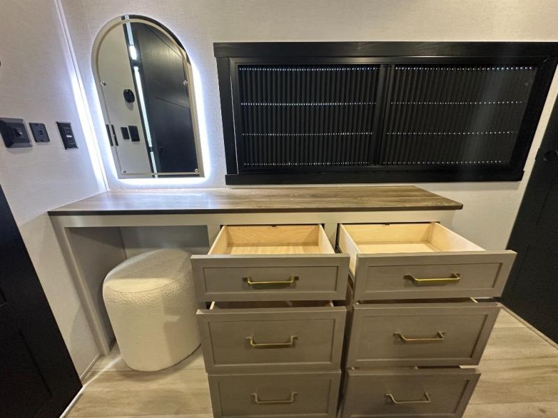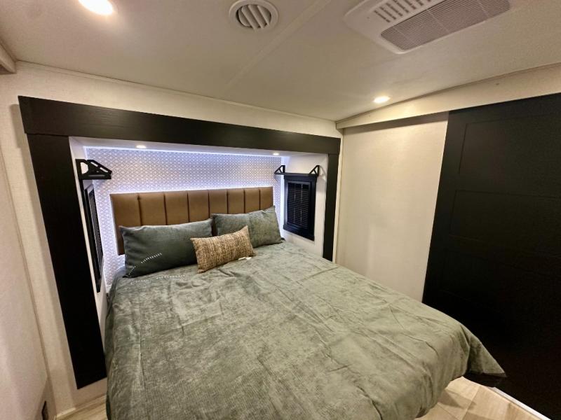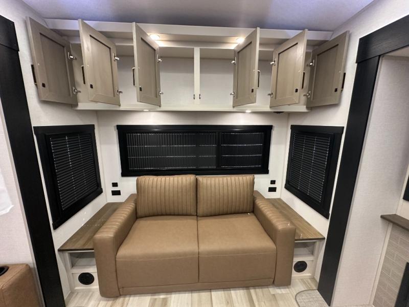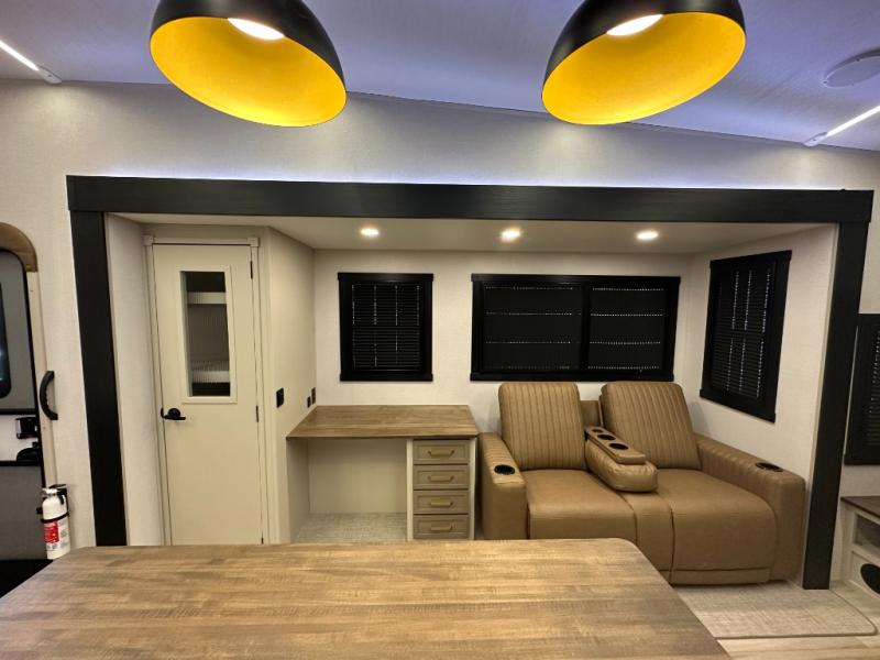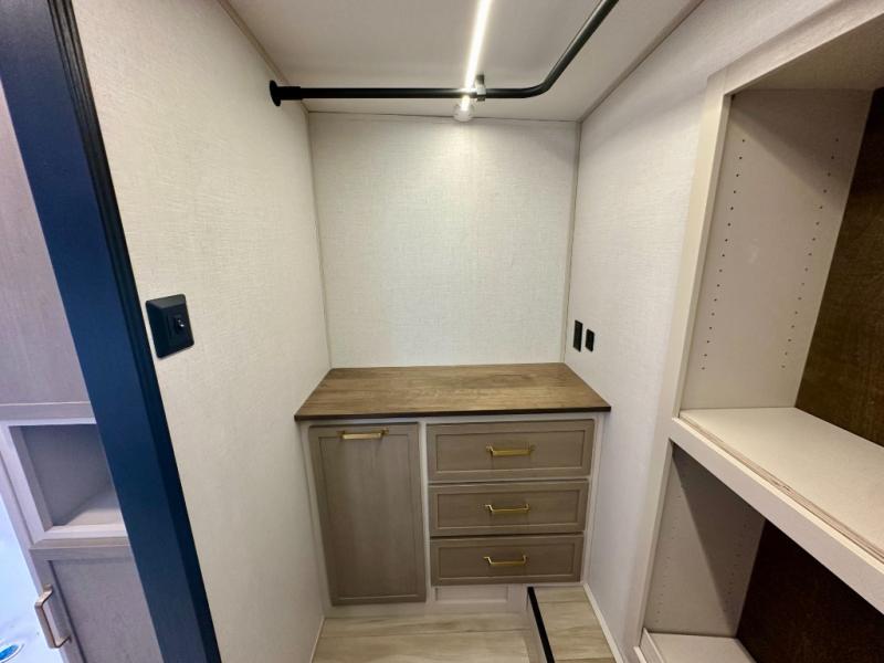 One look at this fifth wheel and you'll be sold! You can wake up each morning in the master bedroom that includes a custom king bed and a dresser with an ottoman. The front full bath has two bath sinks so you both can get ready at once, and you're going to love the walk-in wardrobe with wrap-around hanging rod. A half bath includes a floating shelf with a hanging rod plus washer/dryer prep, giving you the option to make this a laundry room! The back of this unit is where you can cook meals with full kitchen amenities, dine at the kitchen island with four chairs, and relax on the theater seating and tri-fold sofa. A 50" TV and fireplace is also found here, complete with hidden storage behind for board games, movies, and snacks!