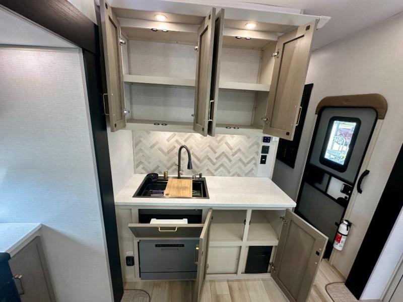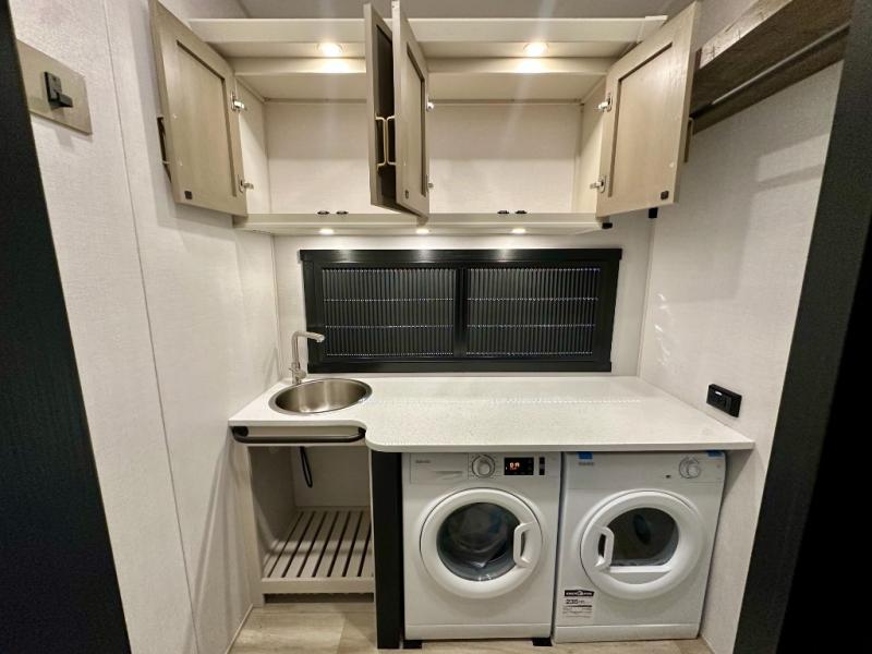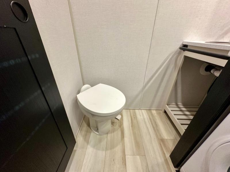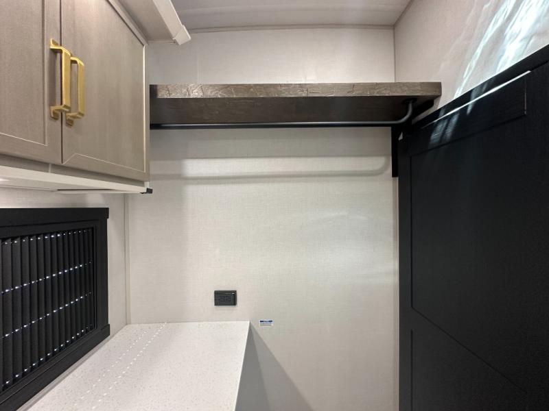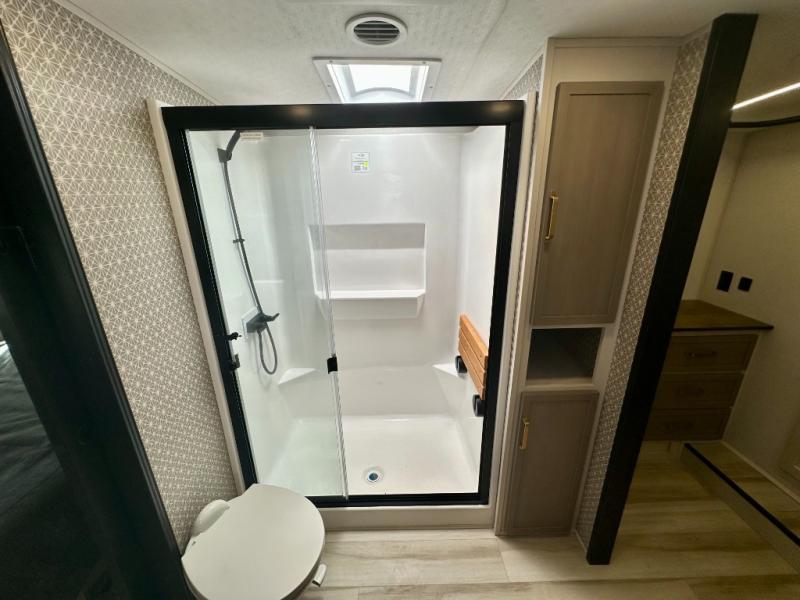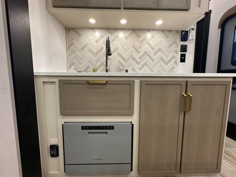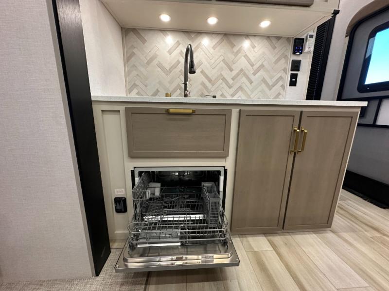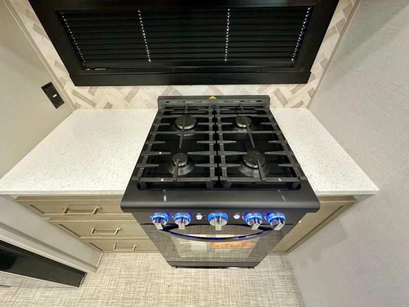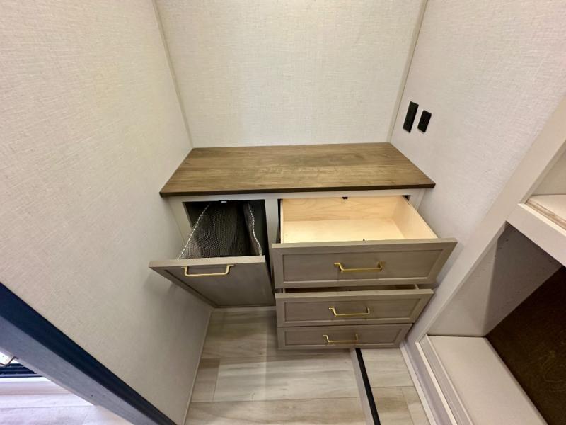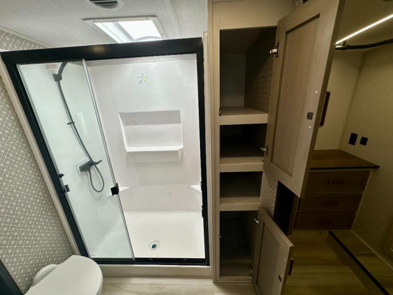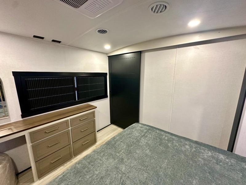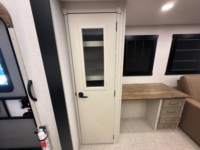 One look at this fifth wheel and you'll be sold! You can wake up each morning in the master bedroom that includes a custom king bed and a dresser with an ottoman. The front full bath has two bath sinks so you both can get ready at once, and you're going to love the walk-in wardrobe with wrap-around hanging rod. A half bath includes a floating shelf with a hanging rod plus washer/dryer prep, giving you the option to make this a laundry room! The back of this unit is where you can cook meals with full kitchen amenities, dine at the kitchen island with four chairs, and relax on the theater seating and tri-fold sofa. A 50" TV and fireplace is also found here, complete with hidden storage behind for board games, movies, and snacks!