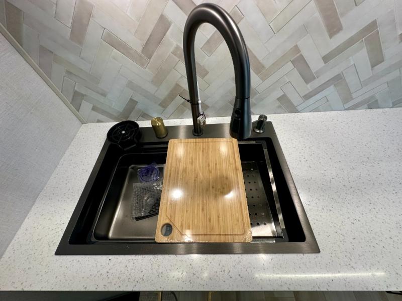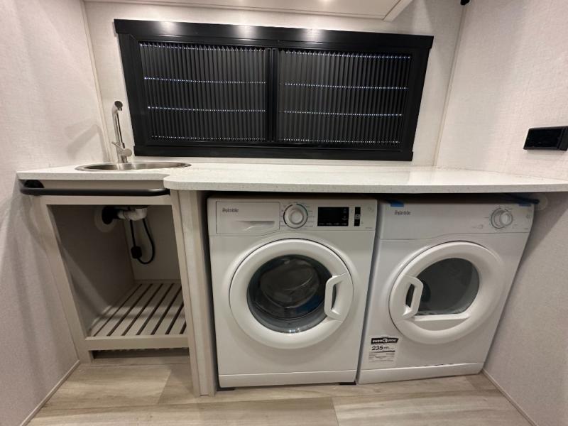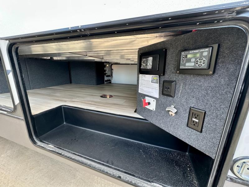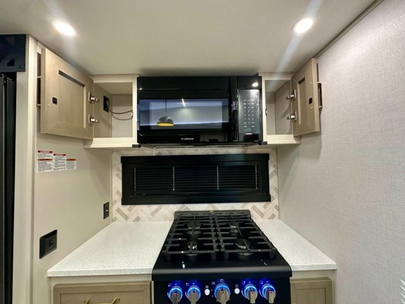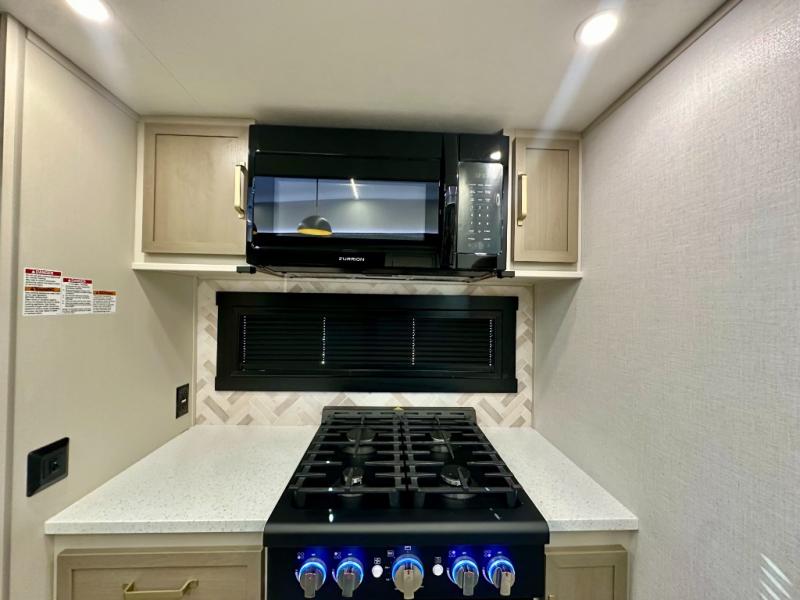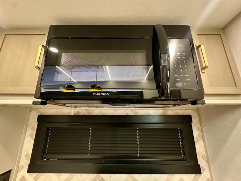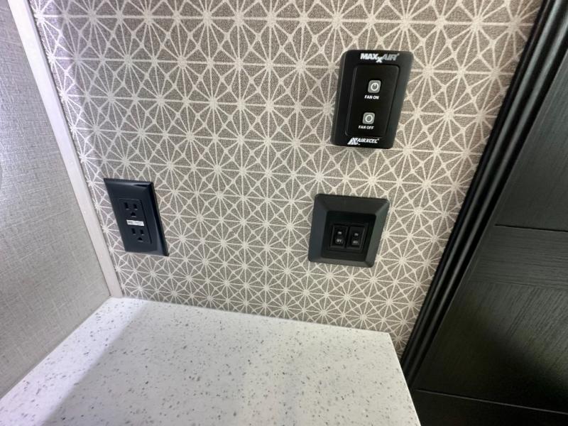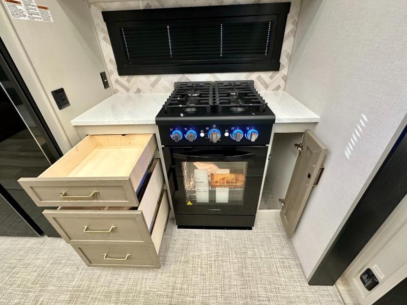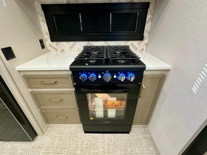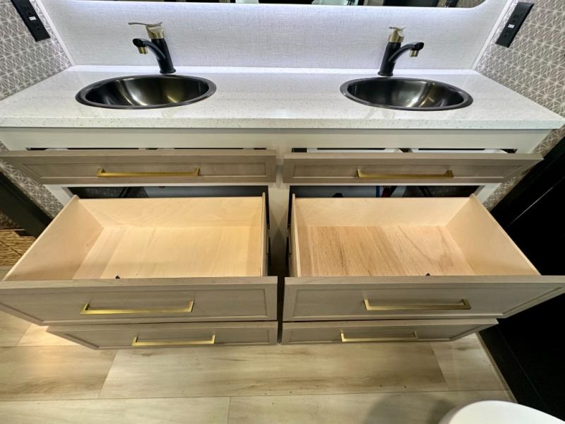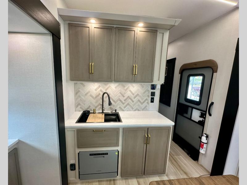 One look at this fifth wheel and you'll be sold! You can wake up each morning in the master bedroom that includes a custom king bed and a dresser with an ottoman. The front full bath has two bath sinks so you both can get ready at once, and you're going to love the walk-in wardrobe with wrap-around hanging rod. A half bath includes a floating shelf with a hanging rod plus washer/dryer prep, giving you the option to make this a laundry room! The back of this unit is where you can cook meals with full kitchen amenities, dine at the kitchen island with four chairs, and relax on the theater seating and tri-fold sofa. A 50" TV and fireplace is also found here, complete with hidden storage behind for board games, movies, and snacks!