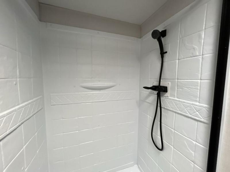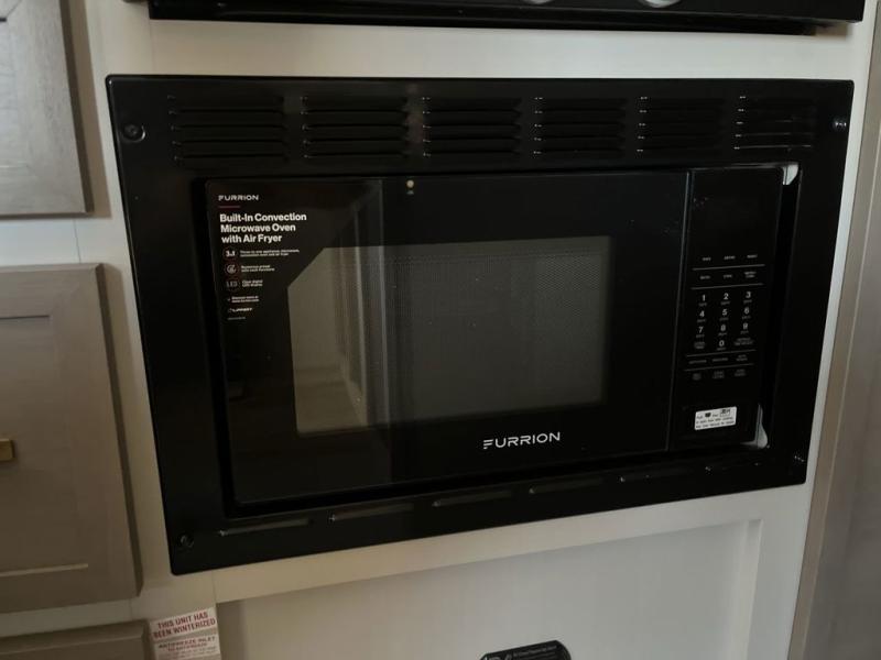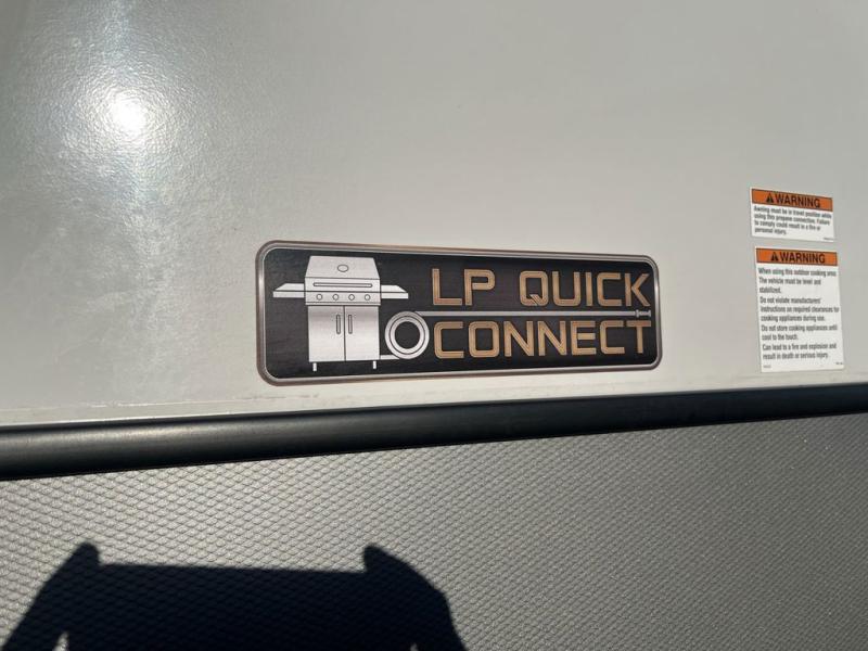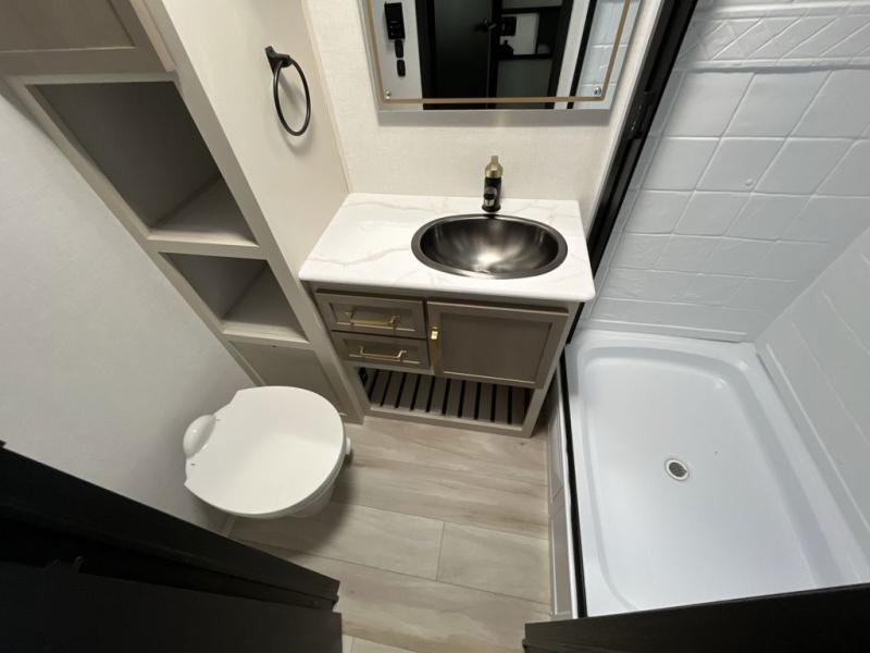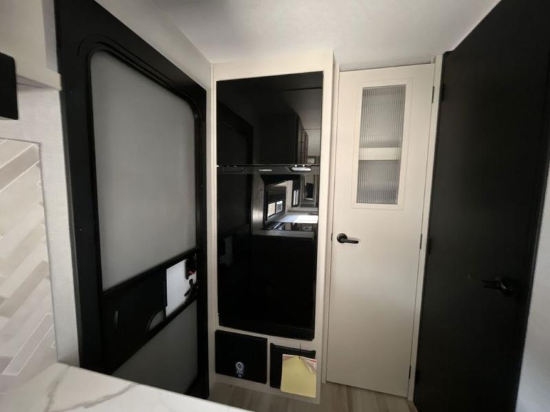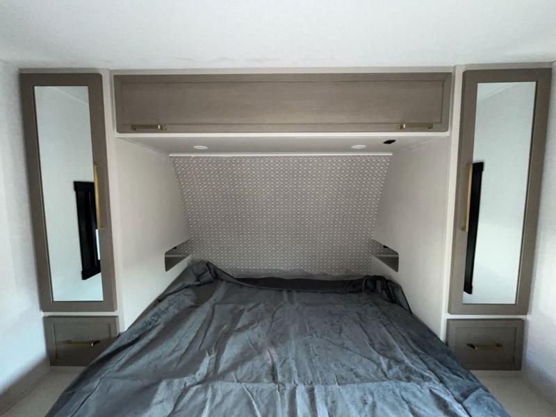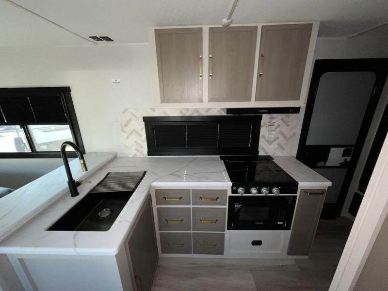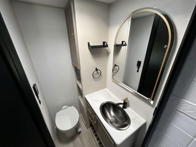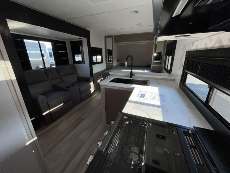 At the front of this thoughtfully designed trailer, a comfortable 60" x 80" queen bed provides a restful retreat, complete with overhead cabinets for storing your essentials and adventure gear. Moving into the center, the L-shaped kitchen impresses with elegant temple cherry cabinetry, Nordic marble countertops, and a residential-style single-bowl undermount sink, while a convenient bar with stools at the end offers a cozy spot to enjoy meals or morning coffee. Across from the kitchen, a slide-out adds generous space and features theater seating where you can relax and take in the views through large panoramic windows. At the rear, a 10-cu. ft. refrigerator and pantry keep all your groceries and dry goods organized, and just opposite, a full bathroom ensures you can freshen up without relying on campsite facilities.