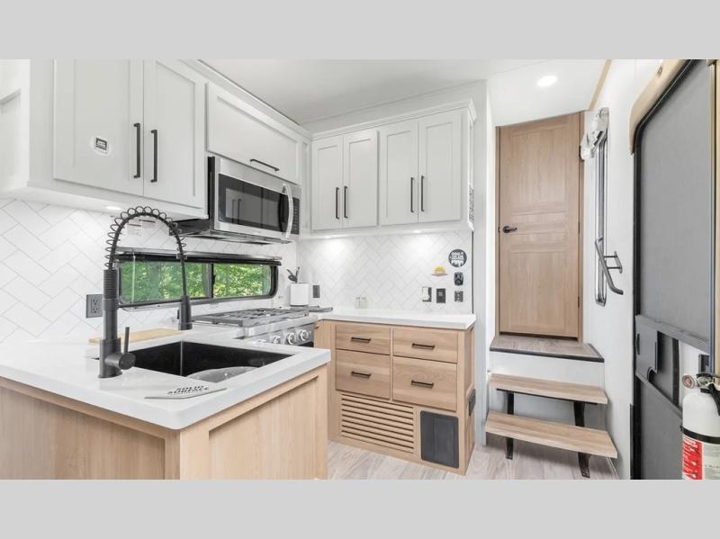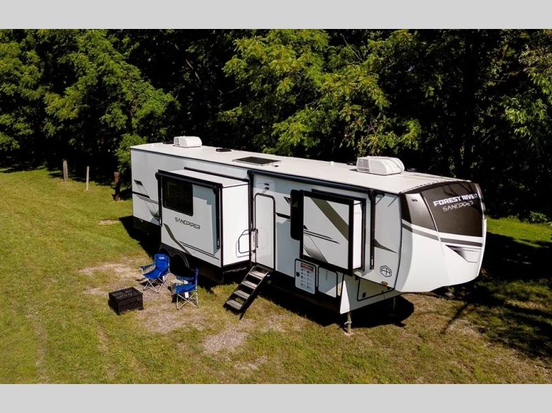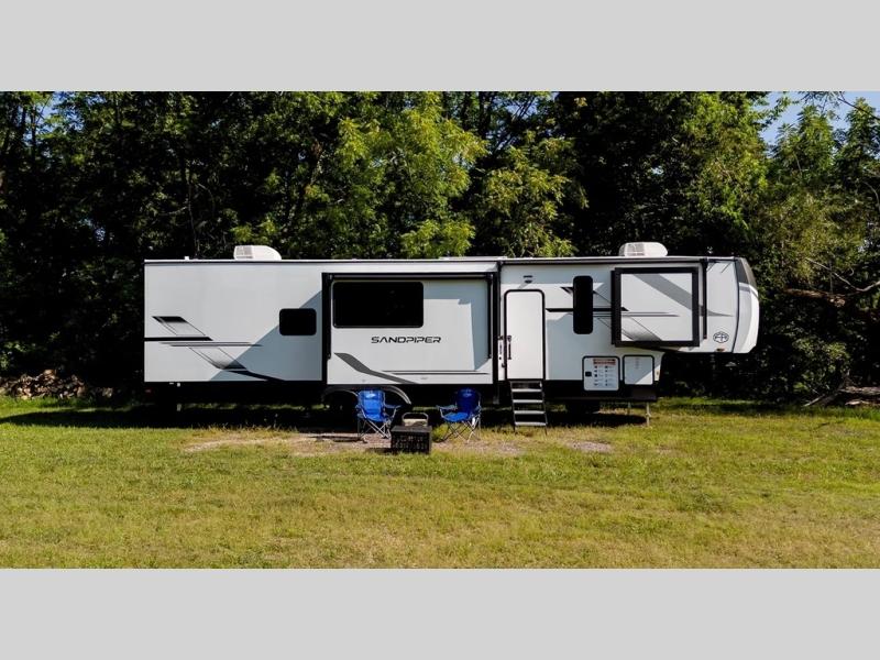 You will find the perfect balance of size, space, features, and luxury with any one of these Forest River Sandpiper fifth wheels! They have a cambered powder coated frame with rust prohibitor, and a fully enclosed underbelly for added protection against the elements. Also, the power front jacks with spring-loaded pins enhance the convenience, speed, and safety. The large, tinted windows come with a 80/20 UV prohibitors. Some hassle-free amenities include a 60k BTU on-demand water heater, porcelain foot flush toilet(s), tire pressure monitor system, and an electric leveling system! Inside, you'll enjoy stainless steel kitchen package, solid surface kitchen countertops, Beachside Sundance Congoleum linoleum, recessed residential lighting, and many more comforts!
