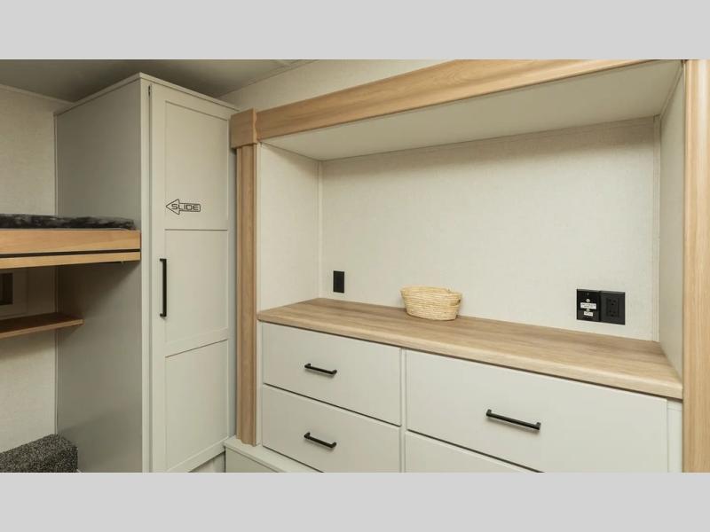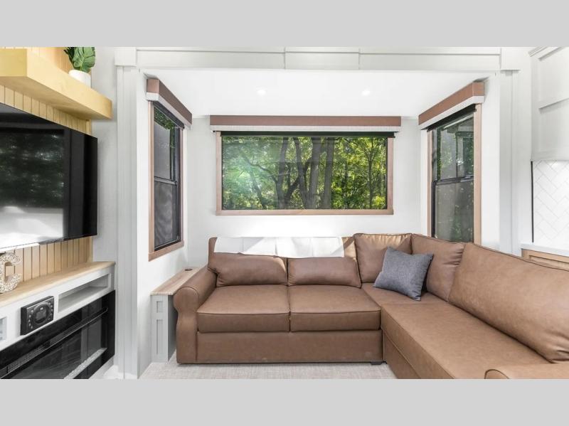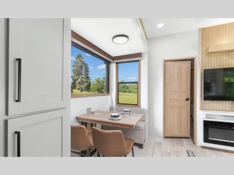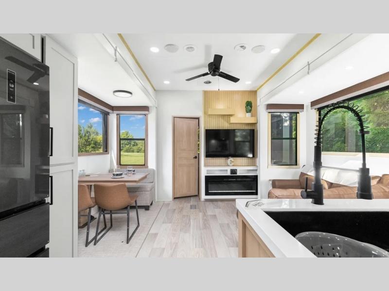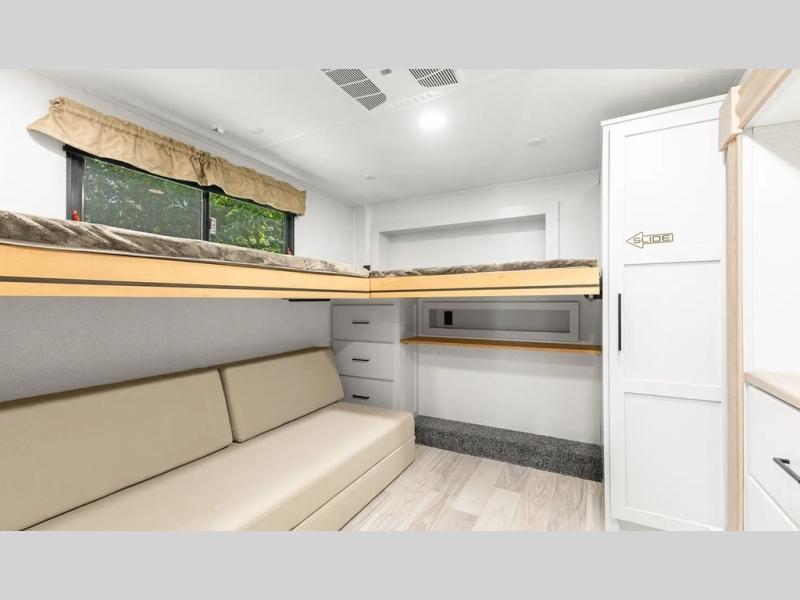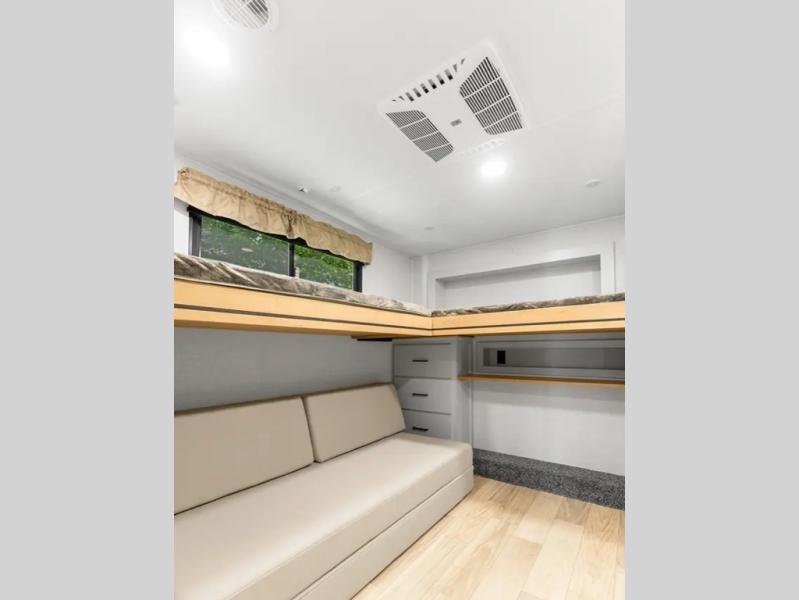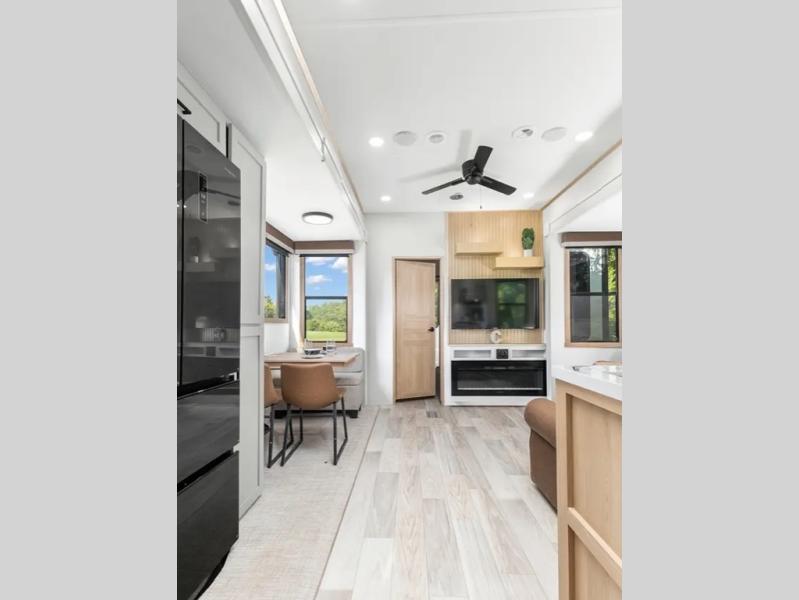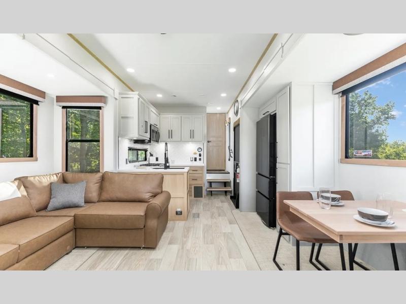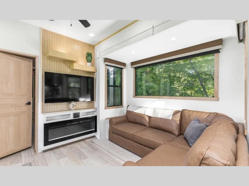 This fifth wheel is thoughtfully designed for comfort and convenience, starting with a spacious front bunkhouse perfect for accommodating guests. It features two flip-up bunks, 28" x 74" and 32" x 74" and a 60" x 74" fold-out lounge, along with a wardrobe, dresser, and additional storage to keep essentials organized. A nearby half bath adds easy access and extra convenience. At the center of the unit, the kitchen offers everything you need to prepare meals, including a stainless-steel sink, three-burner cooktop, and a generous 16 cu. ft. refrigerator. Meals can be enjoyed at the free-standing dinette, or you can unwind on the sectional sofa while enjoying the fireplace or entertainment center. At the rear, you'll find the private main bedroom with a roomy 66" x 80" RV king bed, plus its own wardrobe and dresser. Just steps away is the full bathroom featuring a one-piece fiberglass shower, sink with medicine cabinet, linen storage, and even washer/dryer prep for extended stays.