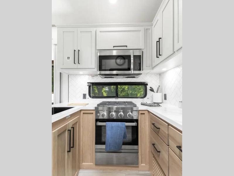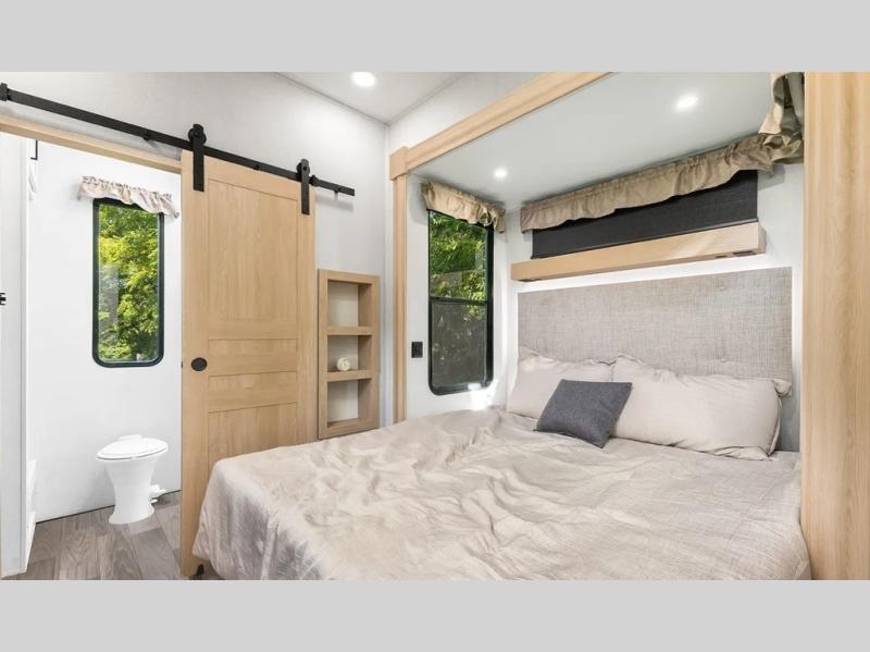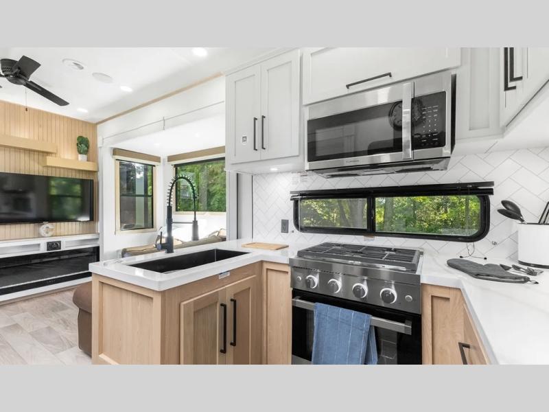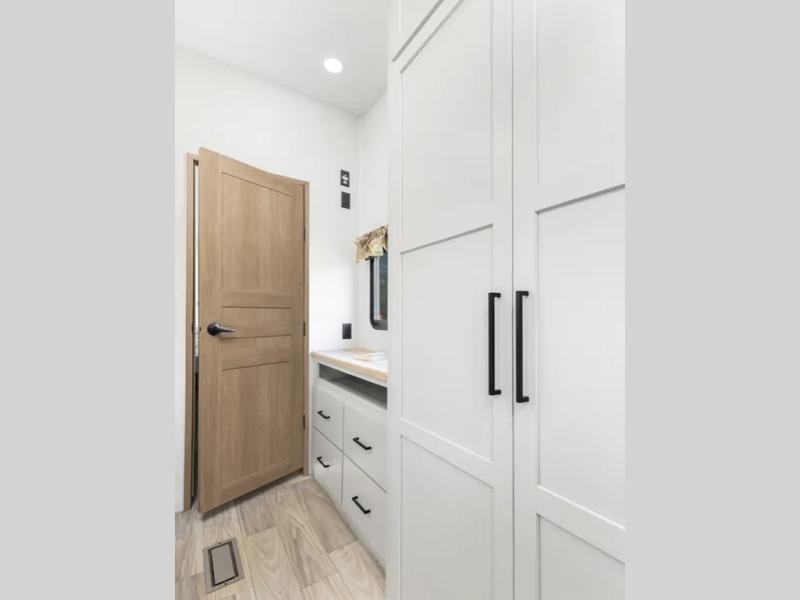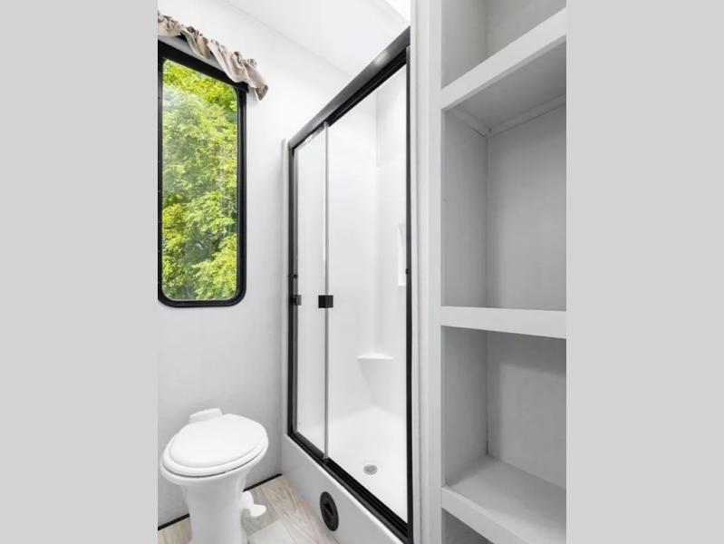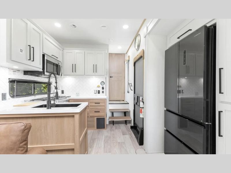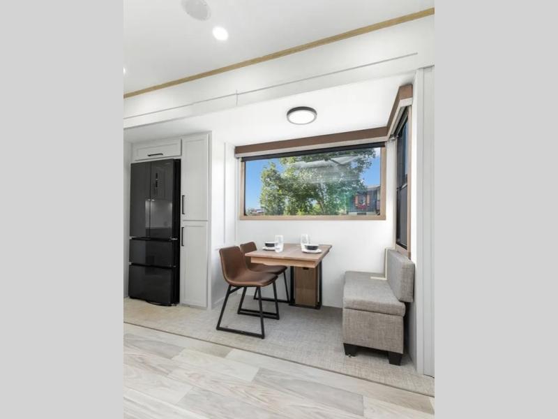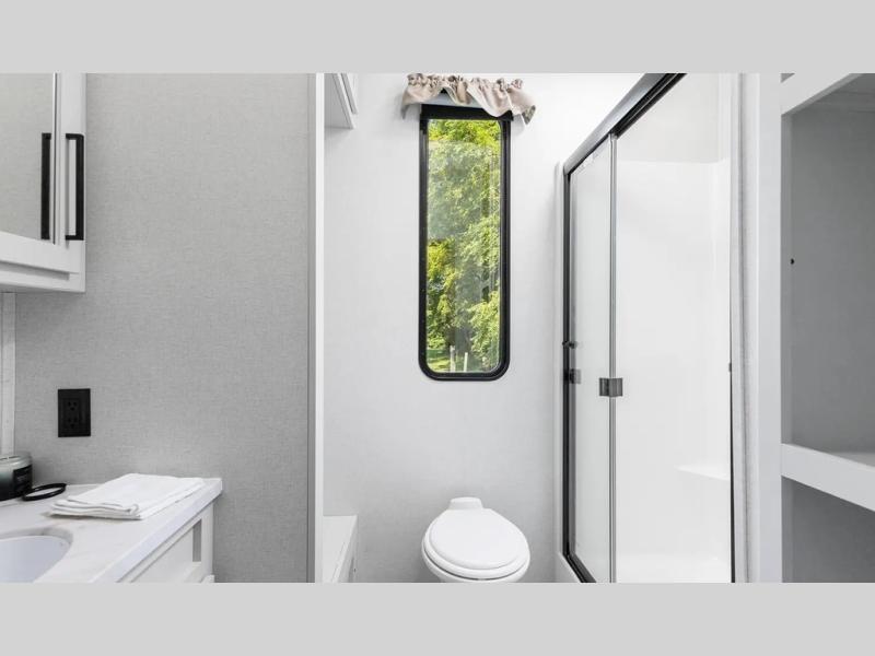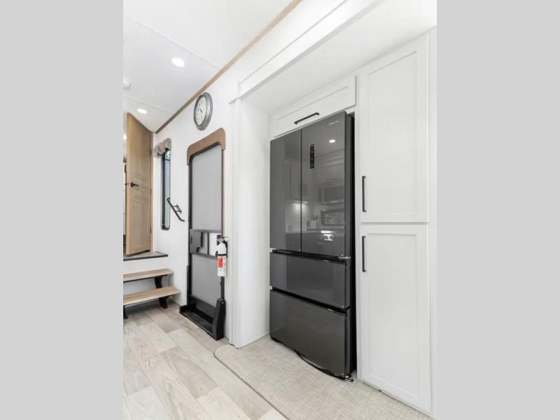 This fifth wheel is thoughtfully designed for comfort and convenience, starting with a spacious front bunkhouse perfect for accommodating guests. It features two flip-up bunks, 28" x 74" and 32" x 74" and a 60" x 74" fold-out lounge, along with a wardrobe, dresser, and additional storage to keep essentials organized. A nearby half bath adds easy access and extra convenience. At the center of the unit, the kitchen offers everything you need to prepare meals, including a stainless-steel sink, three-burner cooktop, and a generous 16 cu. ft. refrigerator. Meals can be enjoyed at the free-standing dinette, or you can unwind on the sectional sofa while enjoying the fireplace or entertainment center. At the rear, you'll find the private main bedroom with a roomy 66" x 80" RV king bed, plus its own wardrobe and dresser. Just steps away is the full bathroom featuring a one-piece fiberglass shower, sink with medicine cabinet, linen storage, and even washer/dryer prep for extended stays.