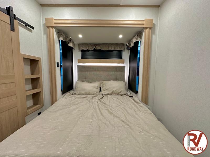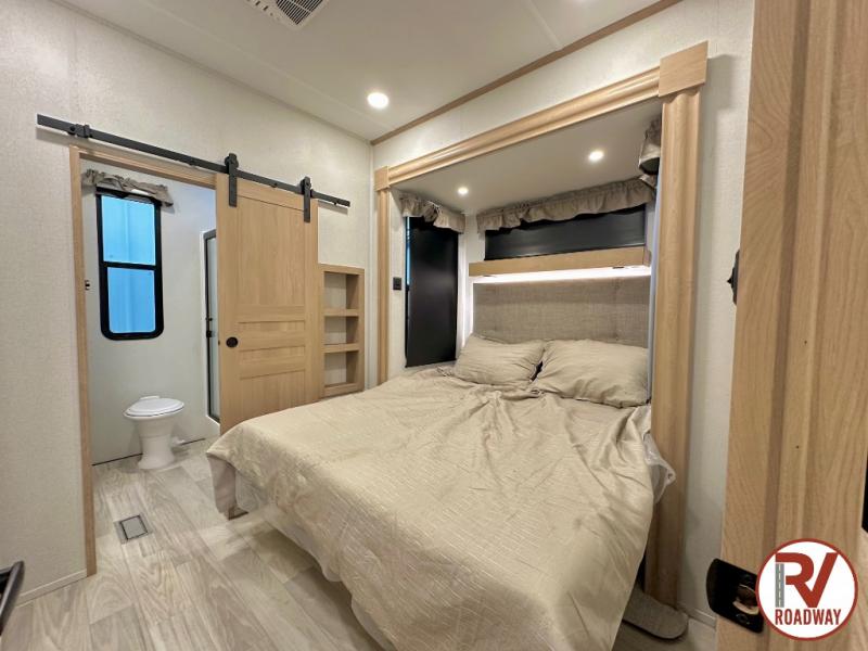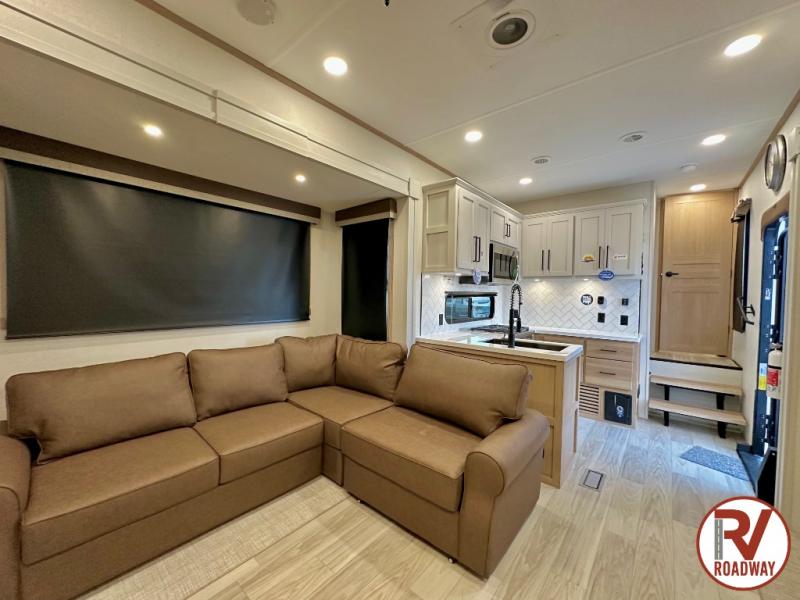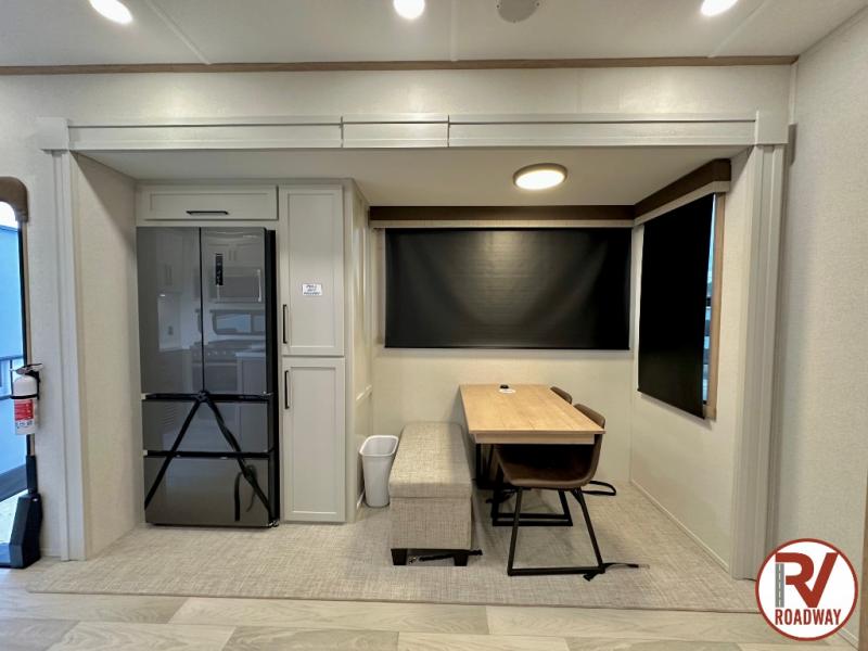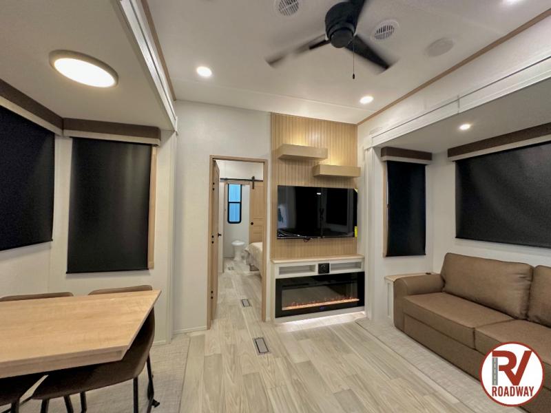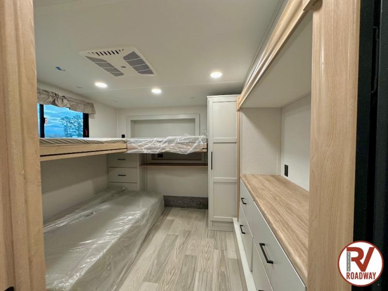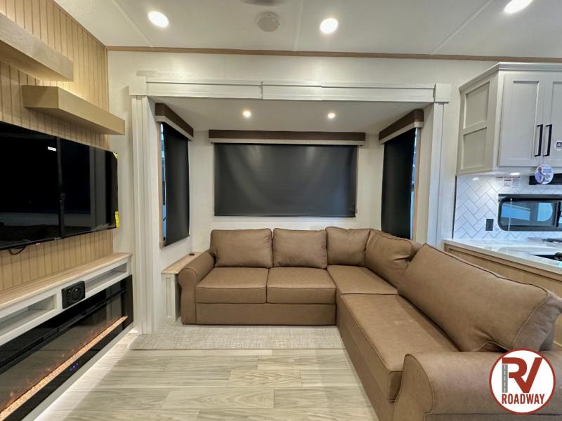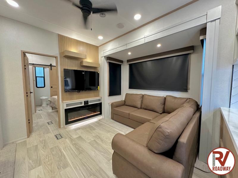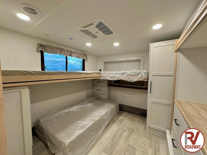 This fifth wheel is thoughtfully designed for comfort and convenience, starting with a spacious front bunkhouse perfect for accommodating guests. It features two flip-up bunks, 28" x 74" and 32" x 74" and a 60" x 74" fold-out lounge, along with a wardrobe, dresser, and additional storage to keep essentials organized. A nearby half bath adds easy access and extra convenience. At the center of the unit, the kitchen offers everything you need to prepare meals, including a stainless-steel sink, three-burner cooktop, and a generous 16 cu. ft. refrigerator. Meals can be enjoyed at the free-standing dinette, or you can unwind on the sectional sofa while enjoying the fireplace or entertainment center. At the rear, you'll find the private main bedroom with a roomy 66" x 80" RV king bed, plus its own wardrobe and dresser. Just steps away is the full bathroom featuring a one-piece fiberglass shower, sink with medicine cabinet, linen storage, and even washer/dryer prep for extended stays.