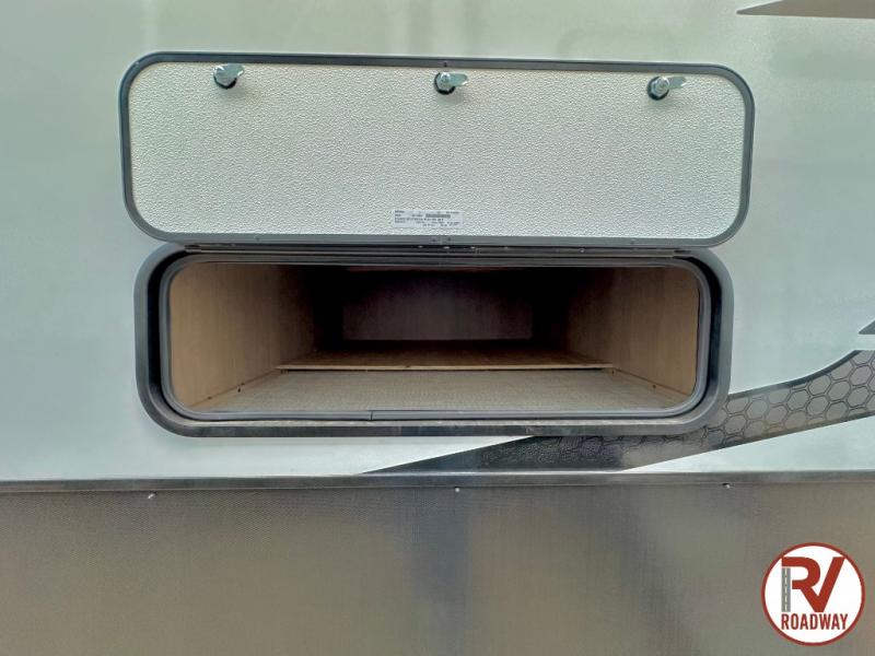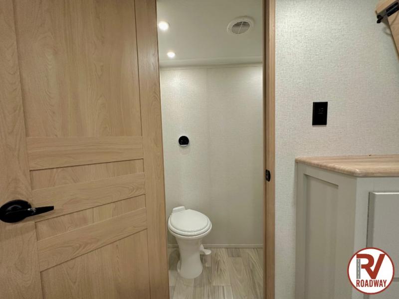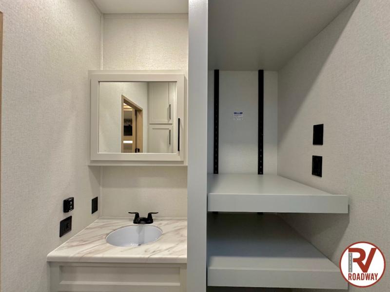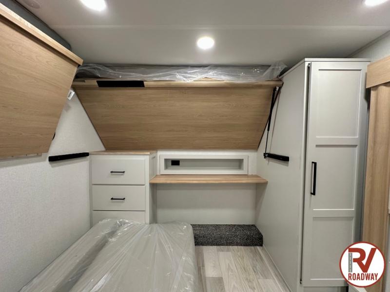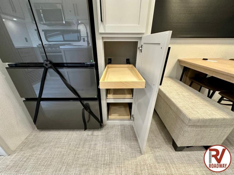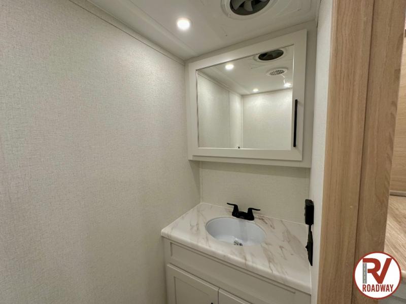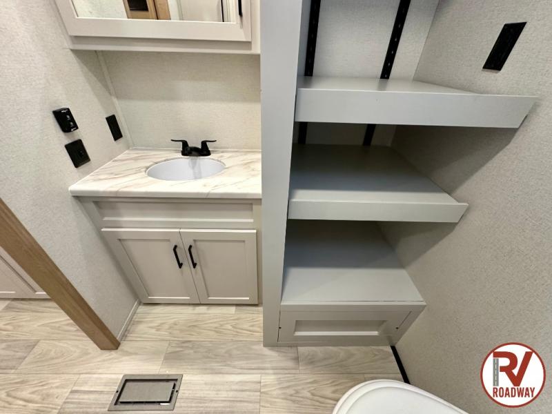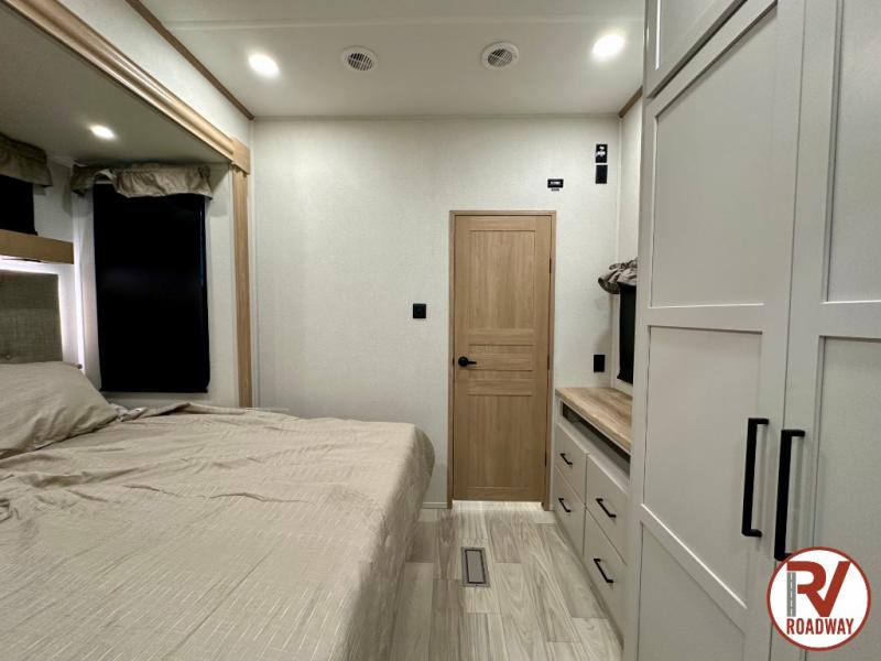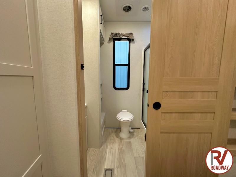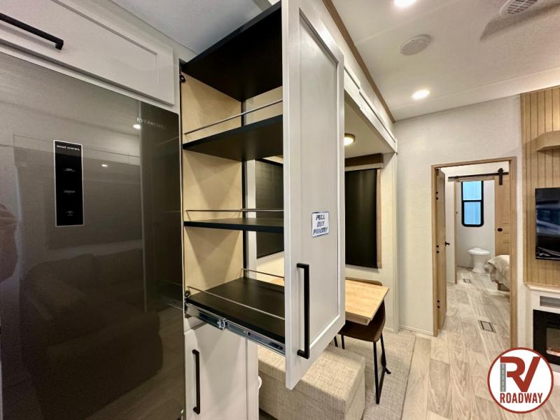 This fifth wheel is thoughtfully designed for comfort and convenience, starting with a spacious front bunkhouse perfect for accommodating guests. It features two flip-up bunks, 28" x 74" and 32" x 74" and a 60" x 74" fold-out lounge, along with a wardrobe, dresser, and additional storage to keep essentials organized. A nearby half bath adds easy access and extra convenience. At the center of the unit, the kitchen offers everything you need to prepare meals, including a stainless-steel sink, three-burner cooktop, and a generous 16 cu. ft. refrigerator. Meals can be enjoyed at the free-standing dinette, or you can unwind on the sectional sofa while enjoying the fireplace or entertainment center. At the rear, you'll find the private main bedroom with a roomy 66" x 80" RV king bed, plus its own wardrobe and dresser. Just steps away is the full bathroom featuring a one-piece fiberglass shower, sink with medicine cabinet, linen storage, and even washer/dryer prep for extended stays.