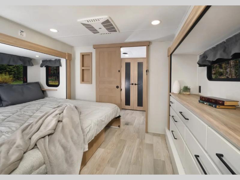 If you're looking to go full-time RVing, this fifth wheel is packed with convenient features! The master bedroom includes a king bed slide out with USB ports on either side of the bed so you both can charge your phones, and there is a dresser for your folded clothes. You will love the front bathroom with dual bath sinks, a shower with a seat, plus a walk-in closet with shelves, rods to hand clothes, and baskets for laundry! There is a unique middle utility room with washer and dryer prep and a rod to hang clothes that will make a perfect laundry room, or you can utilize this space for storage! Head to the main living area to relax on the theater seating or hide-a-bed sofa, and if you have guests stay over, they can sleep here. There is also an entertainment center with a 50" flat screen TV, but you might just leave that off if you're working at the desk with a chair that is provided. We've saved the best part for last; the kitchen! Here, you'll find ample counter space to prep home-cooked meals, a three burner high output range with a 22" oven, plus a large counter with barstools where you can enjoy breakfast at each morning. Choosing this fifth wheel is a no-brainer!