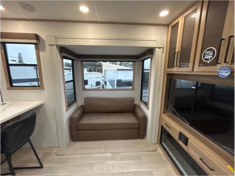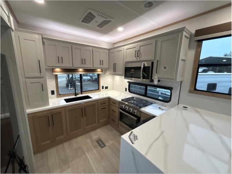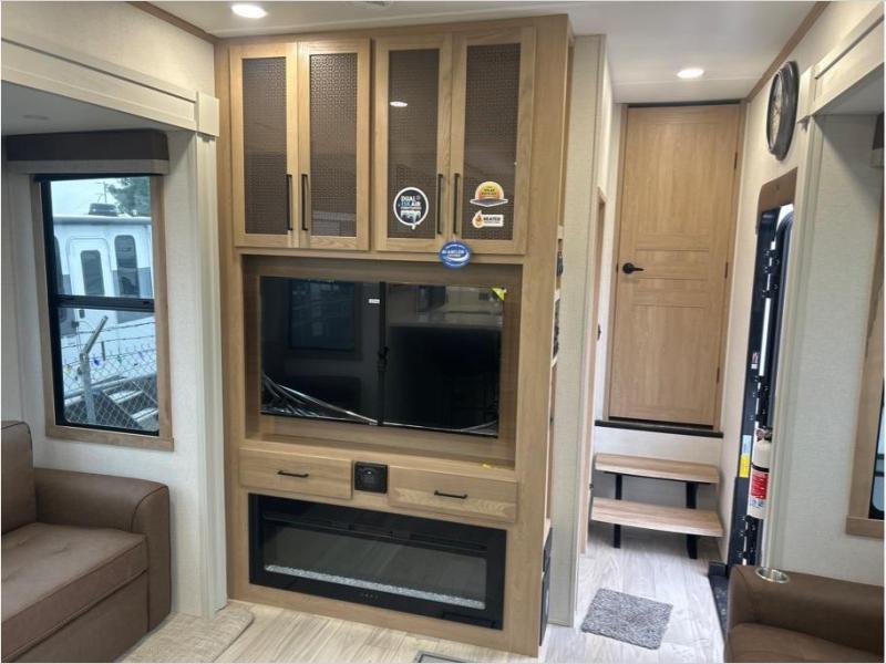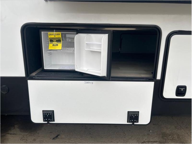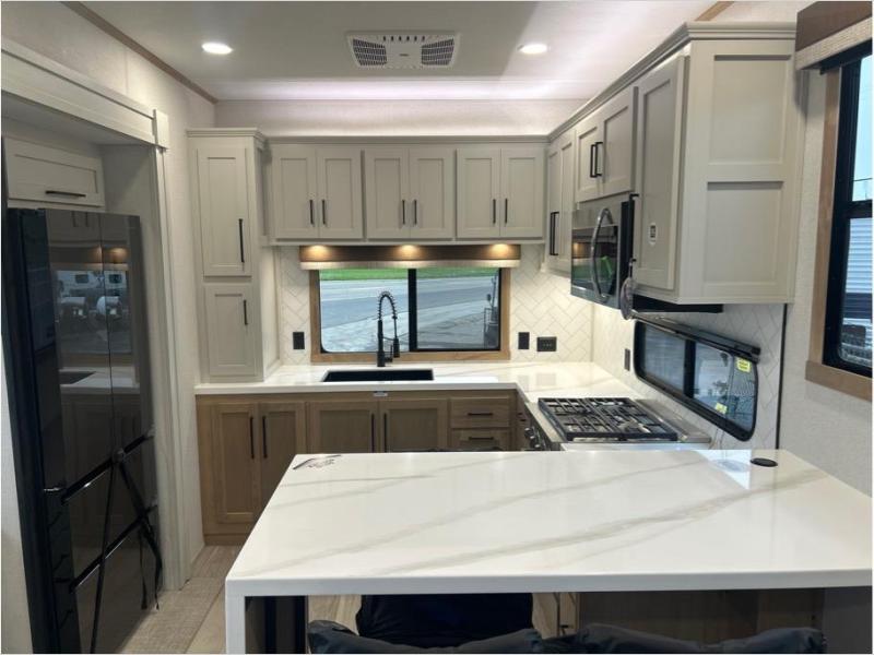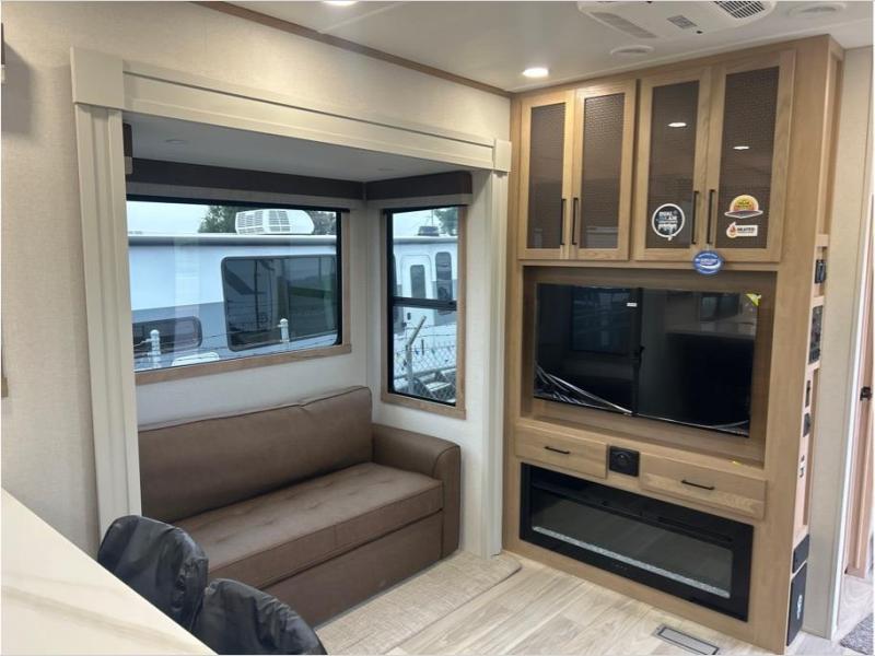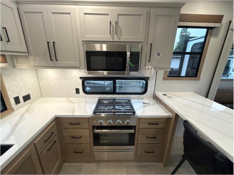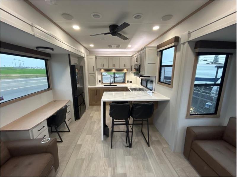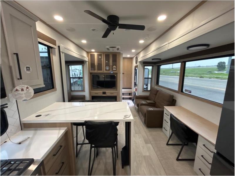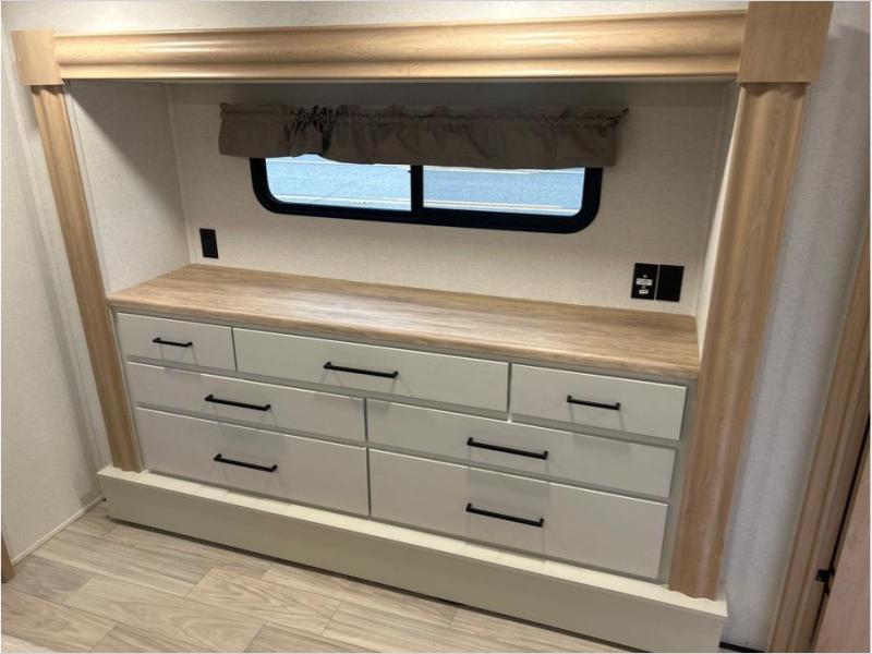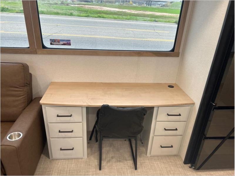 This fifth wheel is packed with convenient features to make your travels more comfortable and enjoyable! The master bedroom includes a king bed slide out with USB ports on either side of the bed so you both can charge your phones, and there is a dresser for your folded clothes. You will love the front bathroom with dual bath sinks, a fiberglass one-piece shower, plus a walk-in closet with shelves and rods to hang clothes! There is a unique middle utility room with washer and dryer prep if you want to add these, a Washer and dryer counter and a rod to hang clothes that will make a perfect laundry room, or you can utilize this space for storage! Head to the main living area to relax on the theater seating or hide-a-bed sofa, and if you have guests stay over, they can sleep here. There is also an entertainment center with a 50" flat screen TV, but you might just leave that off if you're working at the desk with a chair that is provided. We've saved the best part for last, the kitchen! Here, you'll find ample counter space to prep home-cooked meals, a three-burner range with a 24" oven, plus a large counter with barstools where you can enjoy breakfast at each morning. Choosing this fifth wheel is a no-brainer!