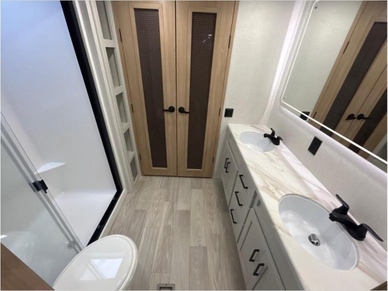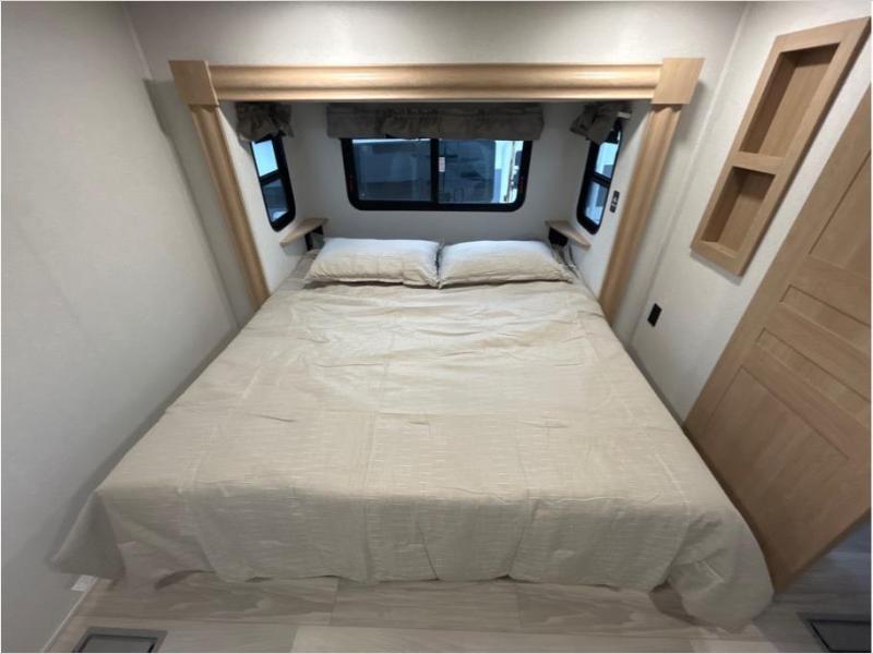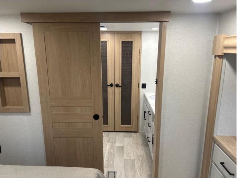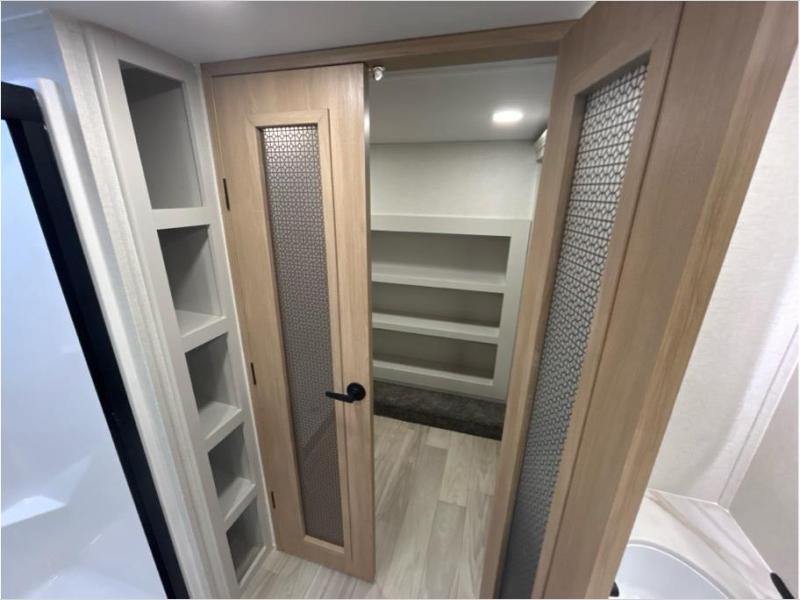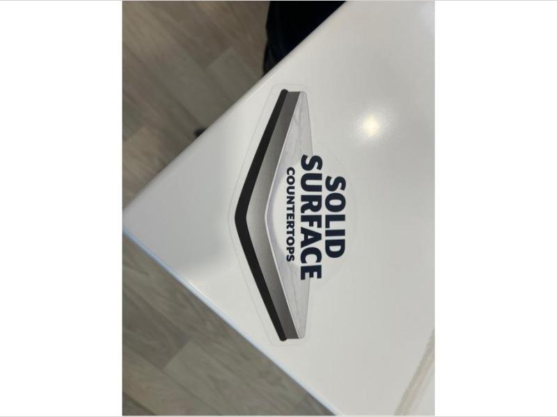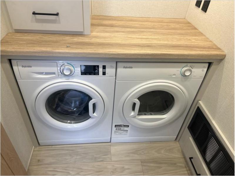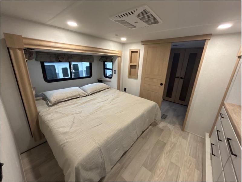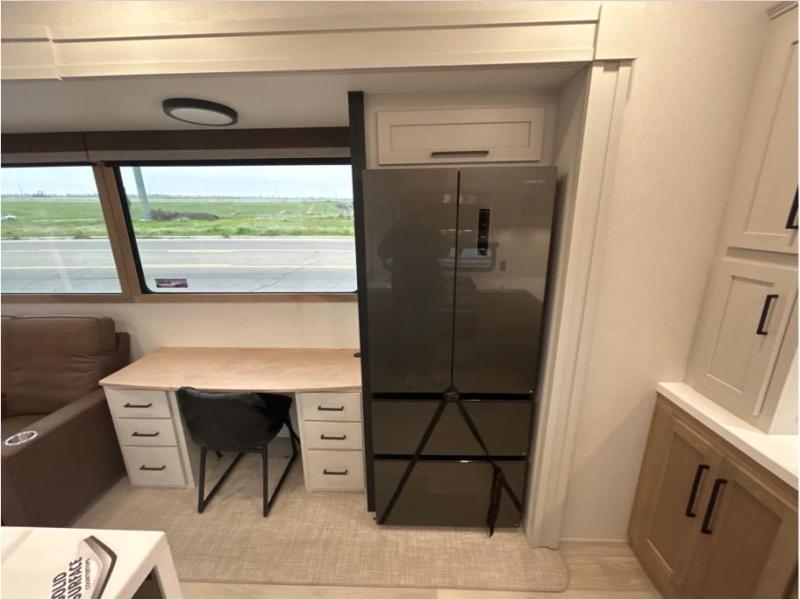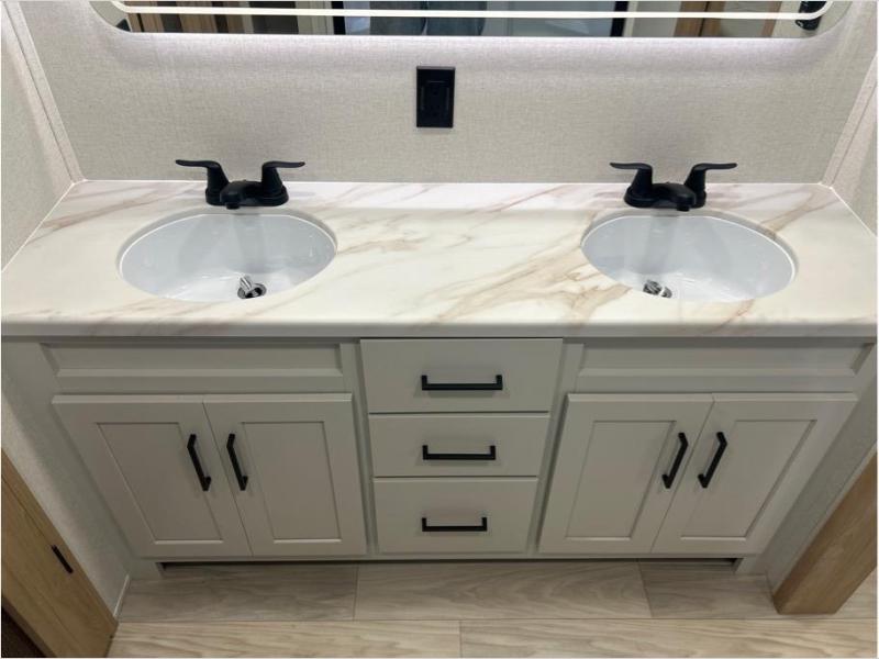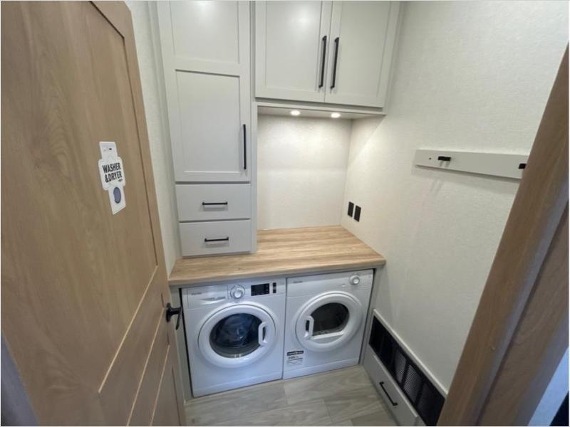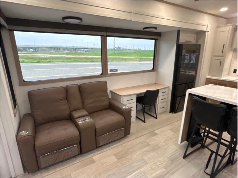 This fifth wheel is packed with convenient features to make your travels more comfortable and enjoyable! The master bedroom includes a king bed slide out with USB ports on either side of the bed so you both can charge your phones, and there is a dresser for your folded clothes. You will love the front bathroom with dual bath sinks, a fiberglass one-piece shower, plus a walk-in closet with shelves and rods to hang clothes! There is a unique middle utility room with washer and dryer prep if you want to add these, a Washer and dryer counter and a rod to hang clothes that will make a perfect laundry room, or you can utilize this space for storage! Head to the main living area to relax on the theater seating or hide-a-bed sofa, and if you have guests stay over, they can sleep here. There is also an entertainment center with a 50" flat screen TV, but you might just leave that off if you're working at the desk with a chair that is provided. We've saved the best part for last, the kitchen! Here, you'll find ample counter space to prep home-cooked meals, a three-burner range with a 24" oven, plus a large counter with barstools where you can enjoy breakfast at each morning. Choosing this fifth wheel is a no-brainer!