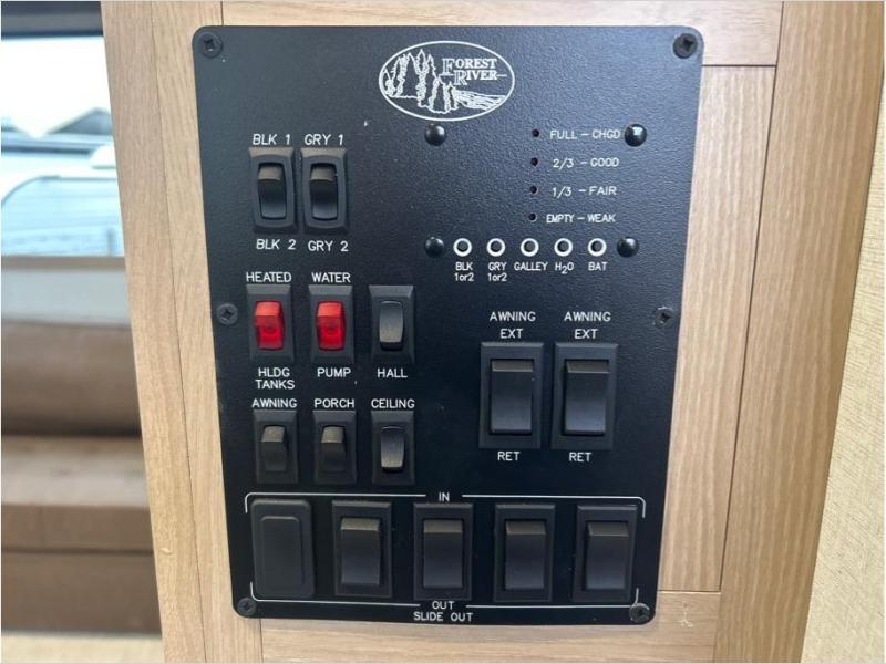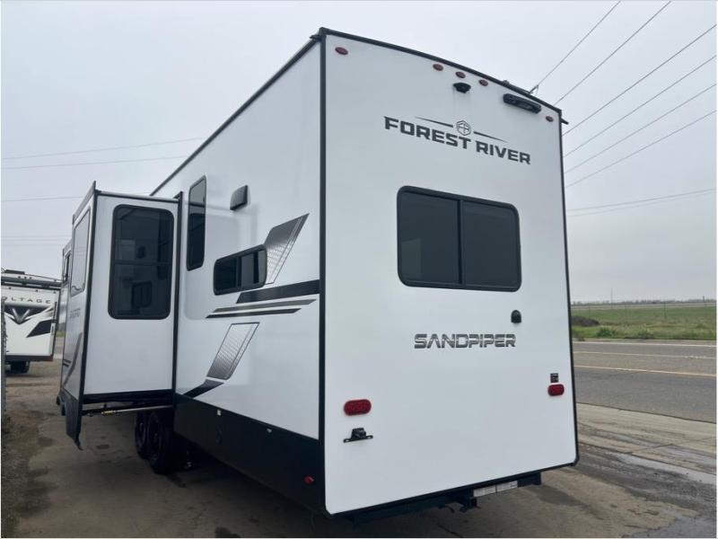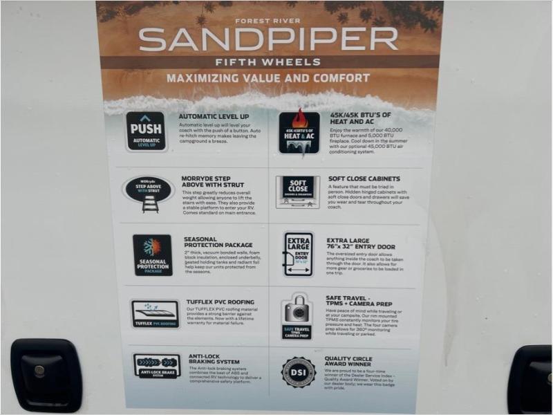 You will find the perfect balance of size, space, features, and luxury with any one of these Forest River Sandpiper fifth wheels! They have a cambered powder coated frame with rust prohibitor, and a fully enclosed underbelly for added protection against the elements. Also, the power front jacks with spring-loaded pins enhance the convenience, speed, and safety. The large, tinted windows come with a 80/20 UV prohibitors. Some hassle-free amenities include a 60k BTU on-demand water heater, porcelain foot flush toilet(s), tire pressure monitor system, and an electric leveling system! Inside, you'll enjoy stainless steel kitchen package, solid surface kitchen countertops, Beachside Sundance Congoleum linoleum, recessed residential lighting, and many more comforts!