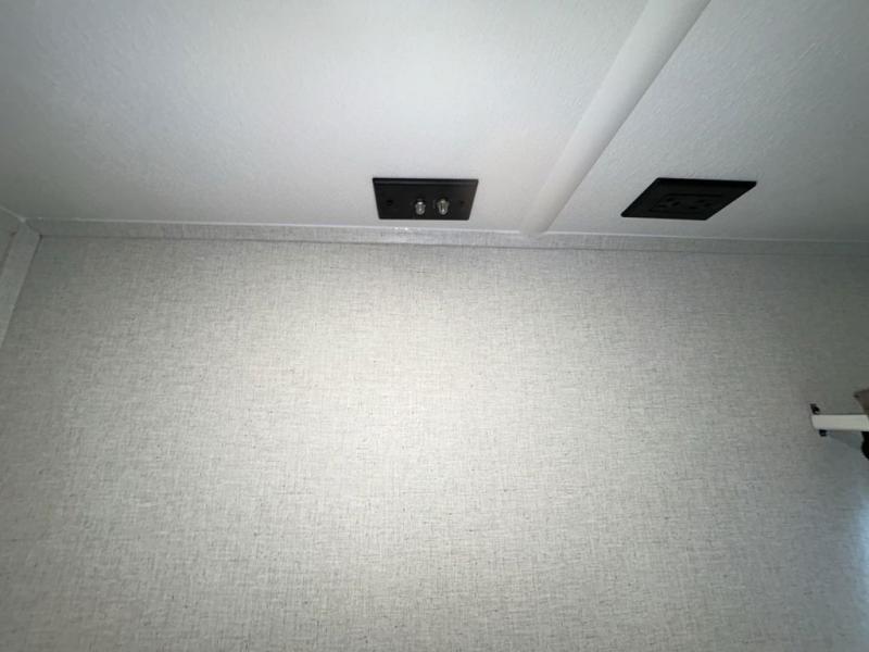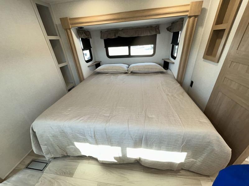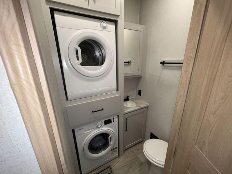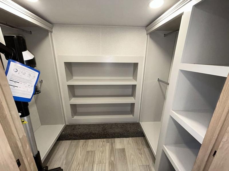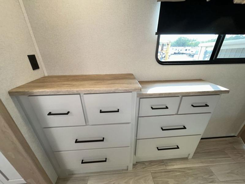 It will be easier than ever to enjoy camping trips in this triple slide out fifth wheel, or even go full-time! The combined kitchen and living area features dual opposing slides for ample space, an L-shaped sofa with a chaise lounge, and a fireplace with a hidden pantry behind for snacks! A desk with a chair and a USB port will provide a place to work if you need to send some emails, and the large kitchen island will give you ample room to prep dinner when you get hungry. There are also pendant lights here, along with a waterfall edge and barstools for dining space. The mid-coach half bath includes a toilet, sink, plus washer and dryer prep, giving you the option to make this the perfect laundry room! The master bedroom up front may be your favorite place to unwind in this unit. There is a king bed slide, a small dresser plus a tall dresser, and a TV hookup if you want the option to watch movies in bed. And you'll be wowed by the front master bedroom with its fiberglass shower with a seat, dual bath sinks, and large walk-in closet!