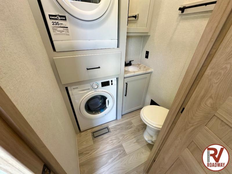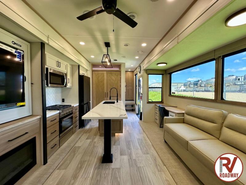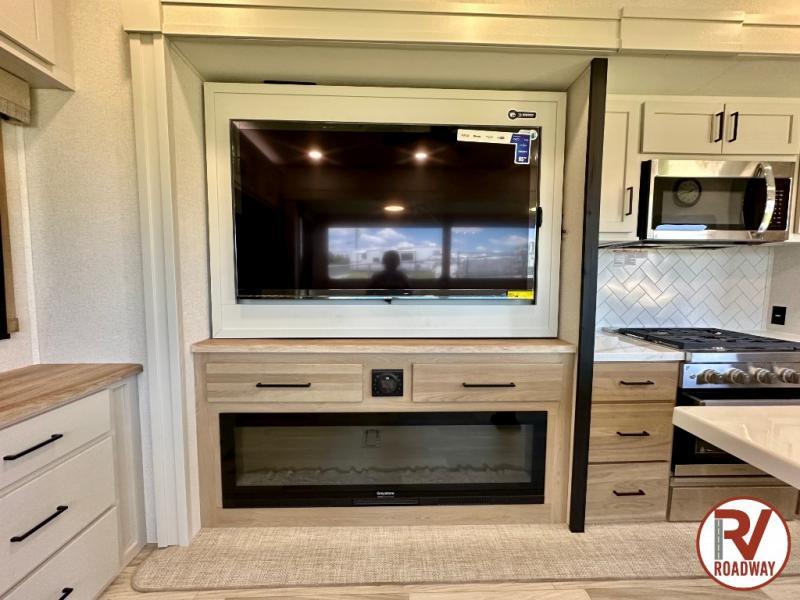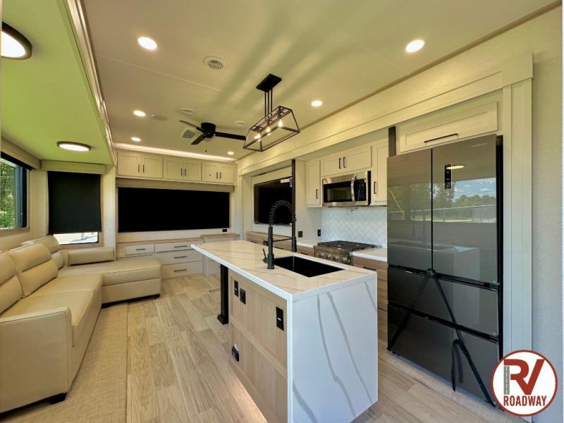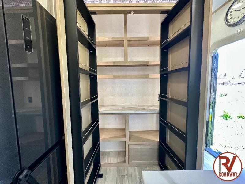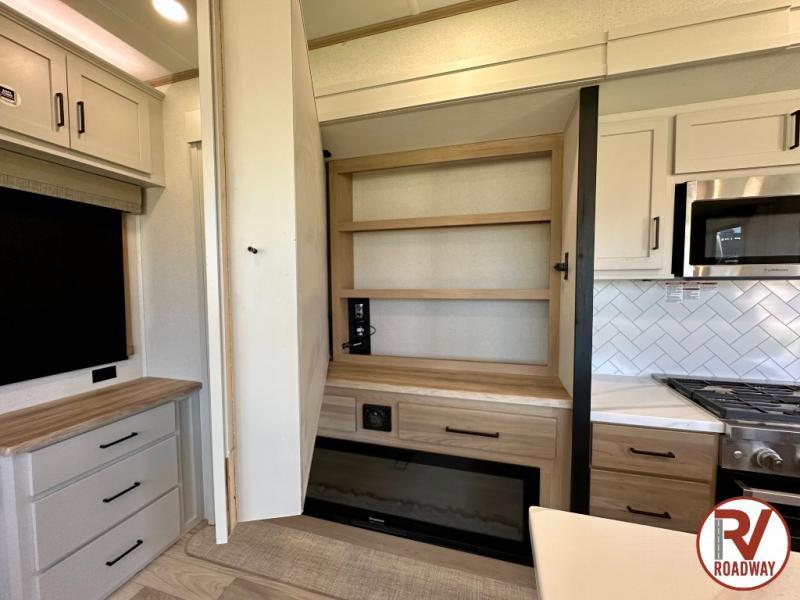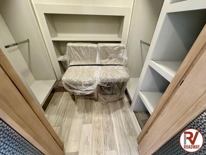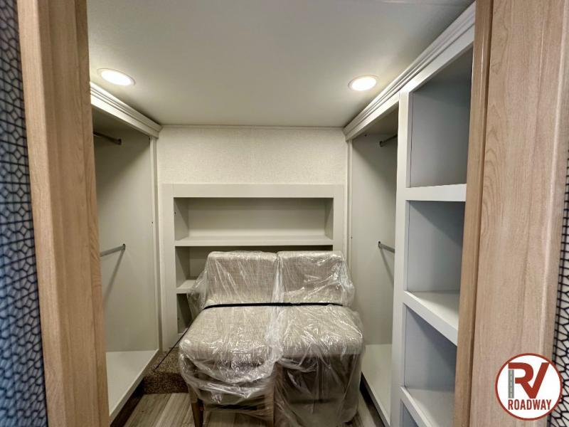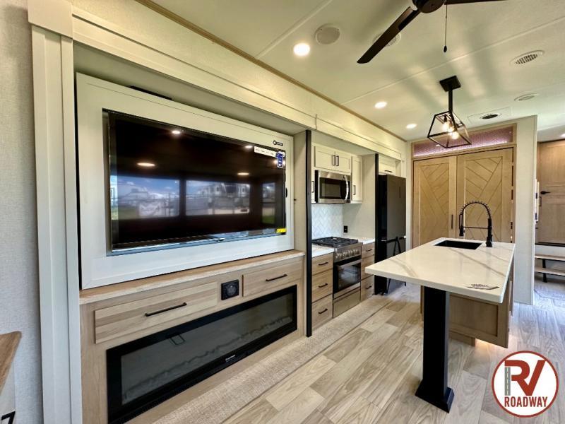 This fifth wheel is perfect for those seeking a comfortable, feature-rich home on wheels. Upon entering, you'll find a spacious rear living room, ideal for relaxation and entertainment. The room features a comfortable chaise lounge, sofa, and an entertainment center with a cozy fireplace. For added convenience, there's a hidden pantry, desk with a chair, and a shelf and cabinet for storage. The kitchen is well-appointed with a stylish kitchen island featuring a beautiful waterfall edge. Overhead cabinets provide ample storage, while the microwave and 12V refrigerator allow for easy meal prep. Plus, a butler pantry offers additional storage for kitchen essentials. A convenient half bath is located nearby, complete with a stackable washer and dryer prep if you want the option to add these appliances. The bedroom retreat features a comfortable king bed, a small dresser, and a tall dresser with a TV hookup. The adjacent walk-in bathroom closet boasts a one-piece fiberglass shower, dual sink, medicine cabinet, linen closet, and ample storage thanks to the various shelves, perfect for keeping your belongings organized. Exterior features include two awnings, one 12’ and the other 18’, providing ample shade and protection.