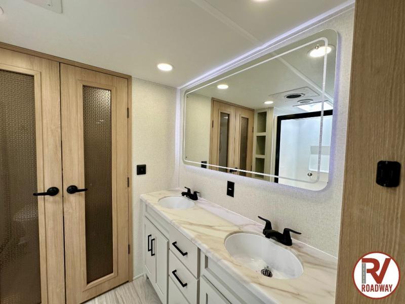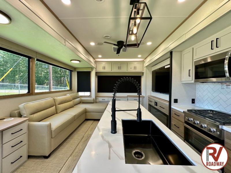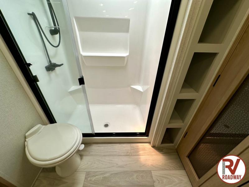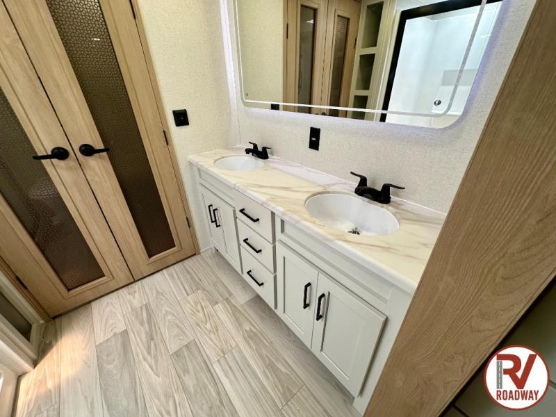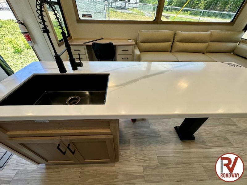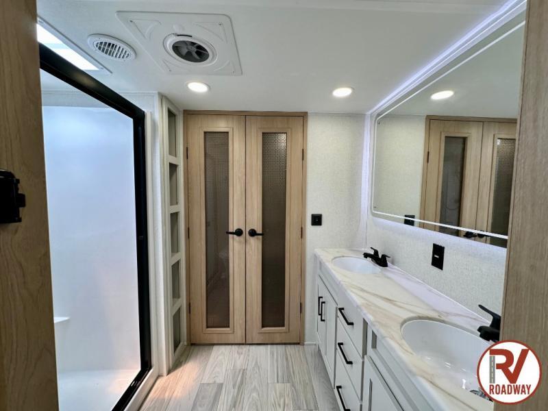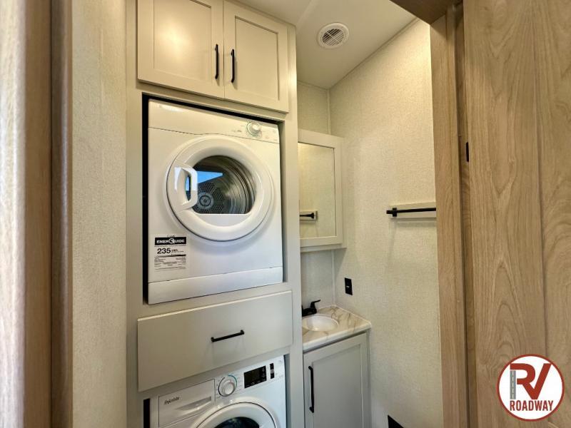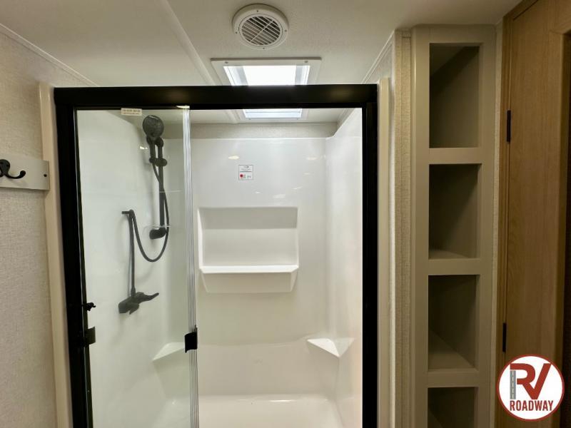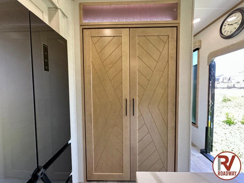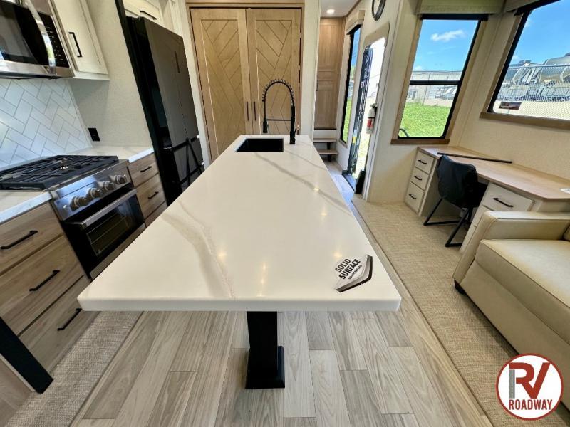 This fifth wheel is perfect for those seeking a comfortable, feature-rich home on wheels. Upon entering, you'll find a spacious rear living room, ideal for relaxation and entertainment. The room features a comfortable chaise lounge, sofa, and an entertainment center with a cozy fireplace. For added convenience, there's a hidden pantry, desk with a chair, and a shelf and cabinet for storage. The kitchen is well-appointed with a stylish kitchen island featuring a beautiful waterfall edge. Overhead cabinets provide ample storage, while the microwave and 12V refrigerator allow for easy meal prep. Plus, a butler pantry offers additional storage for kitchen essentials. A convenient half bath is located nearby, complete with a stackable washer and dryer prep if you want the option to add these appliances. The bedroom retreat features a comfortable king bed, a small dresser, and a tall dresser with a TV hookup. The adjacent walk-in bathroom closet boasts a one-piece fiberglass shower, dual sink, medicine cabinet, linen closet, and ample storage thanks to the various shelves, perfect for keeping your belongings organized. Exterior features include two awnings, one 12’ and the other 18’, providing ample shade and protection.