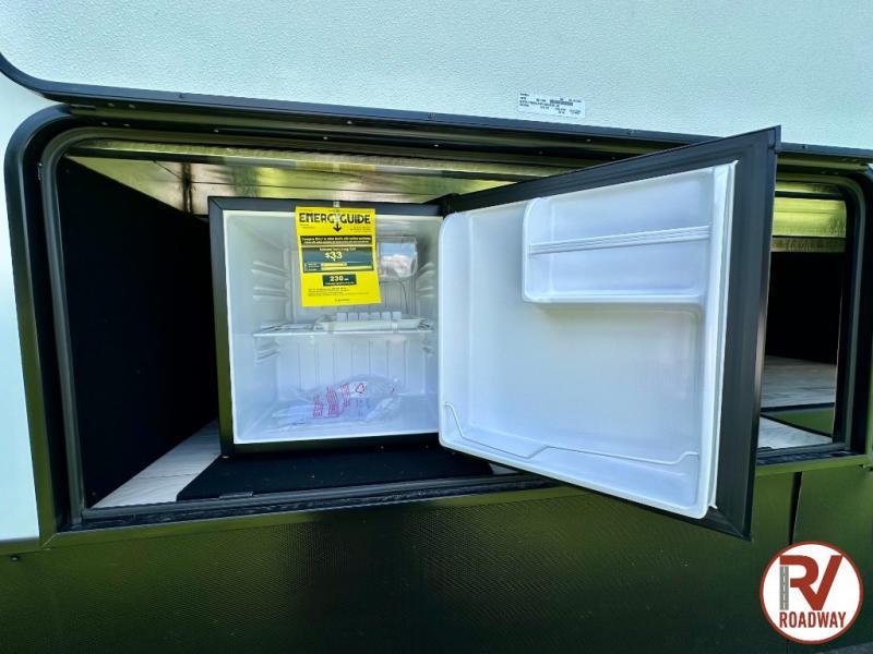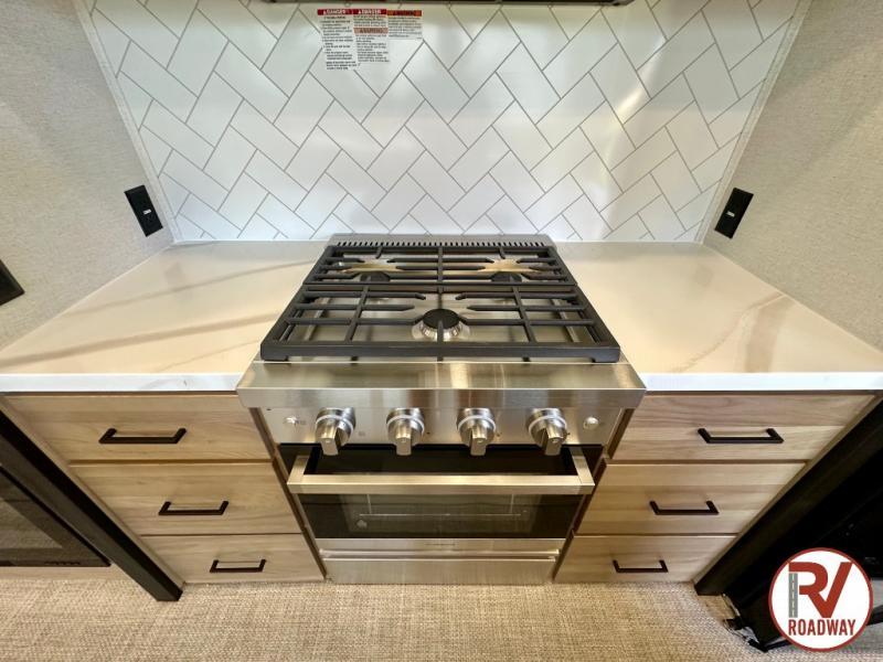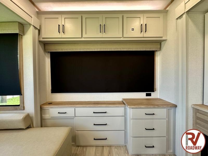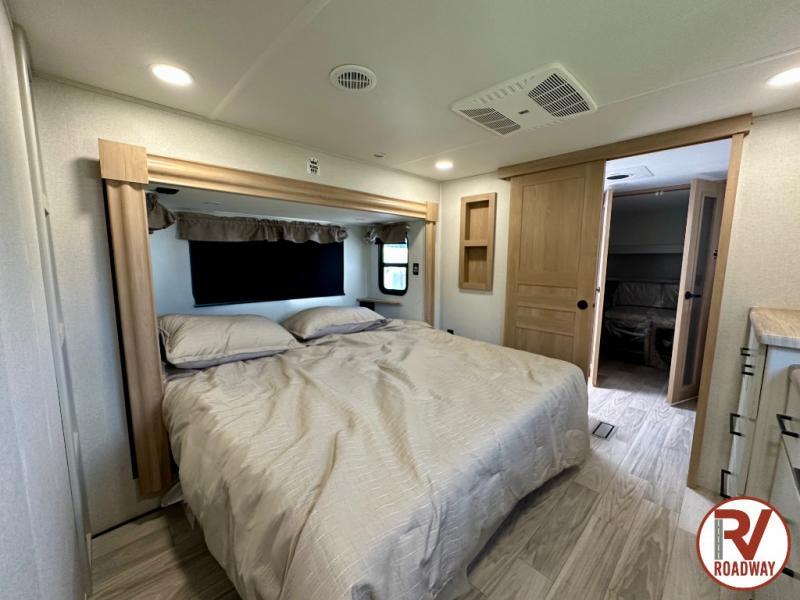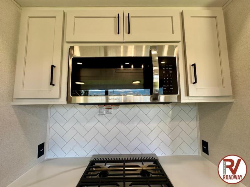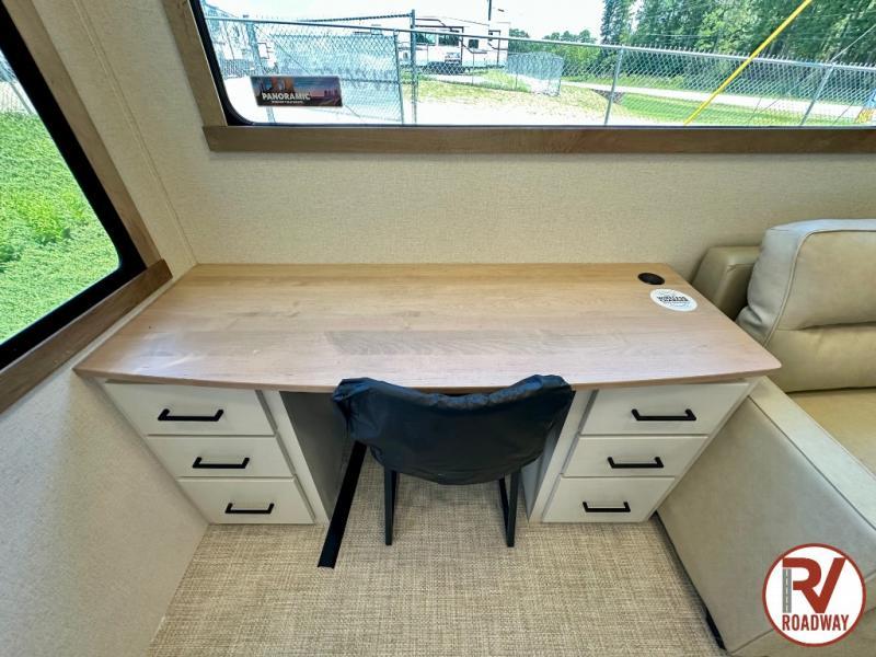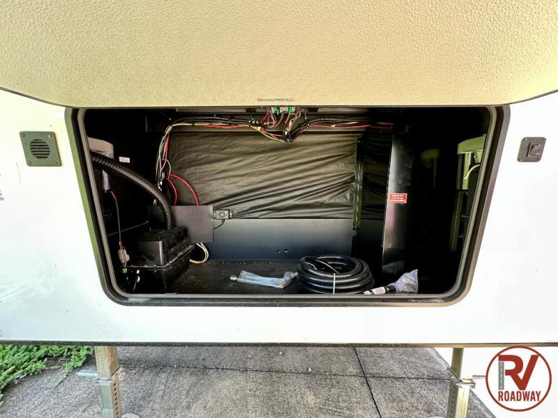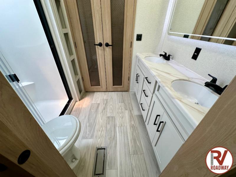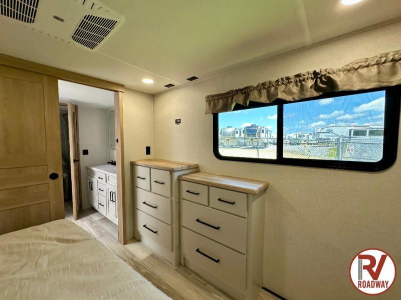 This fifth wheel is perfect for those seeking a comfortable, feature-rich home on wheels. Upon entering, you'll find a spacious rear living room, ideal for relaxation and entertainment. The room features a comfortable chaise lounge, sofa, and an entertainment center with a cozy fireplace. For added convenience, there's a hidden pantry, desk with a chair, and a shelf and cabinet for storage. The kitchen is well-appointed with a stylish kitchen island featuring a beautiful waterfall edge. Overhead cabinets provide ample storage, while the microwave and 12V refrigerator allow for easy meal prep. Plus, a butler pantry offers additional storage for kitchen essentials. A convenient half bath is located nearby, complete with a stackable washer and dryer prep if you want the option to add these appliances. The bedroom retreat features a comfortable king bed, a small dresser, and a tall dresser with a TV hookup. The adjacent walk-in bathroom closet boasts a one-piece fiberglass shower, dual sink, medicine cabinet, linen closet, and ample storage thanks to the various shelves, perfect for keeping your belongings organized. Exterior features include two awnings, one 12’ and the other 18’, providing ample shade and protection.