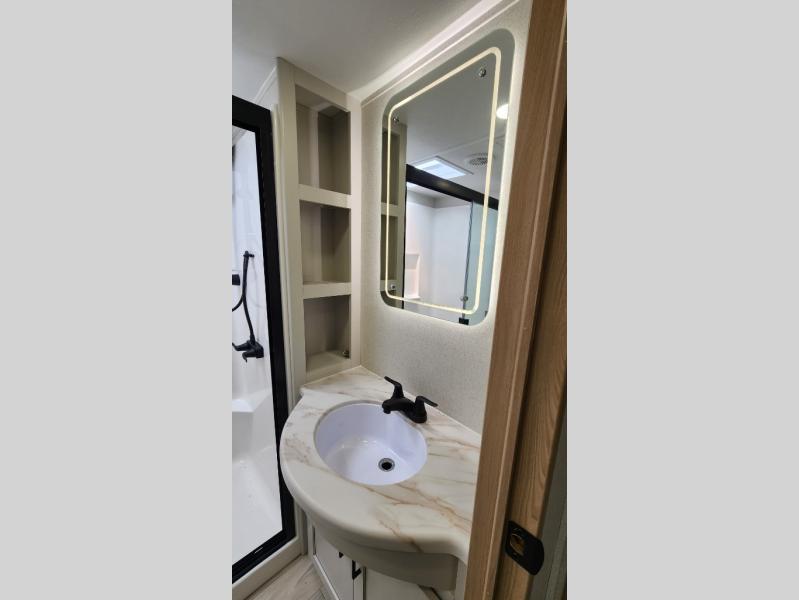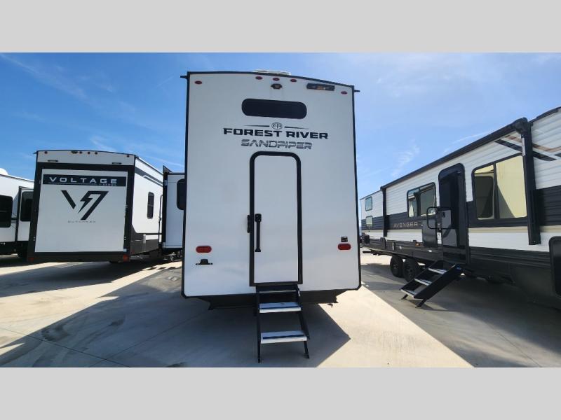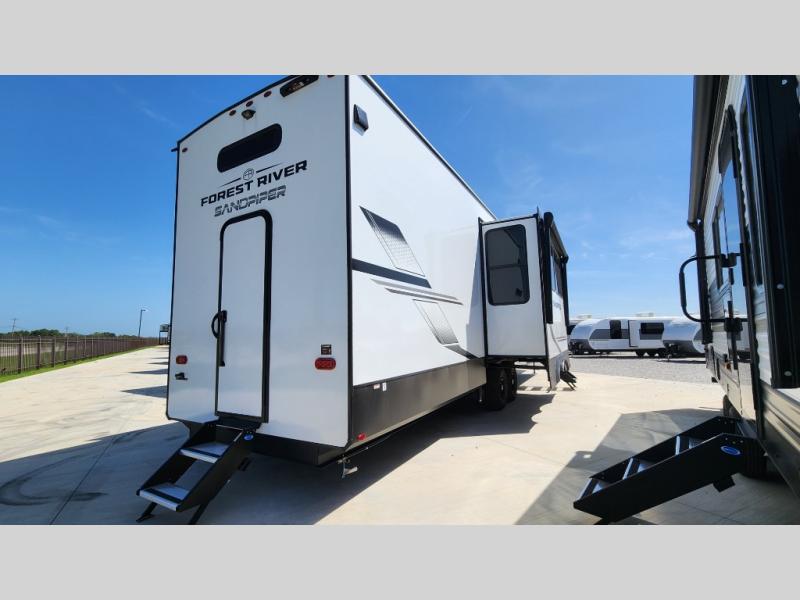 You will find the perfect balance of size, space, features, and luxury with any one of these Forest River Sandpiper fifth wheels! They are constructed with a welded aluminum framed vacuum bonded laminated superstructure, a cambered powder coated frame with rust prohibitor, and a fully enclosed underbelly for added protection against the elements. The large tinted windows come with a 80/20 UV prohibitor or you can choose the optional dual pane windows. Some hassle-free amenities include a 60k BTU on-demand water heater, full coach water filter system, tire pressure monitor system, and an electric leveling system! Inside, you'll enjoy stainless steel appliances, solid surface countertops, Beachside Sundance linoleum, recessed residential lighting, and many more comforts!