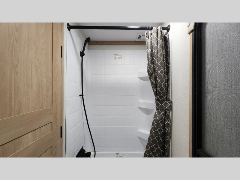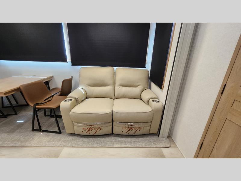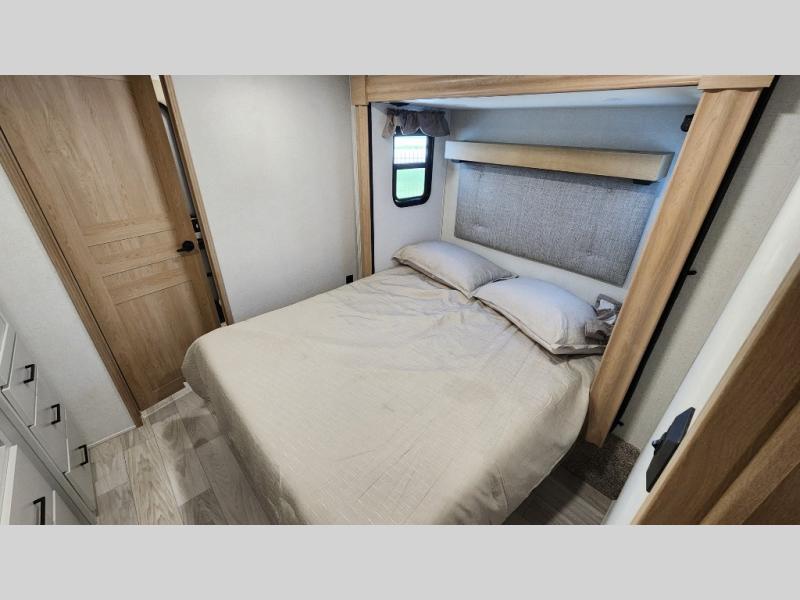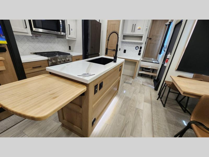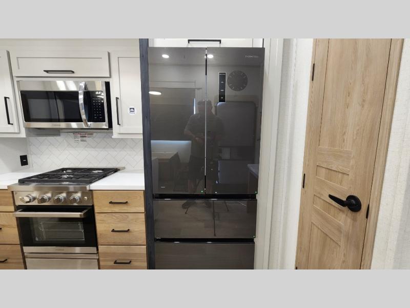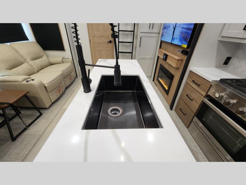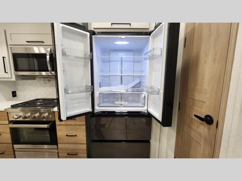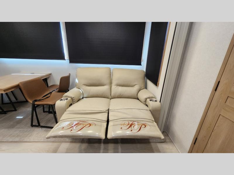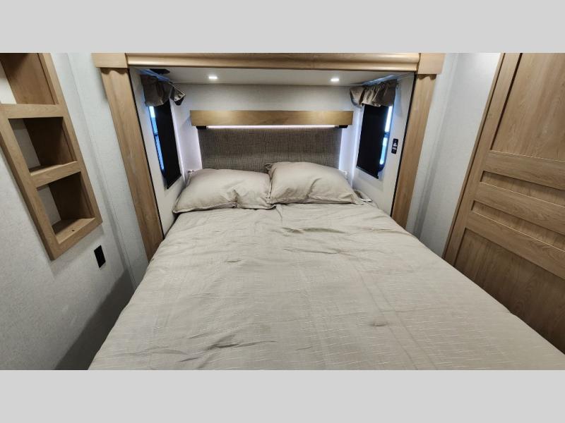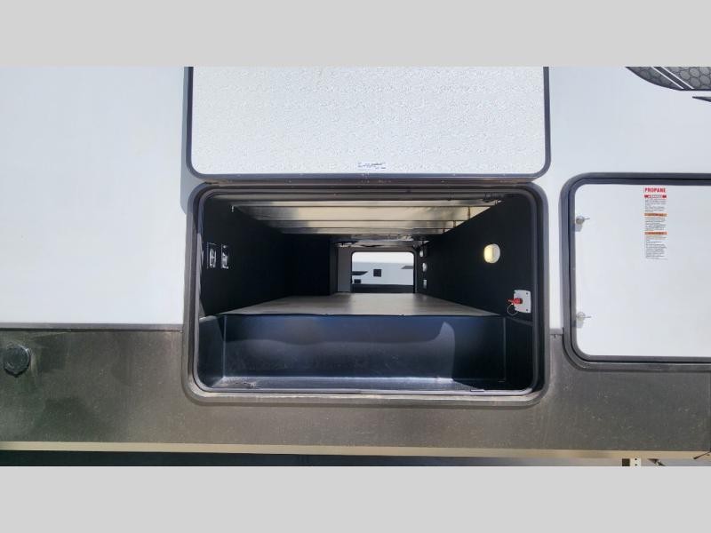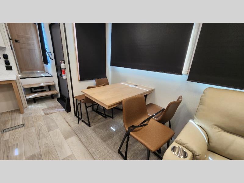 Weekend camping trips and full-time RV living is made complete in this quad slide out fifth wheel. Your crew can relax under the two power awnings, or head inside to enjoy the fireplace. There is also a 50" flat screen TV across from the theater seating, plus a free-standing dinette to dine at. There are two full baths with the front bath including a walk-in shower with a seat for your comfort, and the front private bedroom will feel just like home with its queen bed and large front wardrobe. There is even washer and dryer prep to make laundry day easier than ever. The master bedroom in back includes a second queen bed slide out, and the rear full bath has another convenience with it's exterior entry door, and