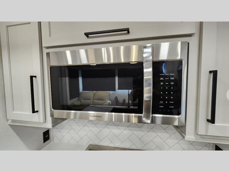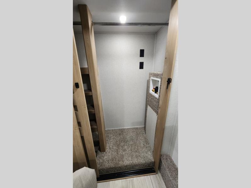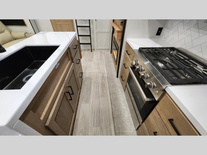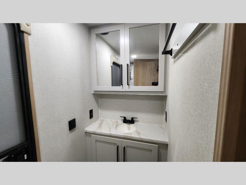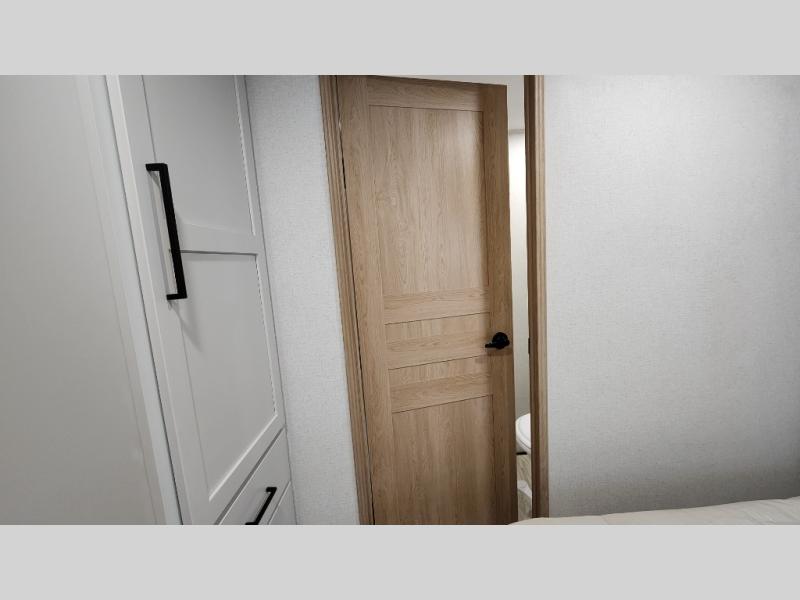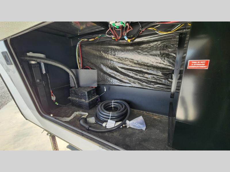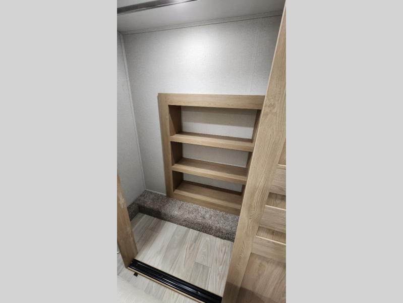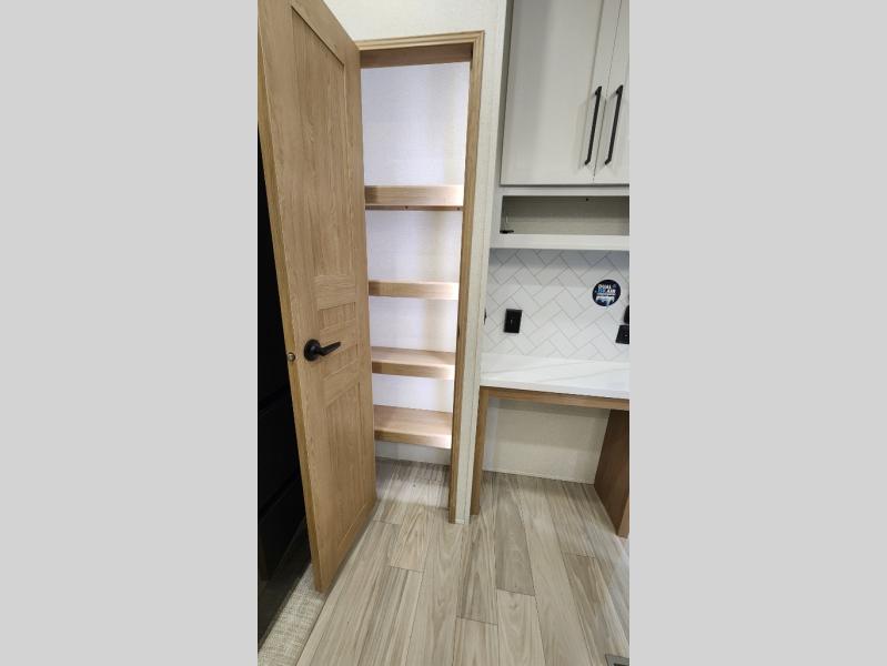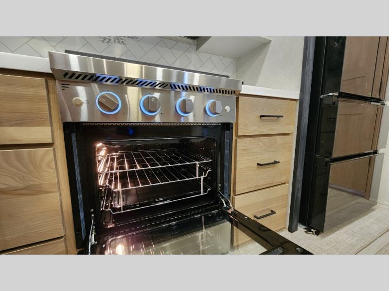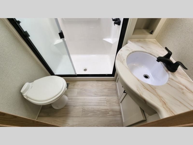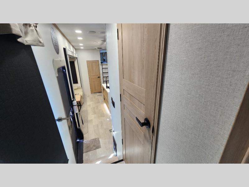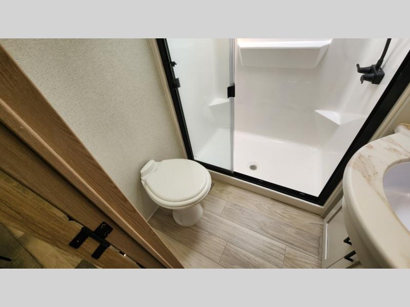 Weekend camping trips and full-time RV living is made complete in this quad slide out fifth wheel. Your crew can relax under the two power awnings, or head inside to enjoy the fireplace. There is also a 50" flat screen TV across from the theater seating, plus a free-standing dinette to dine at. There are two full baths with the front bath including a walk-in shower with a seat for your comfort, and the front private bedroom will feel just like home with its queen bed and large front wardrobe. There is even washer and dryer prep to make laundry day easier than ever. The master bedroom in back includes a second queen bed slide out, and the rear full bath has another convenience with it's exterior entry door, and