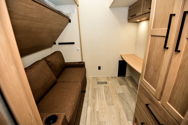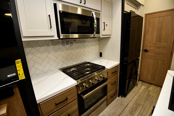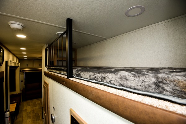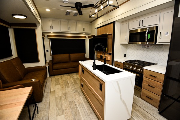 Pick your favorite camping spot and head out for relaxing weekends in this four slide out fifth wheel! You will feel at home in the front private bedroom with its king bed slide out, large front wardrobe with shelves, plus washer and dryer prep if you plan to go full-time. Your guests can make their beds in the middle bunkroom that includes a hide-a-bed sofa with a bunk above, plus a desk if you choose to make this room an office. There is even a loft above this room for more sleeping or storage space. Everyone will love to meet in the middle living area that includes a rear hide-a-bed sofa, theater seating across from the entertainment center, and a free-standing table and chairs for dining. And the chef will enjoy having a kitchen island for more prep space, along with a 12V refrigerator and a three burner high range with a 24" oven. Don't overlook the exterior with an outside kitchen, 20' power awning, and pass-through storage!