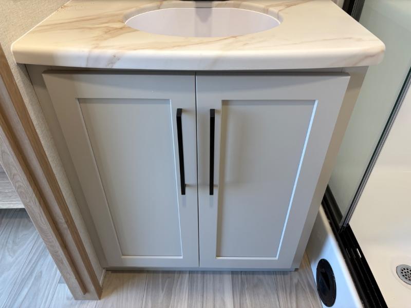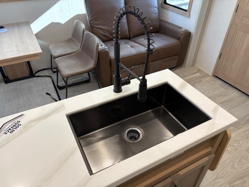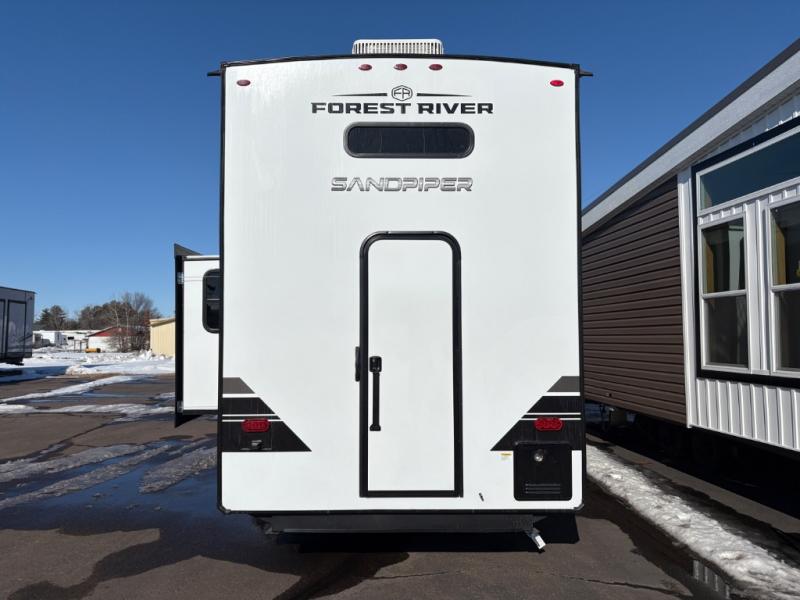 With each Sandpiper Destination Trailer by Forest River you will enjoy many luxurious features, such as crown molding over the kitchen cabinets, solid surface kitchen countertops, a memory foam mattress, plus so much more. The extra large picture windows throughout let natural light in and provide beautiful outdoor views, and each model includes three or more slides for added interior space. You'll find many exterior conveniences, like the porch light with an interior switch, the rain gutters with extra long drip spouts to prevent black streaking, and an electric awning with LED light strip, plus more! You will stay comfortable year around with dual 15,000 A/C units plus each model is constructed with an Underbelly Armor for better protection and insulation!