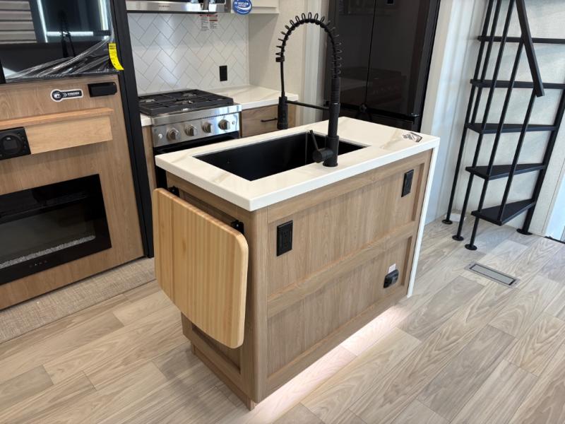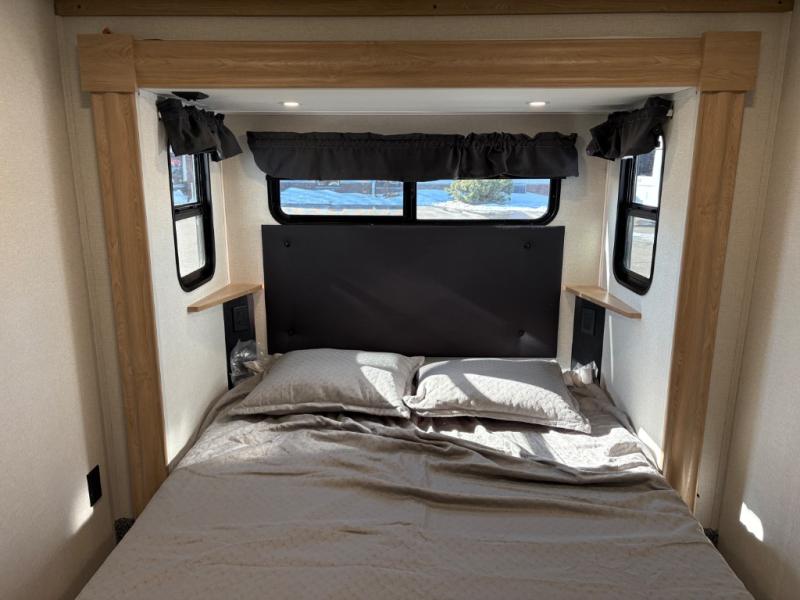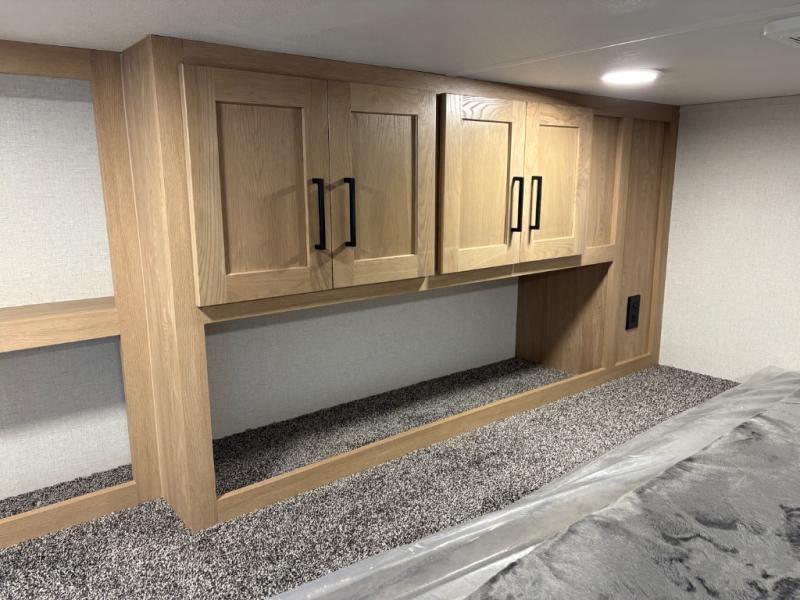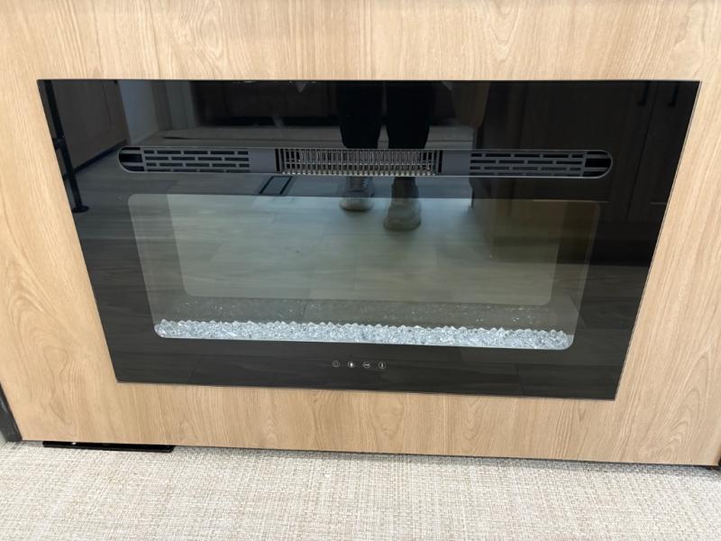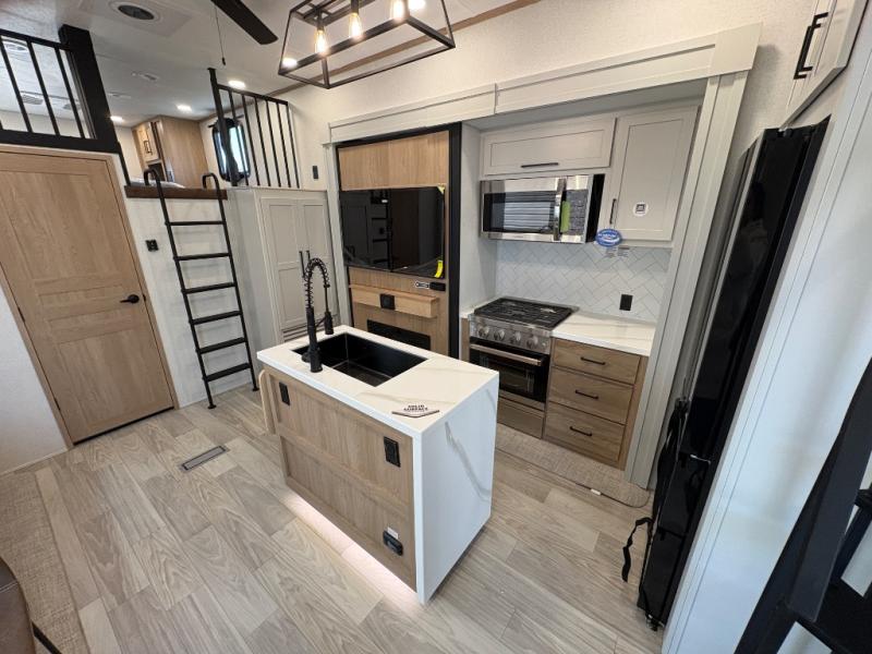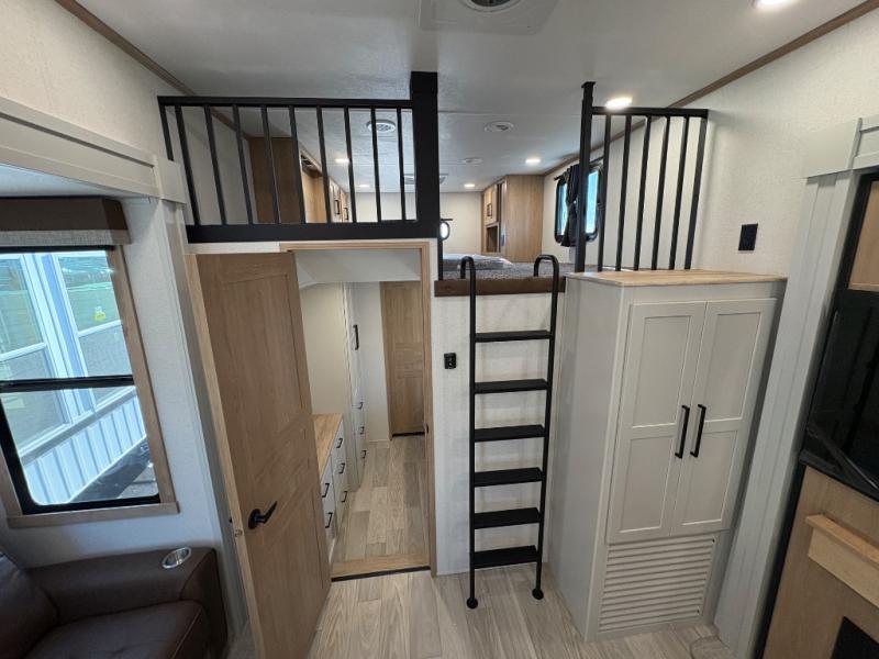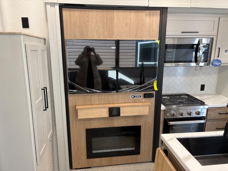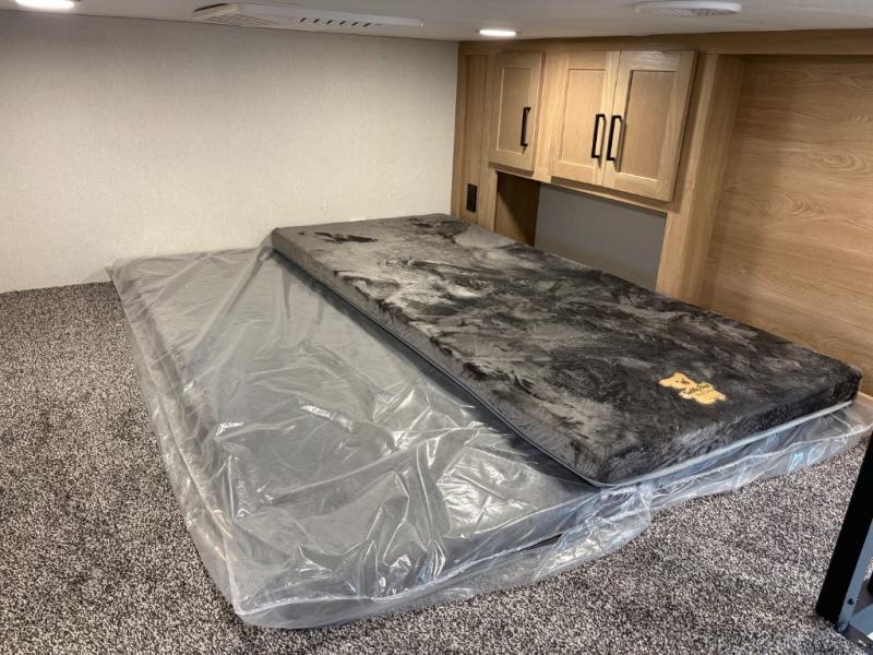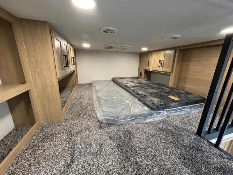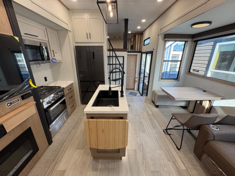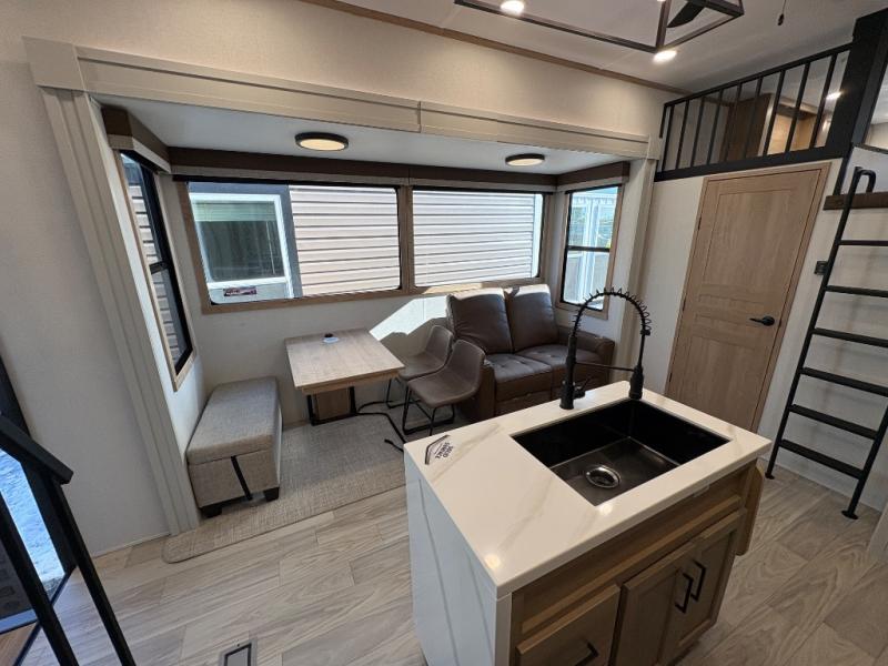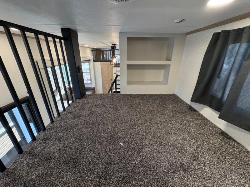 You won't believe the comfort and convenience found in this destination trailer. There are two private bedrooms; one up front with a queen bed slide out and storage space, and one in back with a queen bed slide out and a half bath! There is even washer and dryer prep here if you want to add those appliances and the second entry door is also found in this location so you can easily slip out in the morning. Above each of these rooms is a loft providing three total bunk mats for sleeping, storage cabinets, and TV prep if you want to add entertainment. Everyone can meet in the combined kitchen and living room that includes dual opposing slides, a 60" theater seating across from a 50" flat screen TV and fireplace, plus a free-standing table with chairs and a bench to dine at. The chef of your group will love the large kitchen island, Chef Collection three burner range, and a 16.2 cu. ft. refrigerator for food storage.