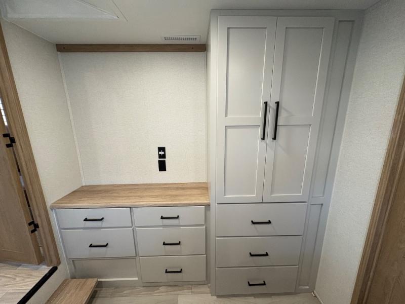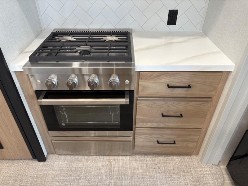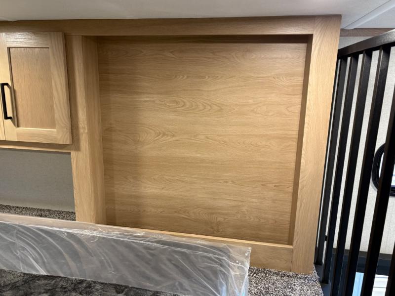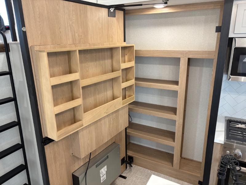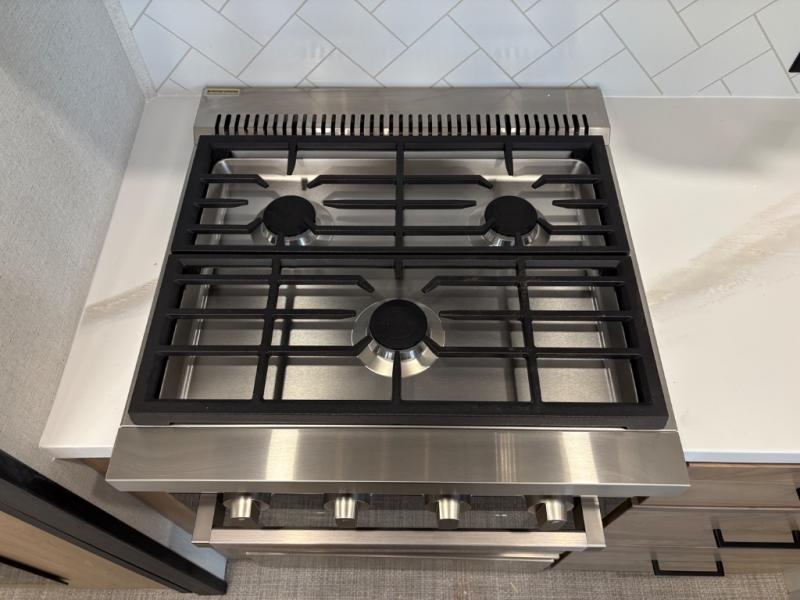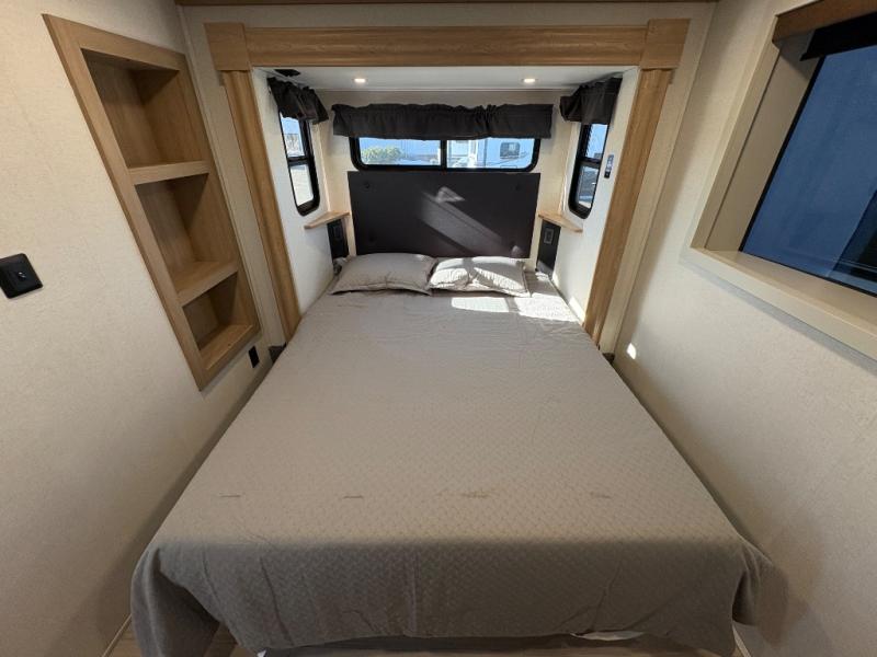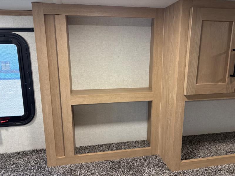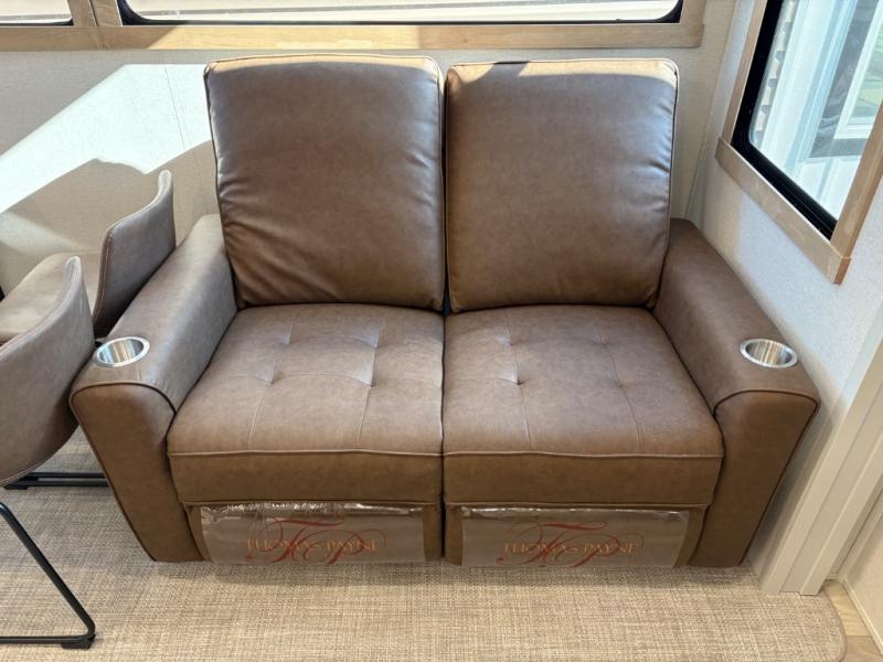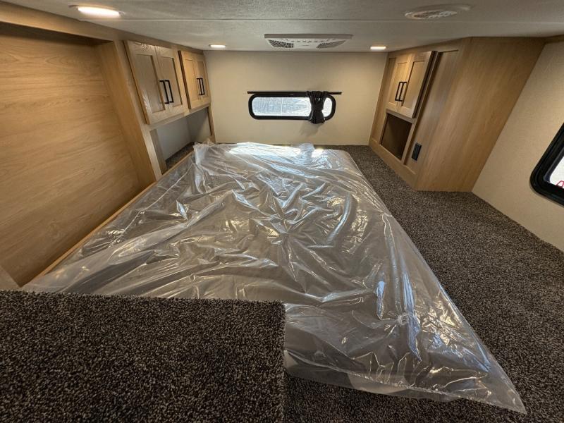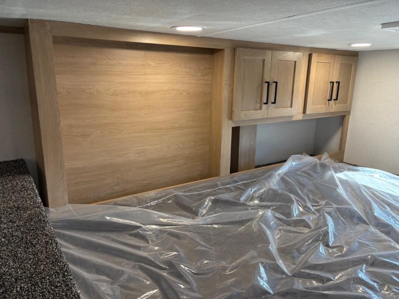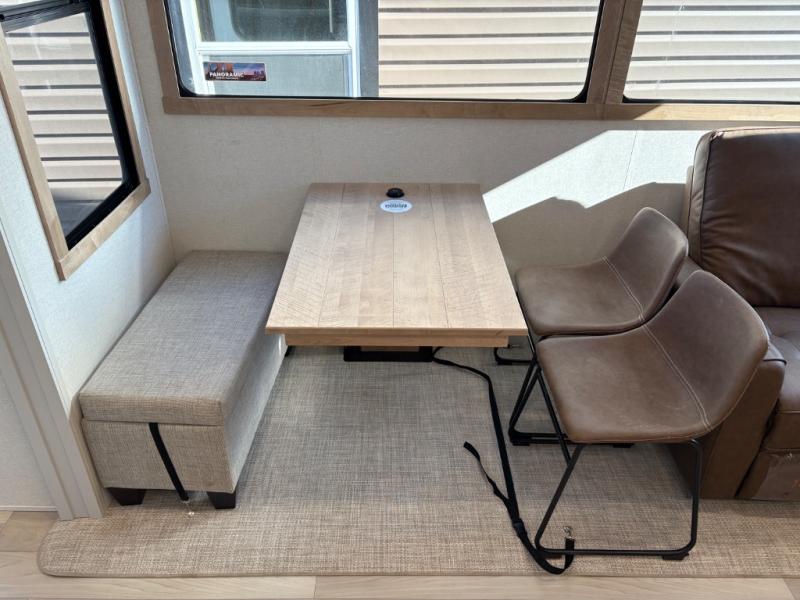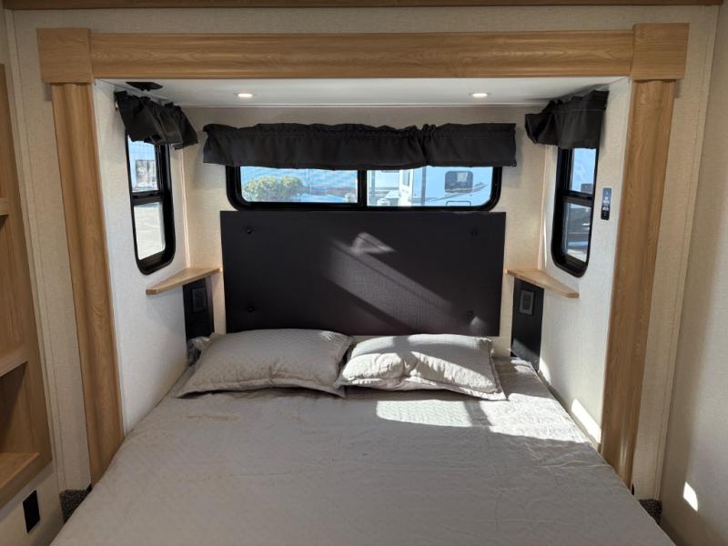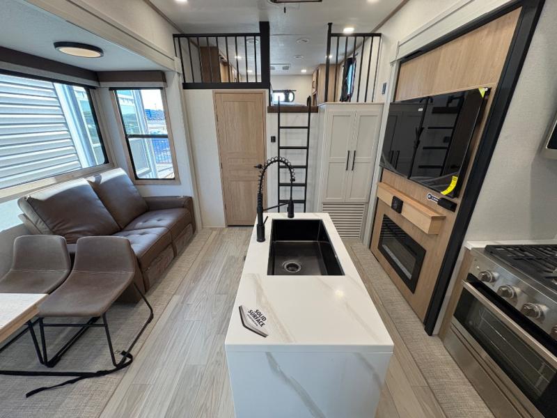 You won't believe the comfort and convenience found in this destination trailer. There are two private bedrooms; one up front with a queen bed slide out and storage space, and one in back with a queen bed slide out and a half bath! There is even washer and dryer prep here if you want to add those appliances and the second entry door is also found in this location so you can easily slip out in the morning. Above each of these rooms is a loft providing three total bunk mats for sleeping, storage cabinets, and TV prep if you want to add entertainment. Everyone can meet in the combined kitchen and living room that includes dual opposing slides, a 60" theater seating across from a 50" flat screen TV and fireplace, plus a free-standing table with chairs and a bench to dine at. The chef of your group will love the large kitchen island, Chef Collection three burner range, and a 16.2 cu. ft. refrigerator for food storage.