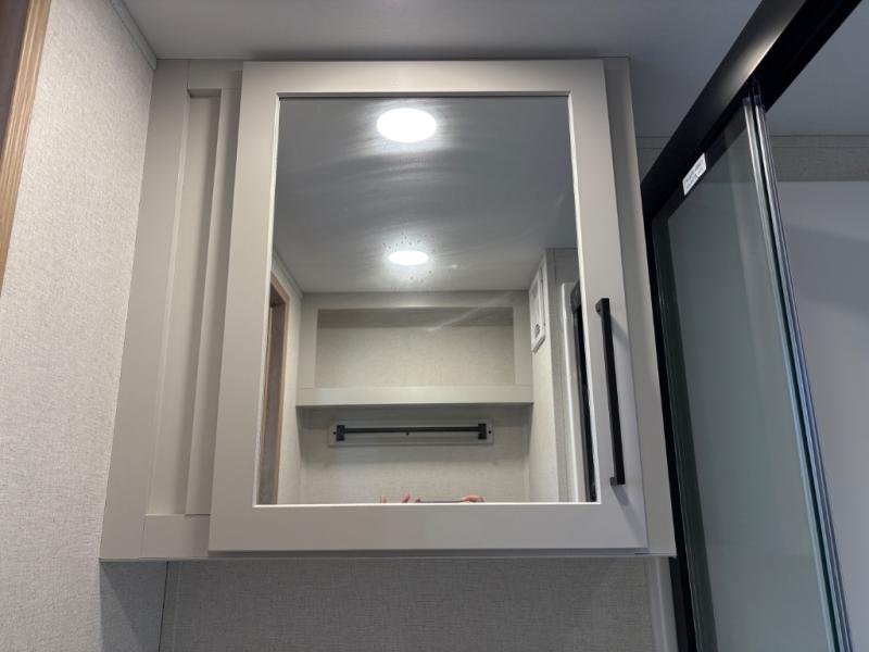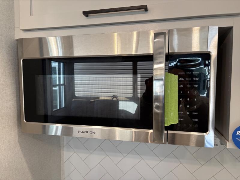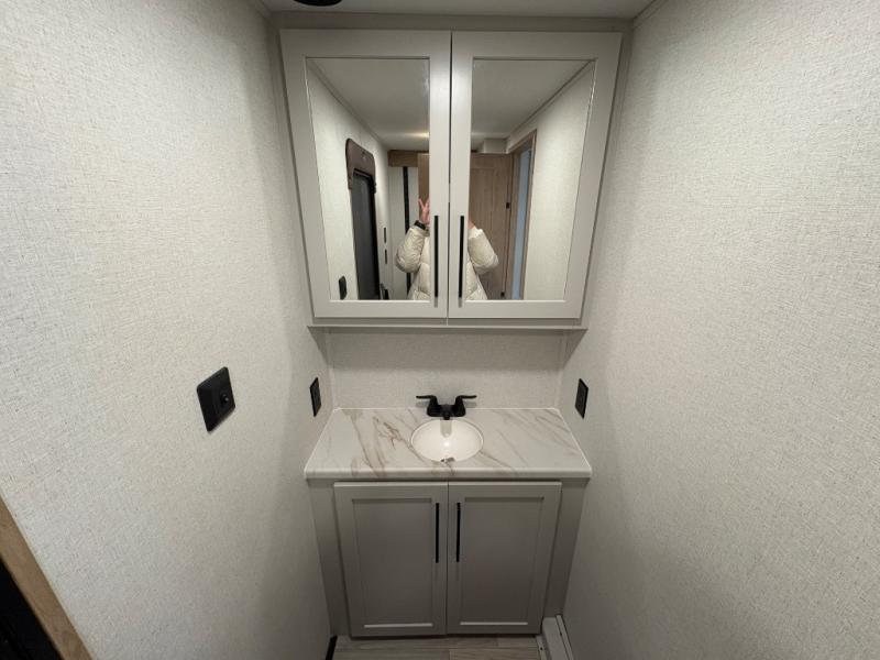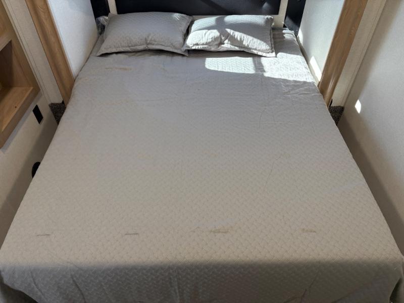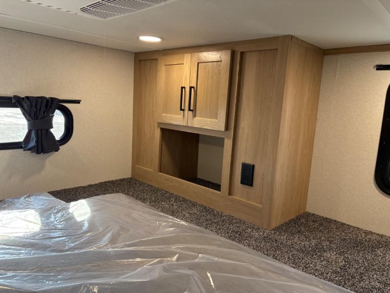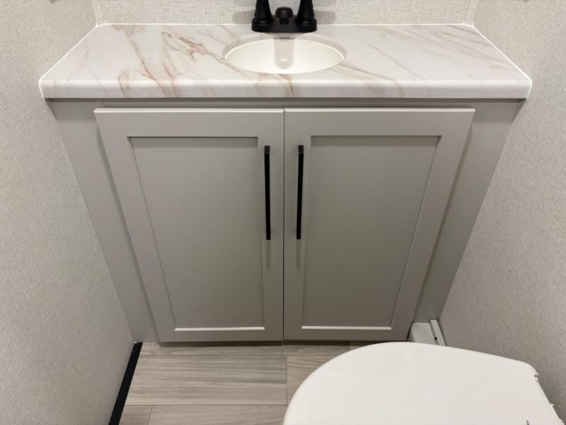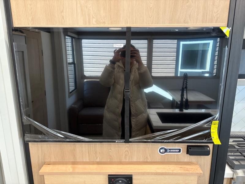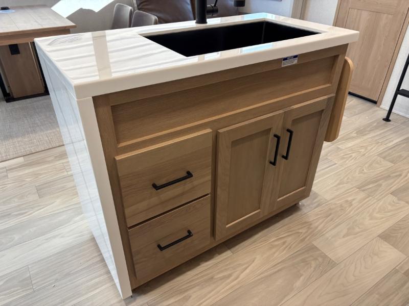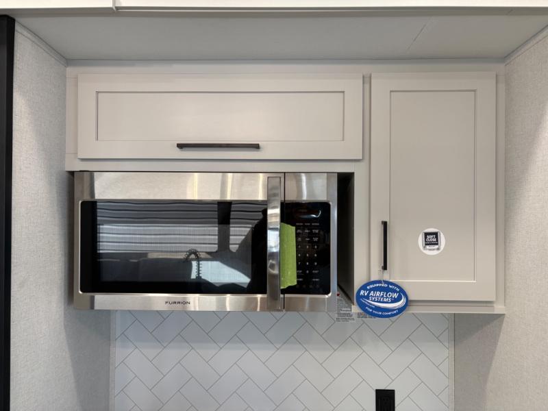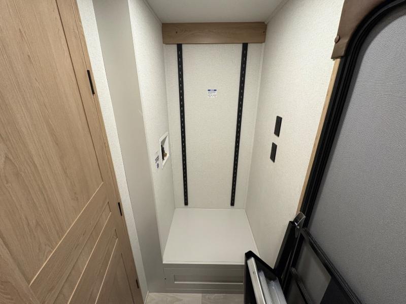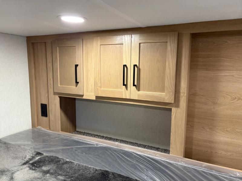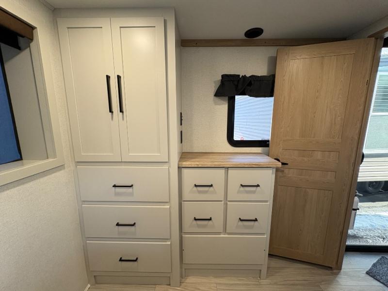 You won't believe the comfort and convenience found in this destination trailer. There are two private bedrooms; one up front with a queen bed slide out and storage space, and one in back with a queen bed slide out and a half bath! There is even washer and dryer prep here if you want to add those appliances and the second entry door is also found in this location so you can easily slip out in the morning. Above each of these rooms is a loft providing three total bunk mats for sleeping, storage cabinets, and TV prep if you want to add entertainment. Everyone can meet in the combined kitchen and living room that includes dual opposing slides, a 60" theater seating across from a 50" flat screen TV and fireplace, plus a free-standing table with chairs and a bench to dine at. The chef of your group will love the large kitchen island, Chef Collection three burner range, and a 16.2 cu. ft. refrigerator for food storage.