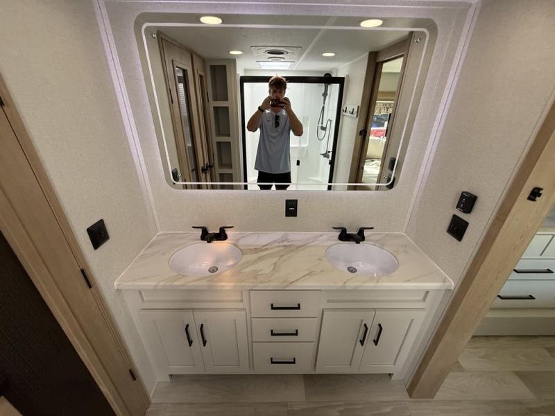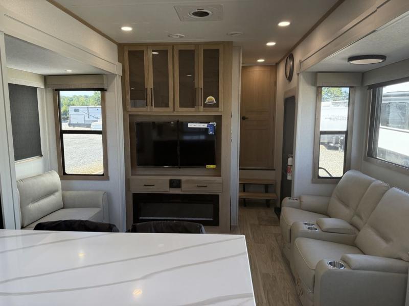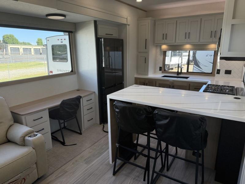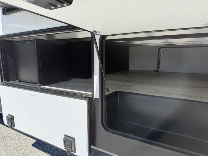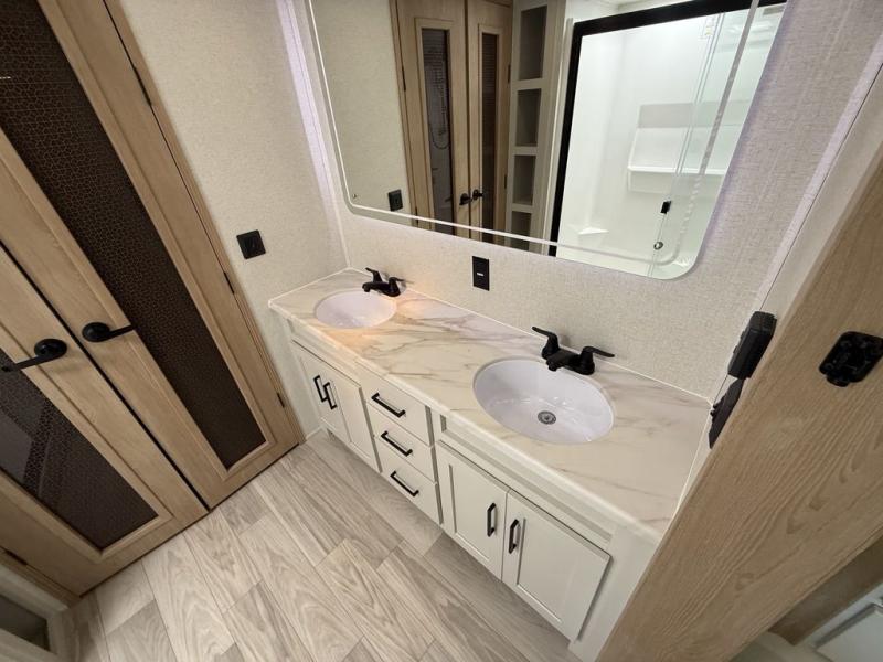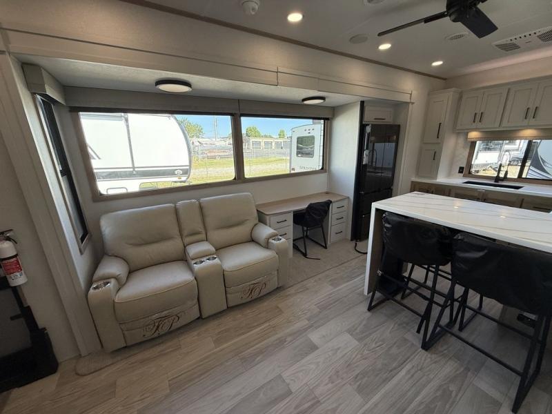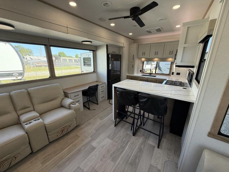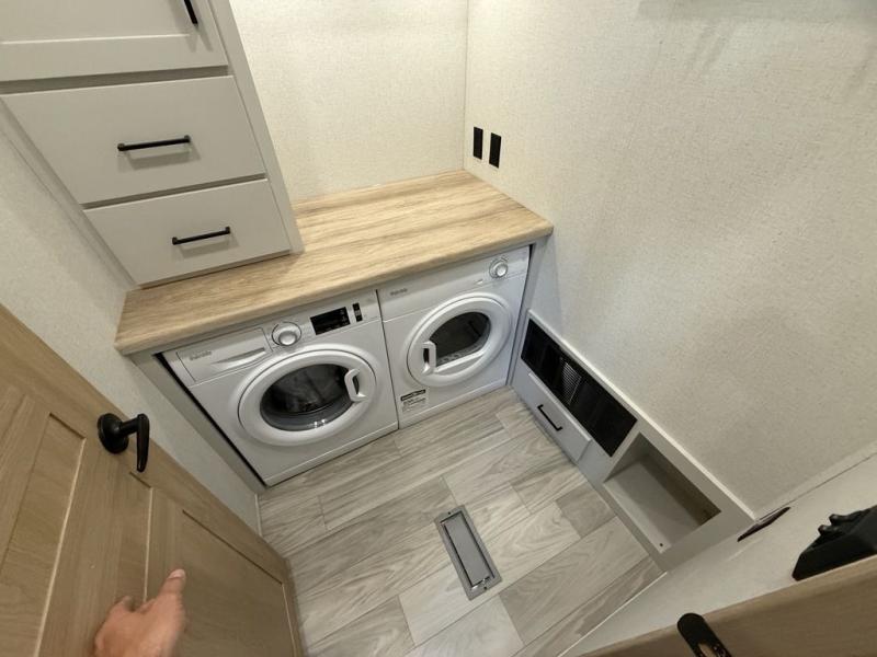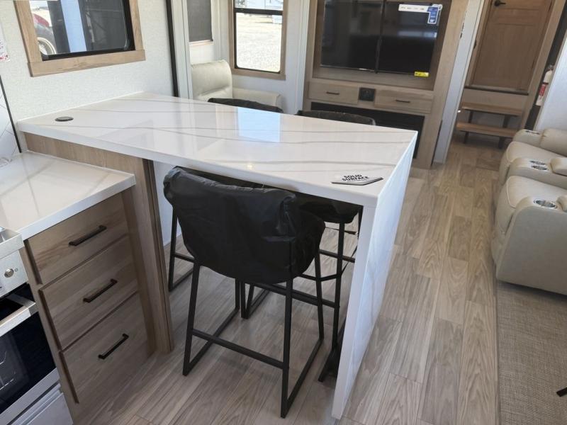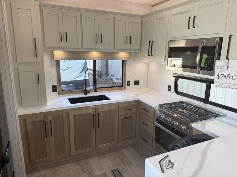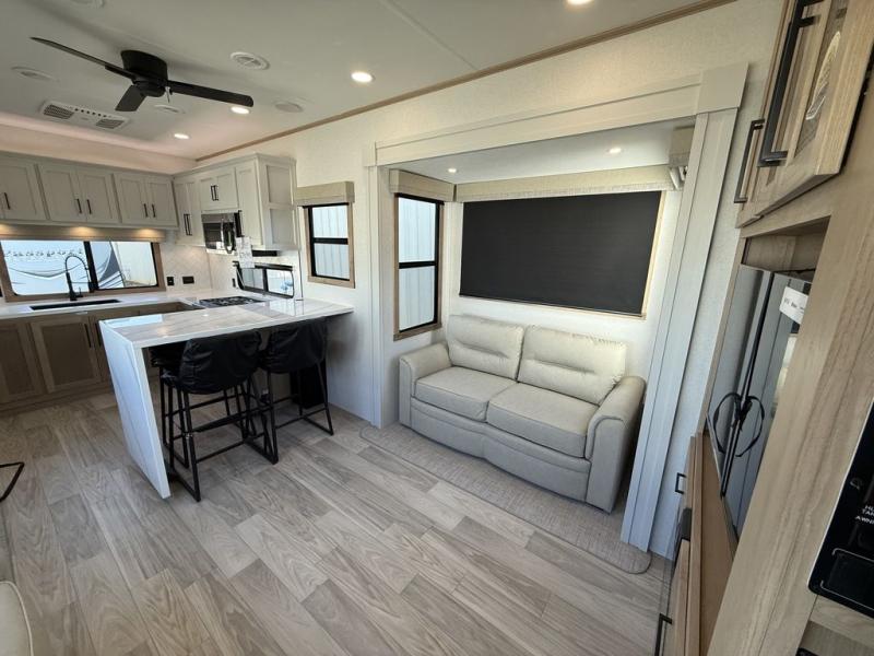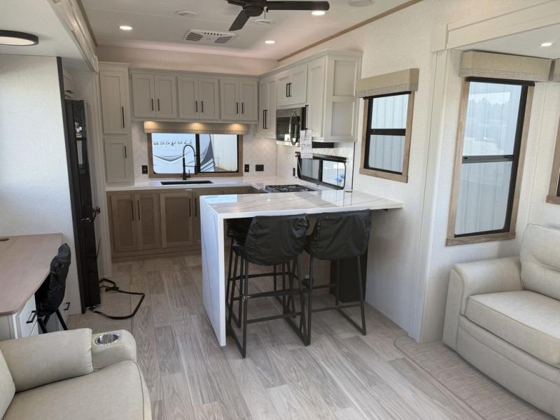 This fifth wheel is packed with convenient features to make your travels more comfortable and enjoyable! The master bedroom includes a king bed slide out with USB ports on either side of the bed so you both can charge your phones, and there is a dresser for your folded clothes. You will love the front bathroom with dual bath sinks, a fiberglass one-piece shower, plus a walk-in closet with shelves and rods to hang clothes! There is a unique middle utility room with washer and dryer prep if you want to add these, a Washer and dryer counter and a rod to hang clothes that will make a perfect laundry room, or you can utilize this space for storage! Head to the main living area to relax on the theater seating or hide-a-bed sofa, and if you have guests stay over, they can sleep here. There is also an entertainment center with a 50" flat screen TV, but you might just leave that off if you're working at the desk with a chair that is provided. We've saved the best part for last, the kitchen! Here, you'll find ample counter space to prep home-cooked meals, a three-burner range with a 24" oven, plus a large counter with barstools where you can enjoy breakfast at each morning. Choosing this fifth wheel is a no-brainer!