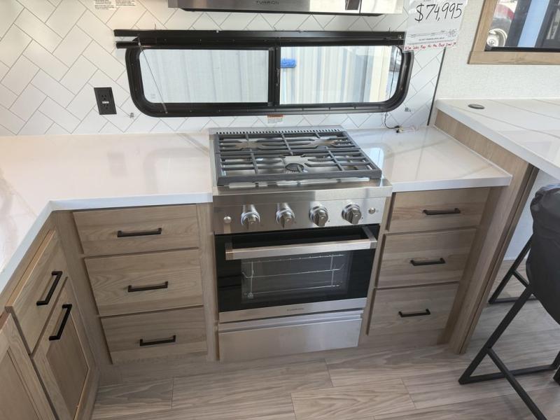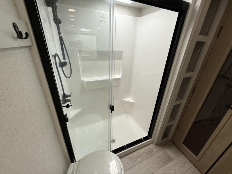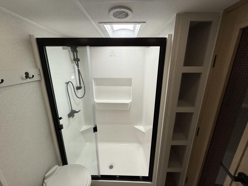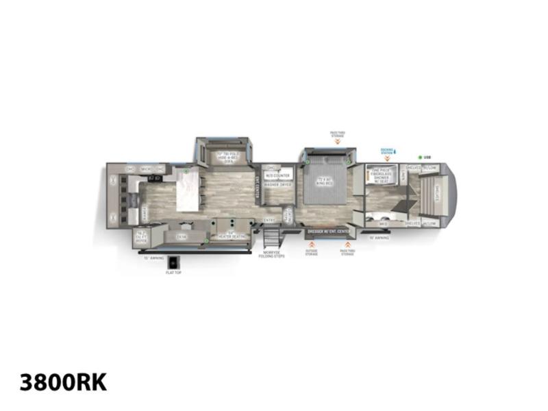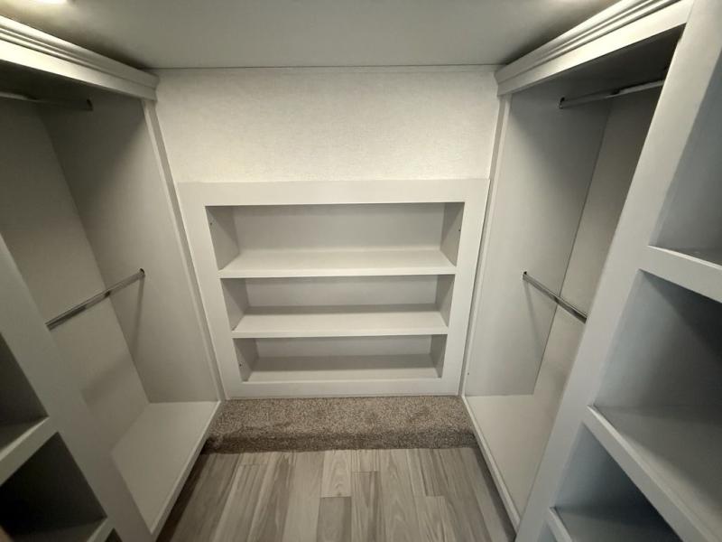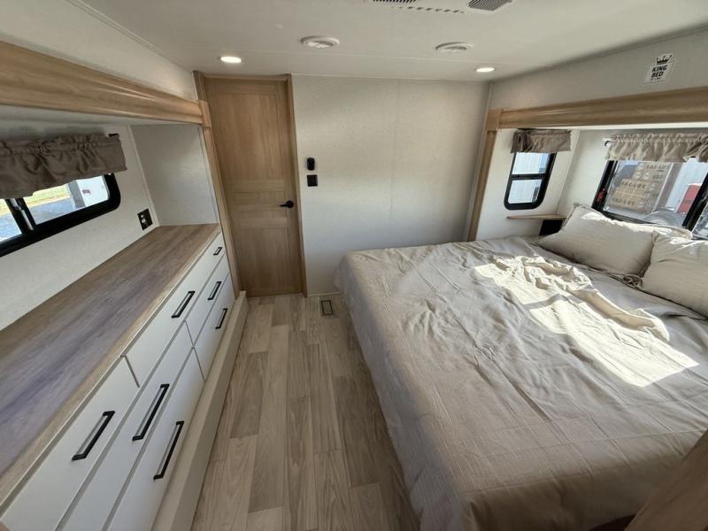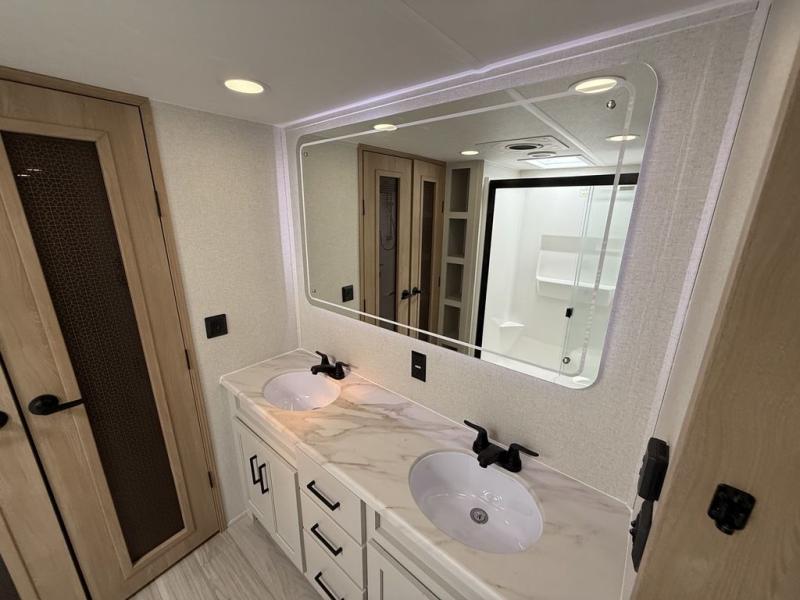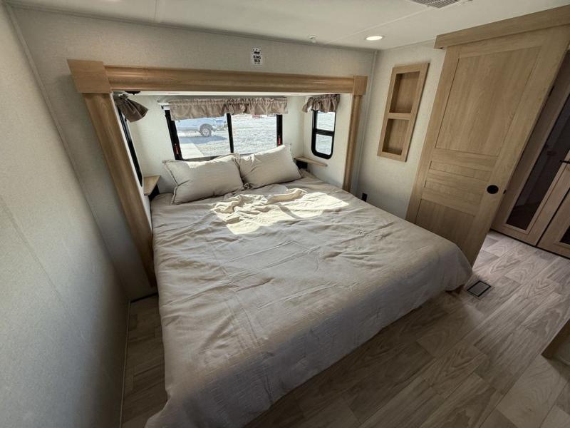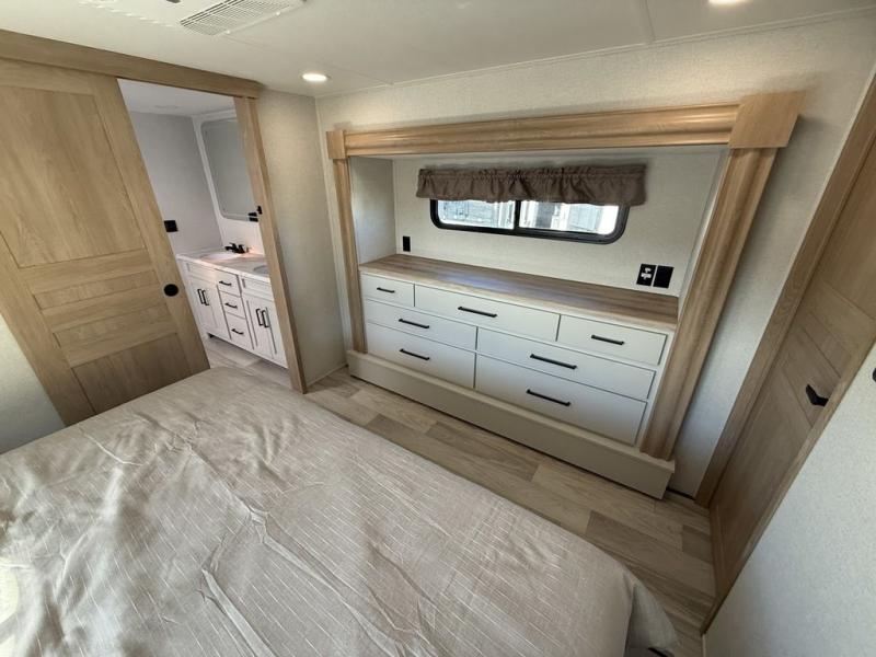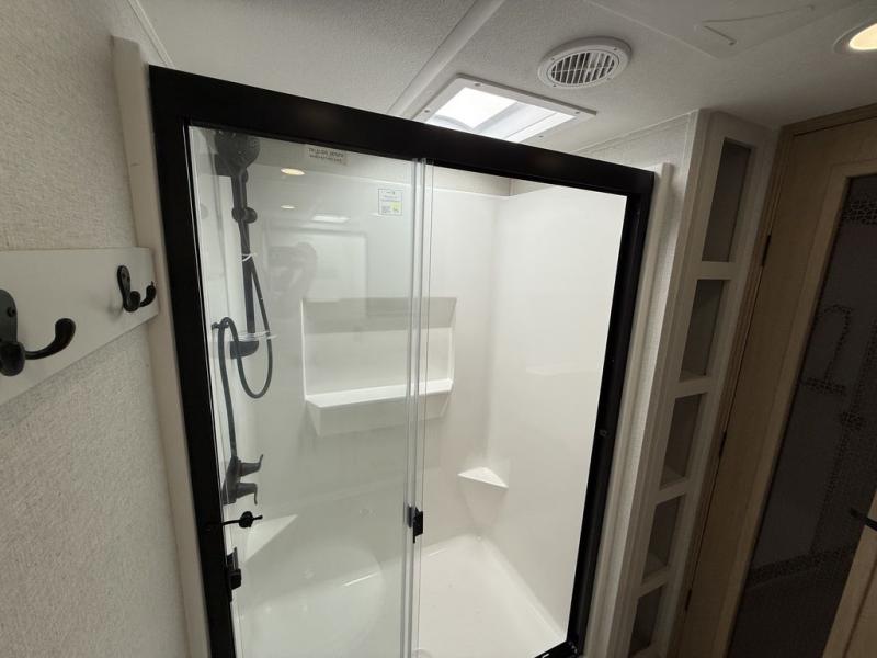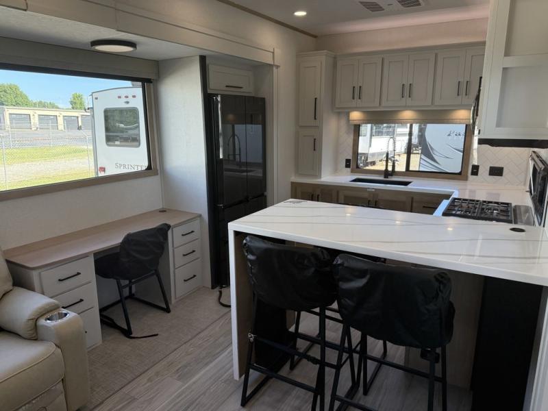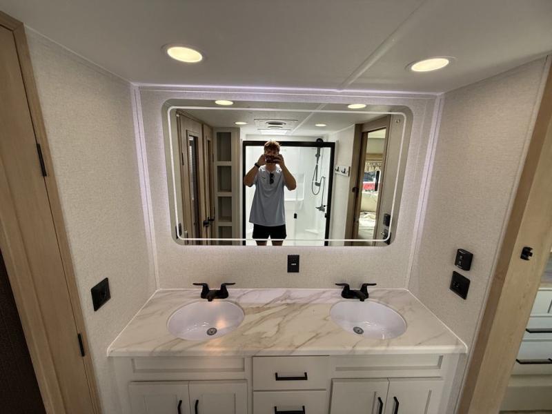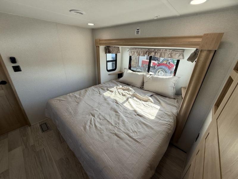 This fifth wheel is packed with convenient features to make your travels more comfortable and enjoyable! The master bedroom includes a king bed slide out with USB ports on either side of the bed so you both can charge your phones, and there is a dresser for your folded clothes. You will love the front bathroom with dual bath sinks, a fiberglass one-piece shower, plus a walk-in closet with shelves and rods to hang clothes! There is a unique middle utility room with washer and dryer prep if you want to add these, a Washer and dryer counter and a rod to hang clothes that will make a perfect laundry room, or you can utilize this space for storage! Head to the main living area to relax on the theater seating or hide-a-bed sofa, and if you have guests stay over, they can sleep here. There is also an entertainment center with a 50" flat screen TV, but you might just leave that off if you're working at the desk with a chair that is provided. We've saved the best part for last, the kitchen! Here, you'll find ample counter space to prep home-cooked meals, a three-burner range with a 24" oven, plus a large counter with barstools where you can enjoy breakfast at each morning. Choosing this fifth wheel is a no-brainer!